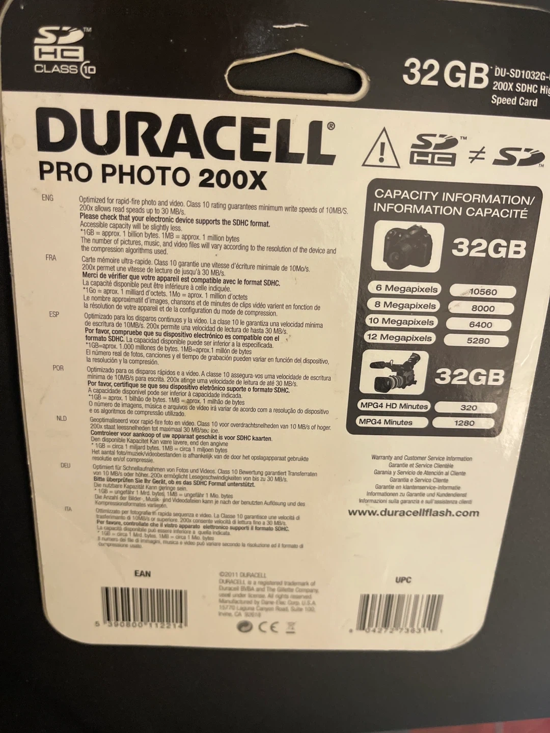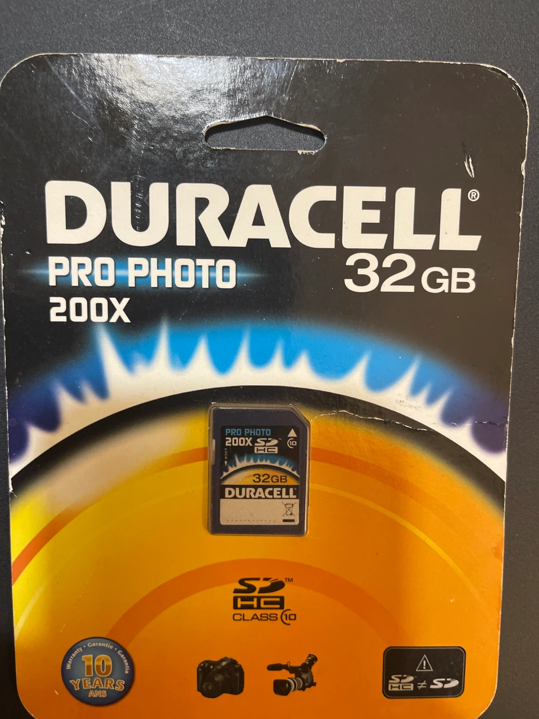 Selling a brand new Duracell Pro Photo 200X 32GB SDHC Class 10 memory card! It's perfect for rapid file photo and video recording. This card ensures minimum write speeds of 10MB/s and allows for speeds up to 30MB/s. The packaging indicates it's suitable for 6 to 12 megapixel cameras and can handle up to 1280 minutes of MPG4 HD video. This is a great deal!