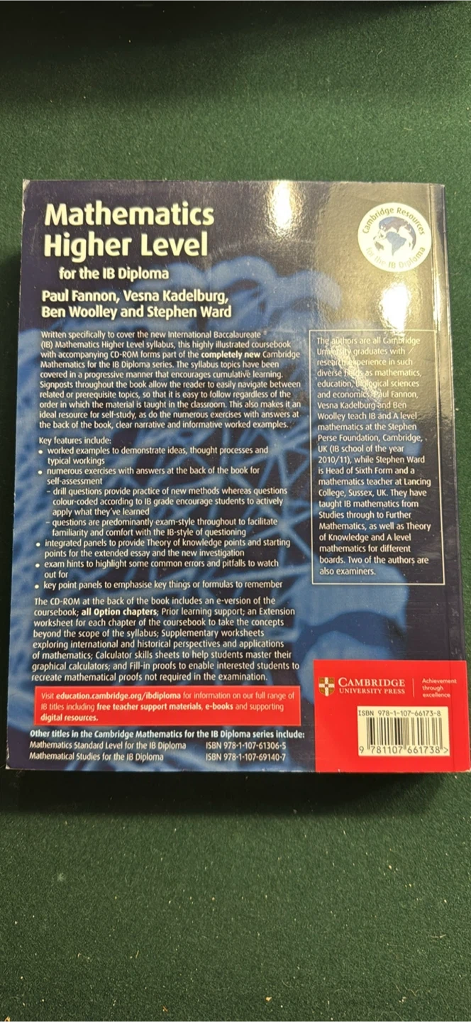 Selling "Mathematics Higher Level for the IB Diploma" by Paul Fannon, Vesna Kadelburg, Ben Woolley, and Stephen Ward. This book is designed to cover the new International Baccalaureate (IB) Mathematics Higher Level syllabus. It includes worked examples, self-assessment questions, and exam hints to highlight common errors and pitfalls