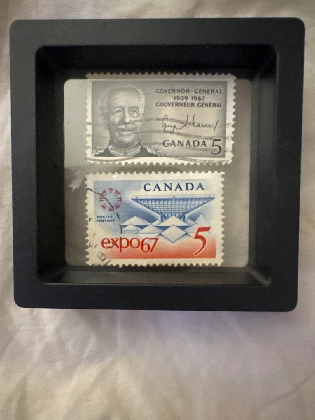 Selling a framed set of Canadian stamps. One stamp commemorates the Governor-General from 1959-1967, and the other is an Expo 67 stamp. Both 5-cent stamps are in good condition for their age.