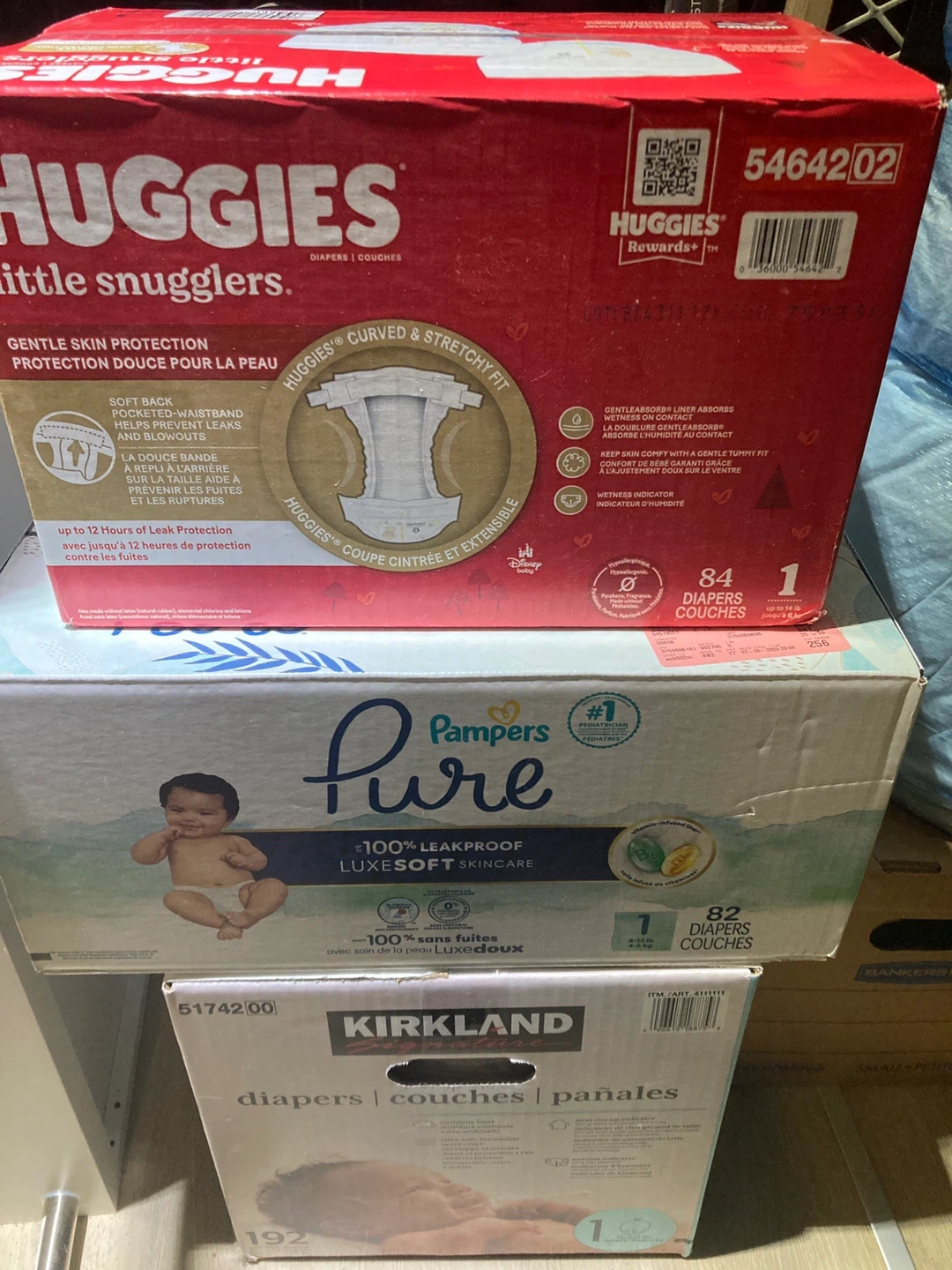 3 unopened boxes (Kirkland $70, Pampers $28, Huggies $27 value)and 2 bags of unused size 1 diapers, total count of 438. Total value is over $140. My baby grew out of them fast! Must be able to pick up near Eglinton W x Weston Rd.
