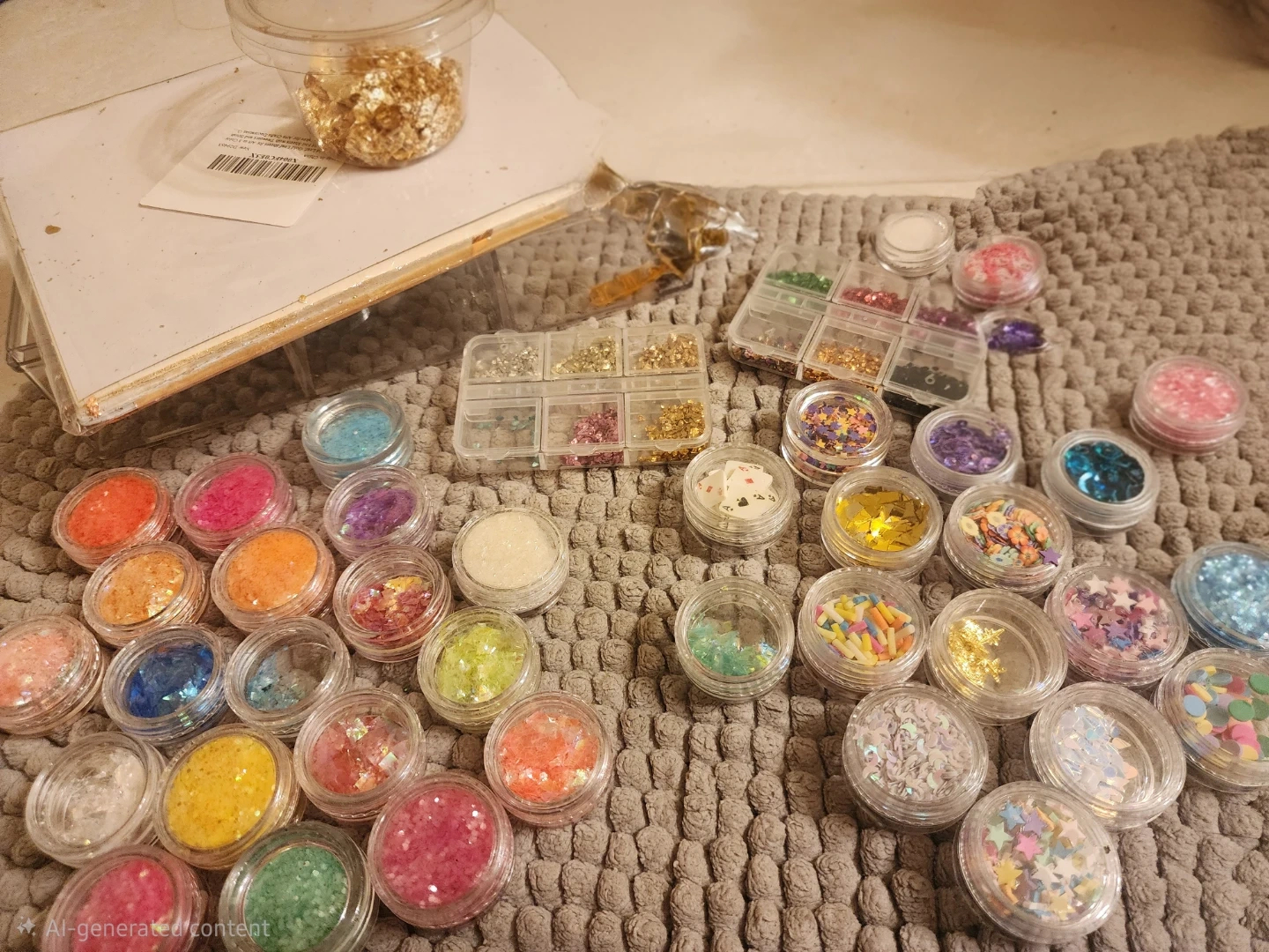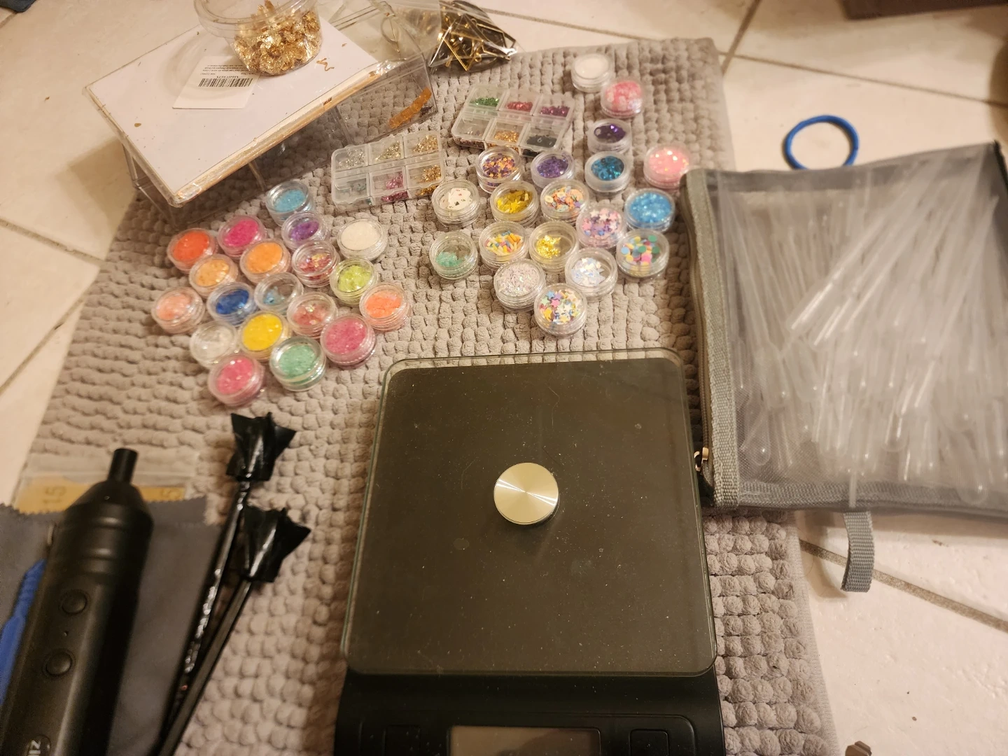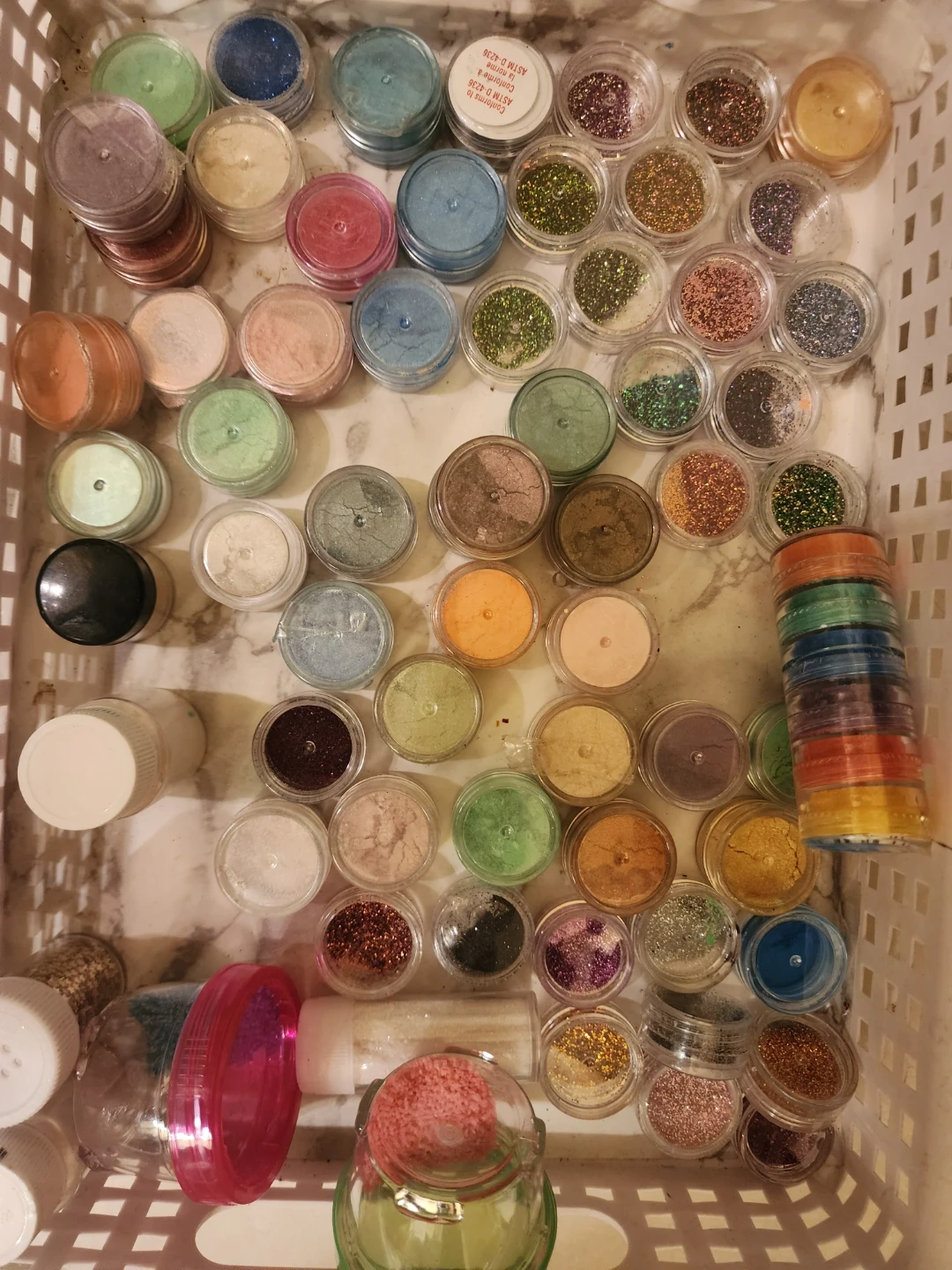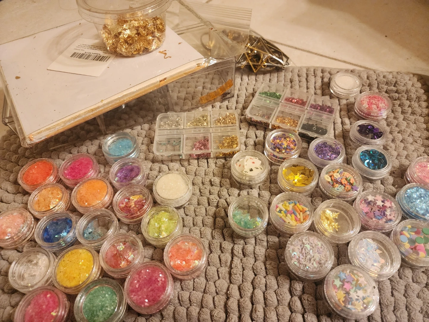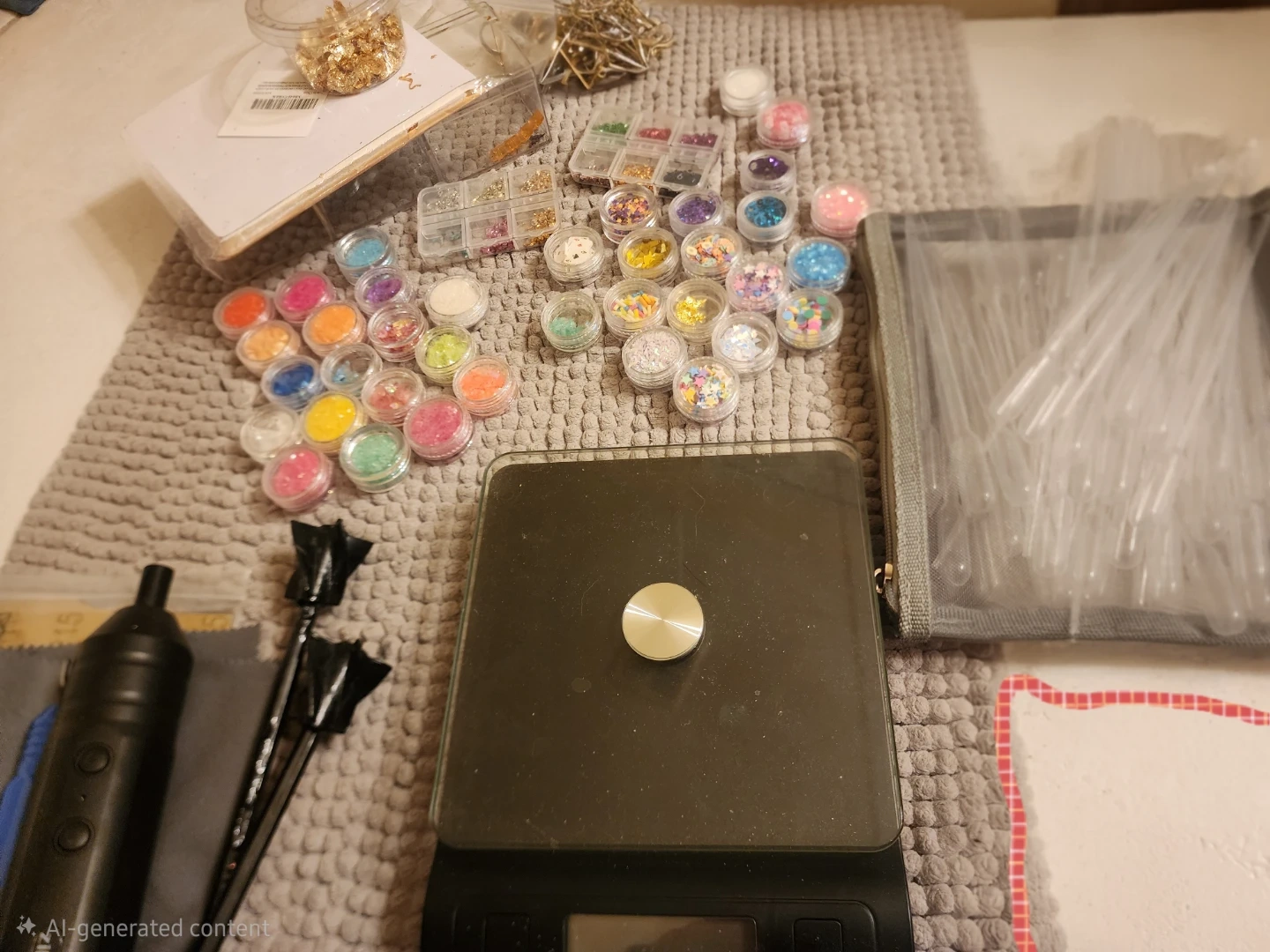 All the supplies and tools needed for epoxy resin crafting. Heat gun, sand paper (300-7000grit) battery mixer, scale, chameleon powder, mica powders, gold foil (100 pages) colored foil, assorted bits to decorate resin, dried flowers