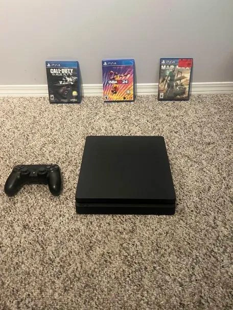 I am selling a barely used PS4 Slim, I bought this in October of 2023 to play games in my free time but due to me being in 12th grade at the time I barely used it. I forgot about it and now that I found it I am choosing to sell it to make some extra cash before winter semester. what you will get is a Playstation 4 console with its power cord, 3 games and one controller with a charging cord. The console is in perfect condition other than it being a little dusty due to it being kept in a closet. (exterior and controller cleaned before pickup.)
