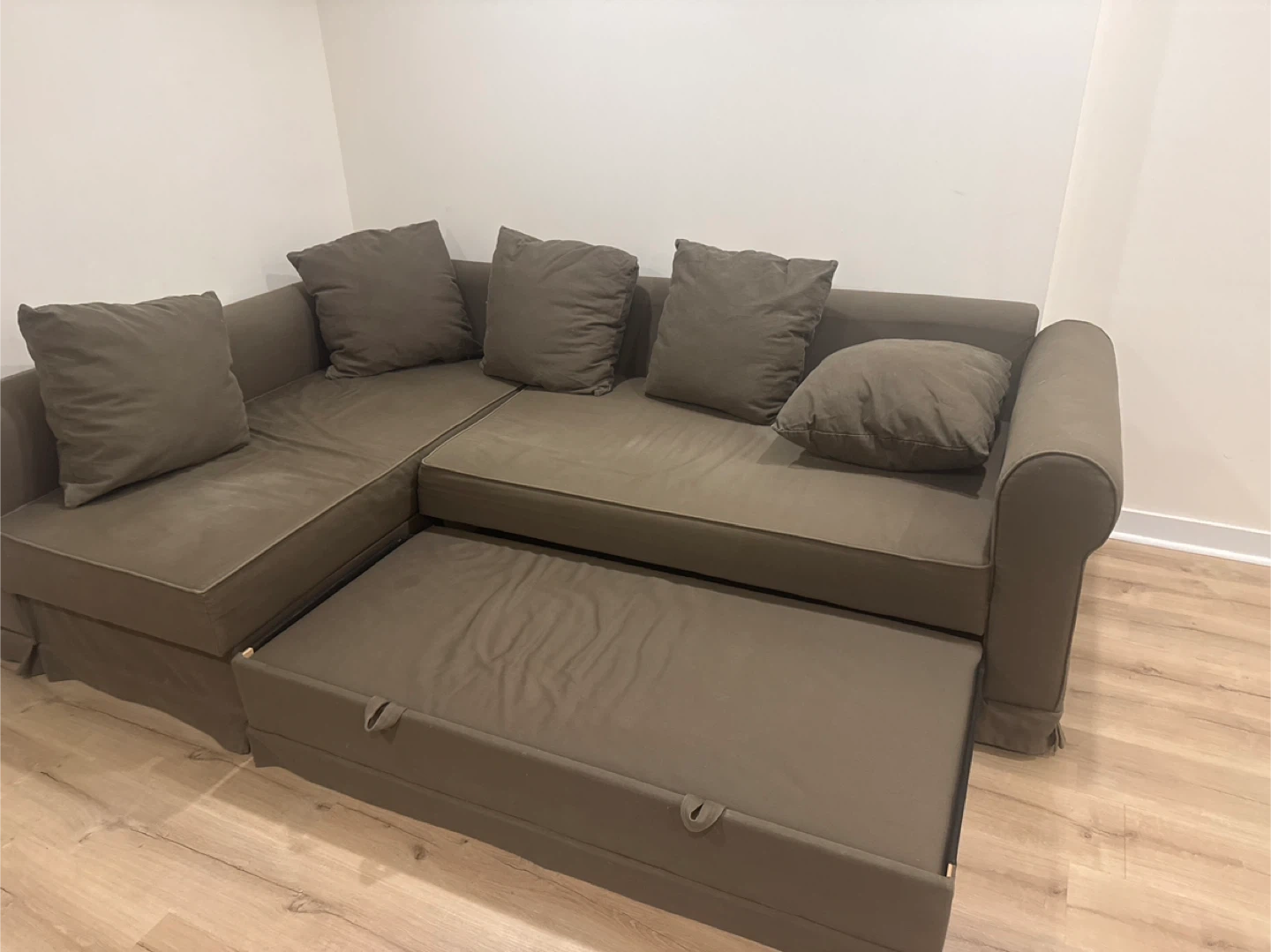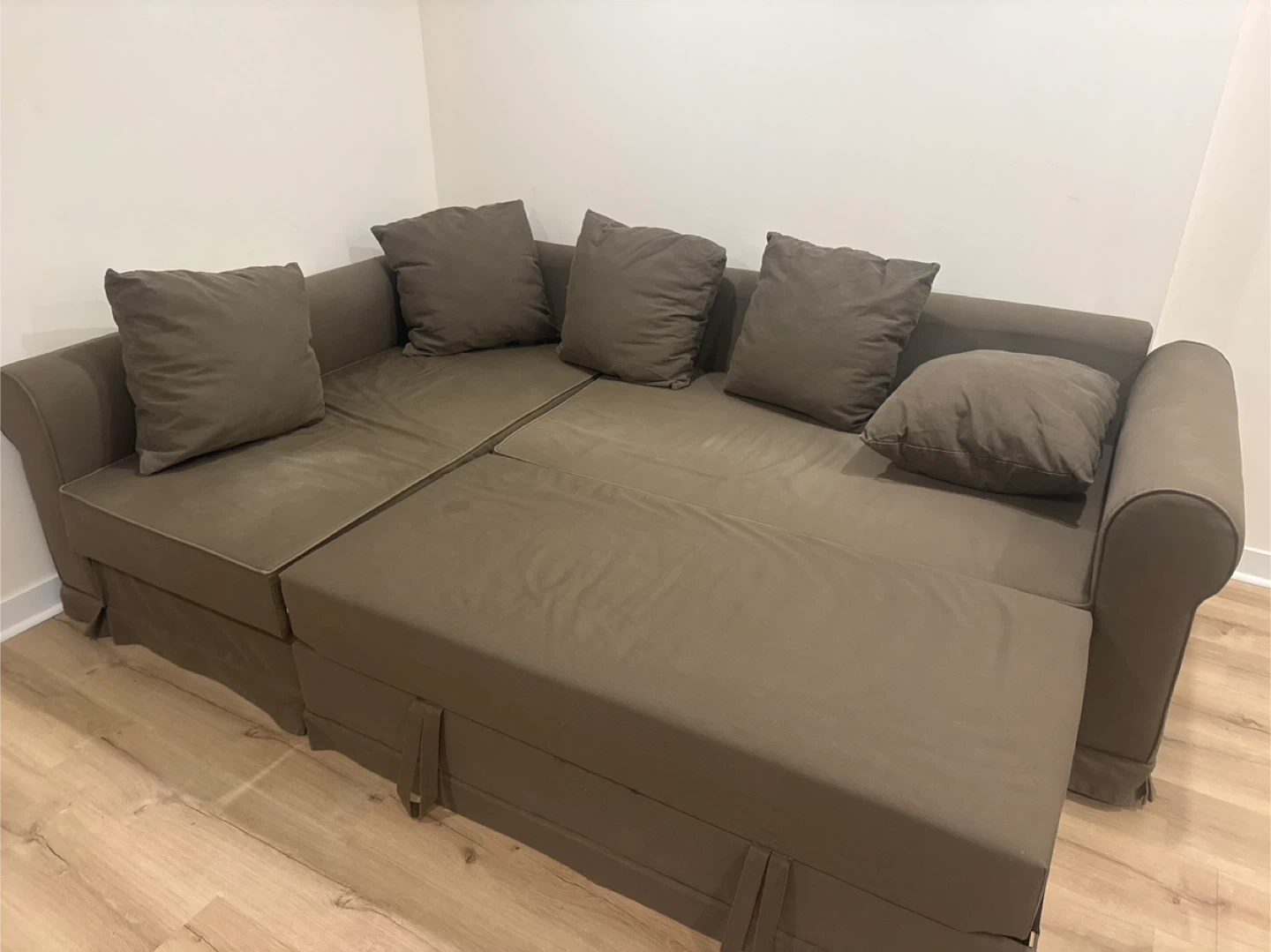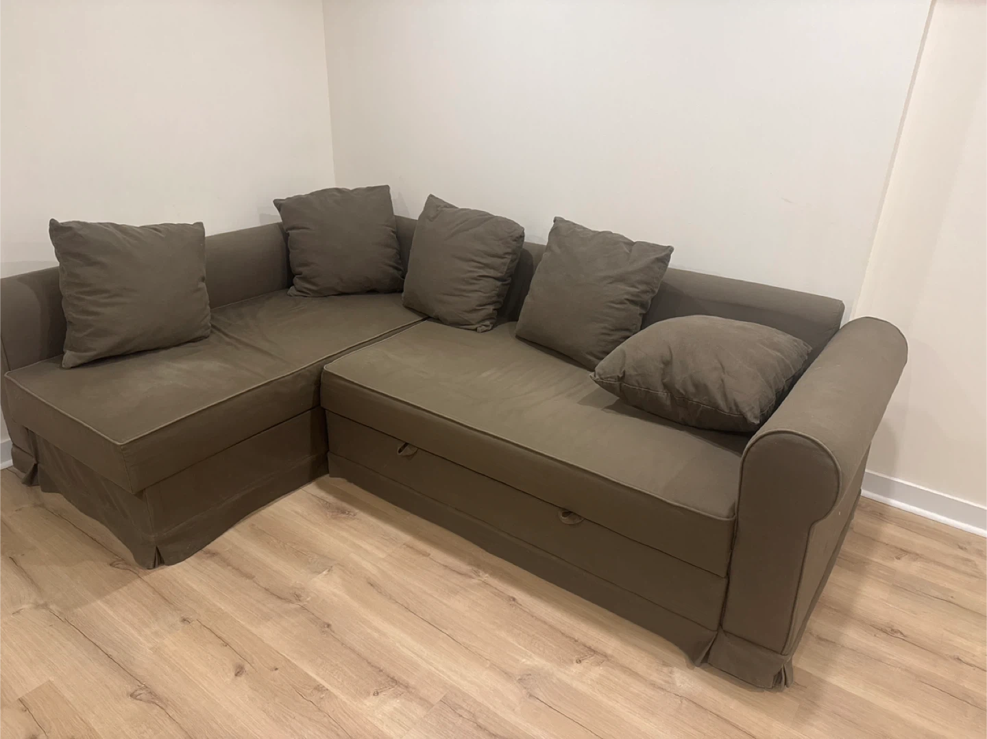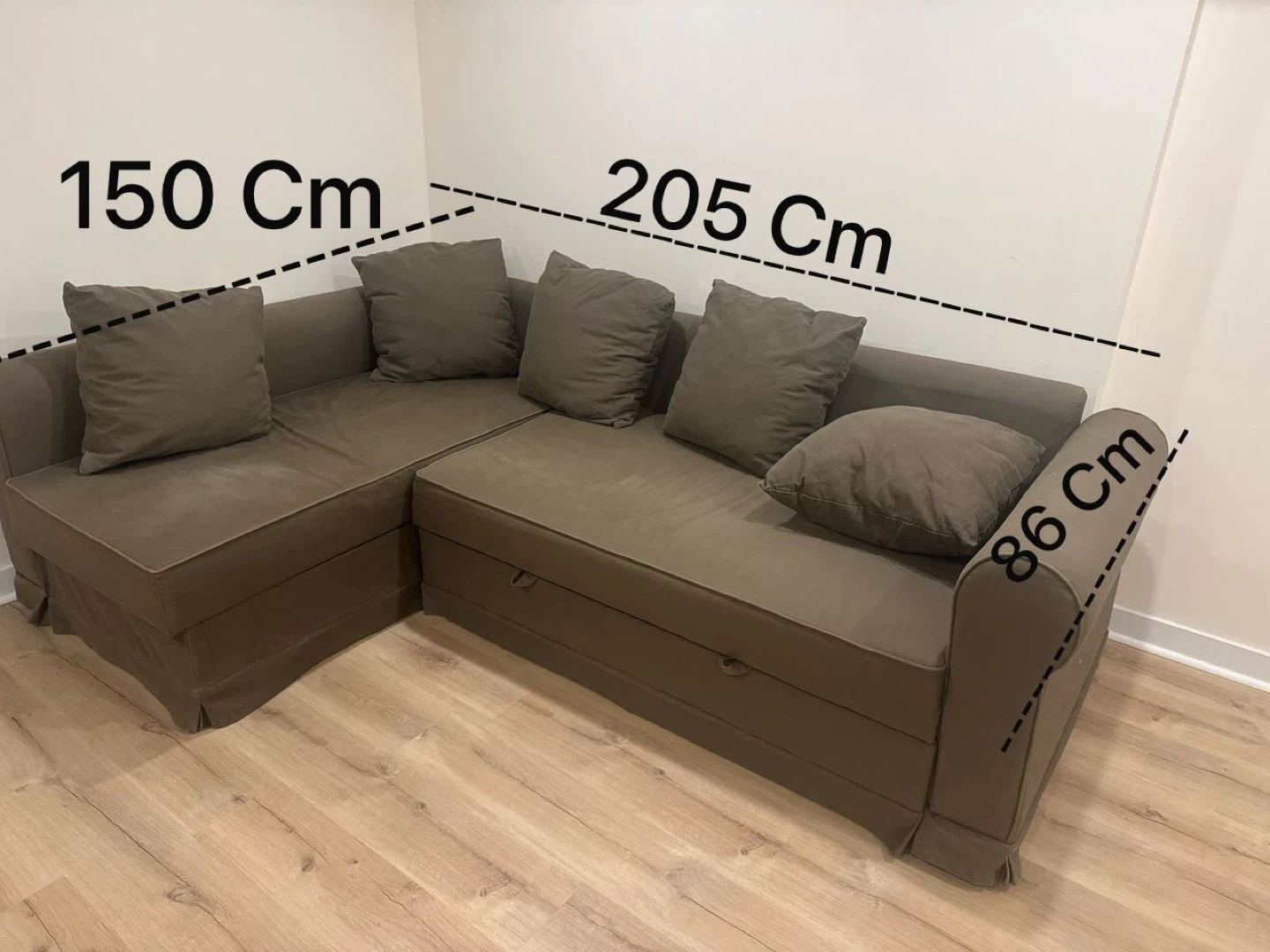 Selling a brown sectional sofa bed. It features a pull-out bed and storage underneath. The dimensions are approximately 150 cm x 205 cm x 86 cm. It's a comfy piece for any living space!