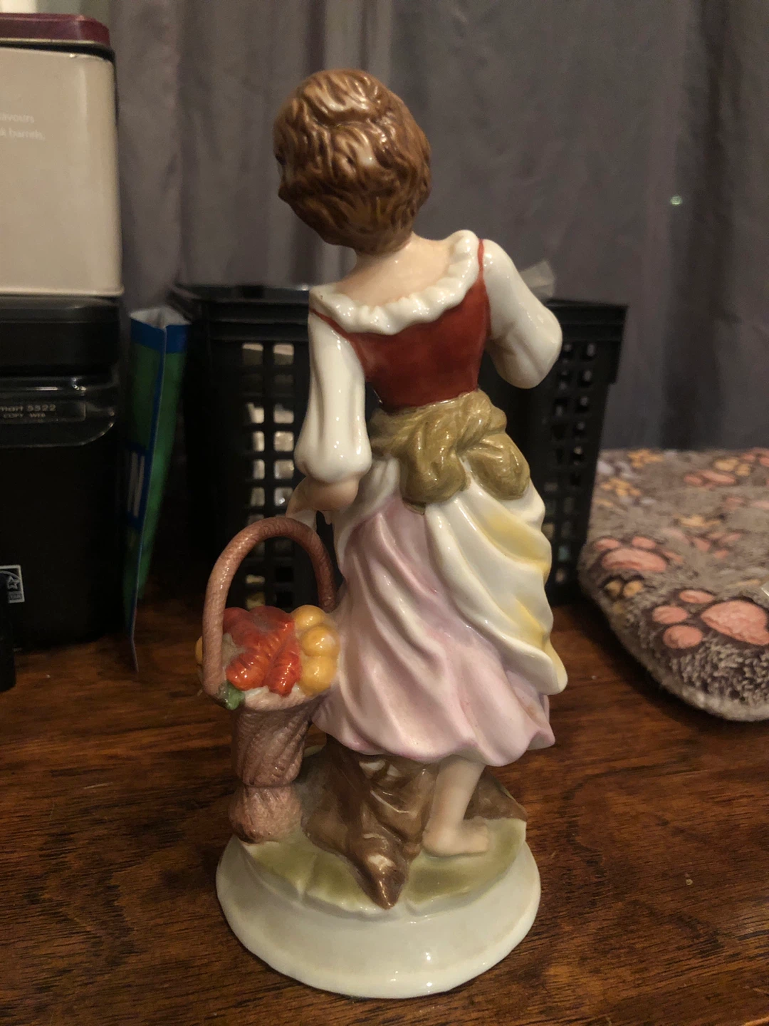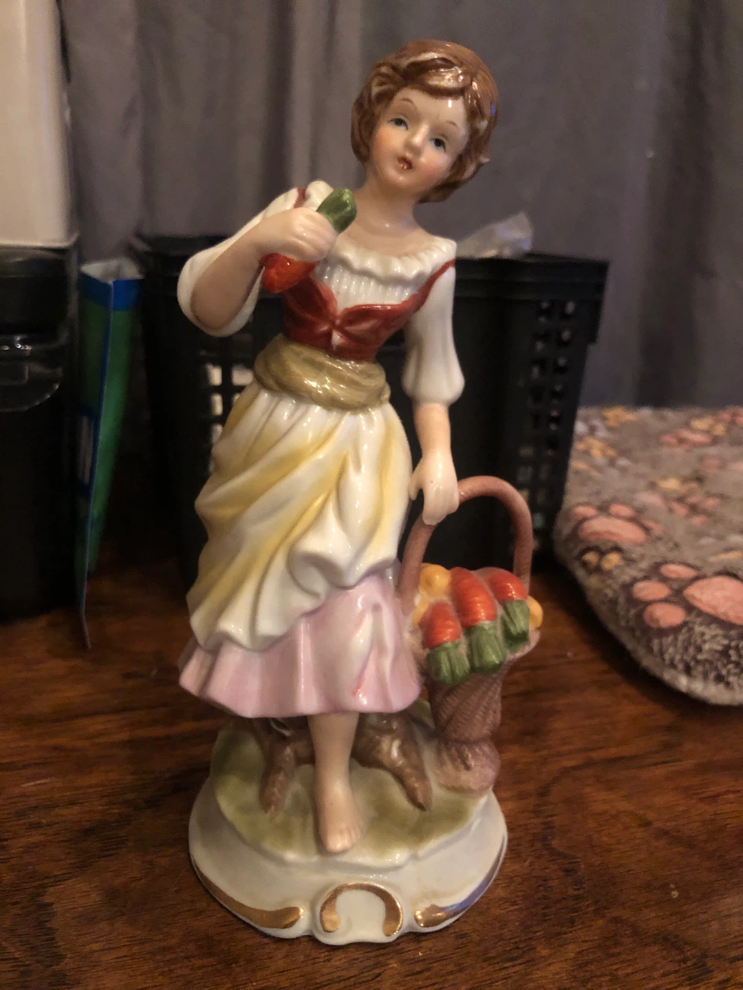 Here's a charming vintage porcelain figurine. It features a woman carrying a basket of carrots . It has lovely details and colours, perfect for adding a touch of vintage charm to your home