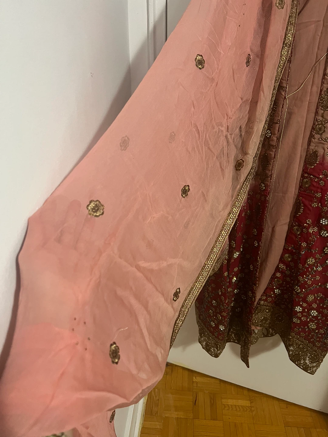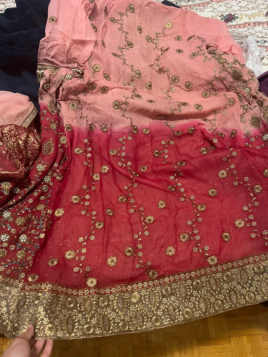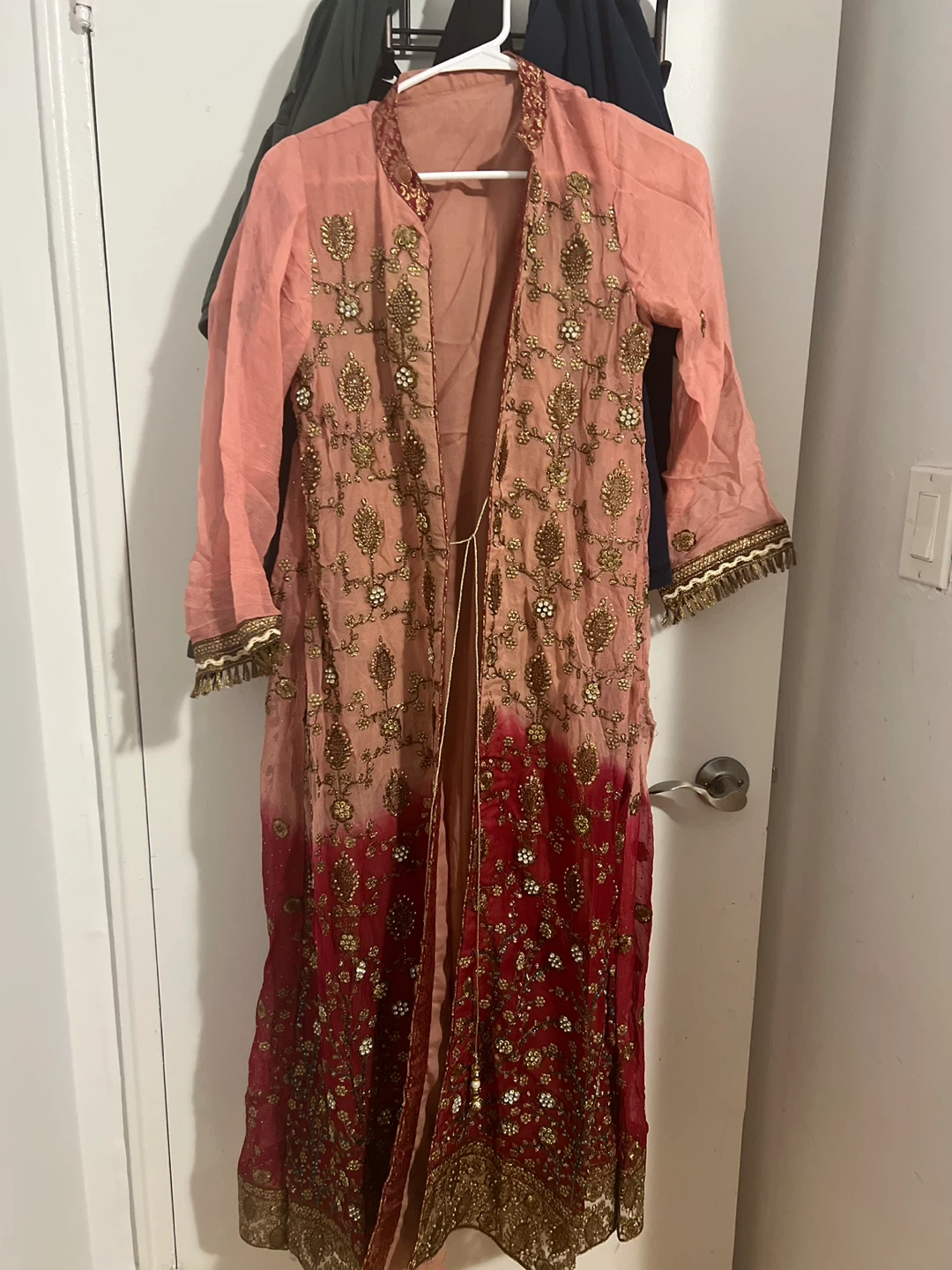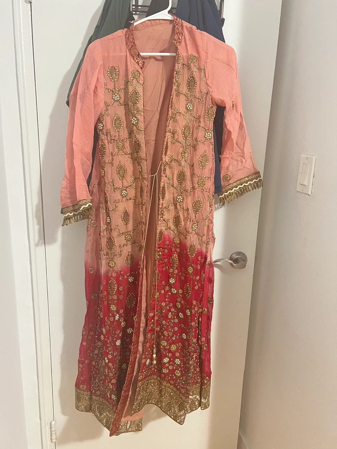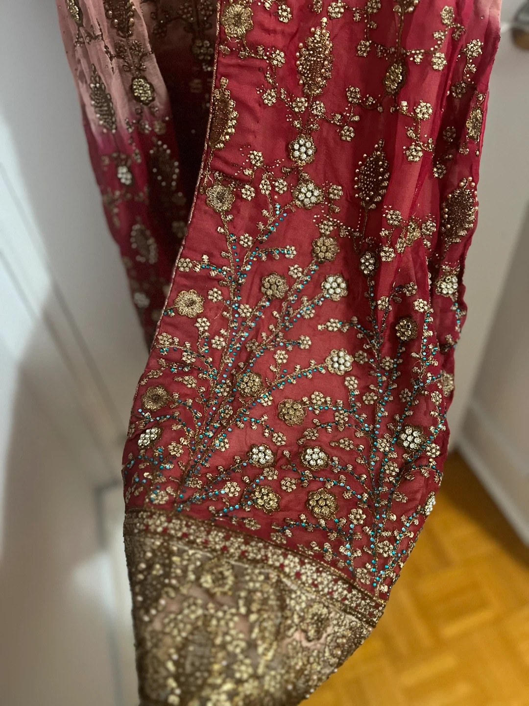 4 piece - Beautiful suit in a lovely pink and red ombre! The fabric is adorned with intricate gold embroidery and beadwork. Perfect for a special occasion or cultural event