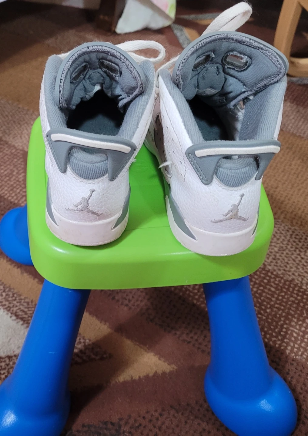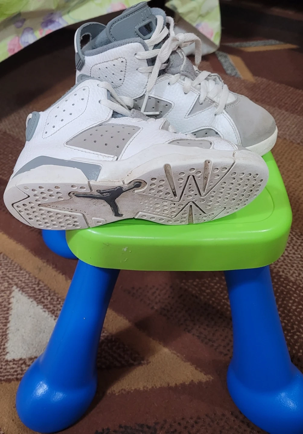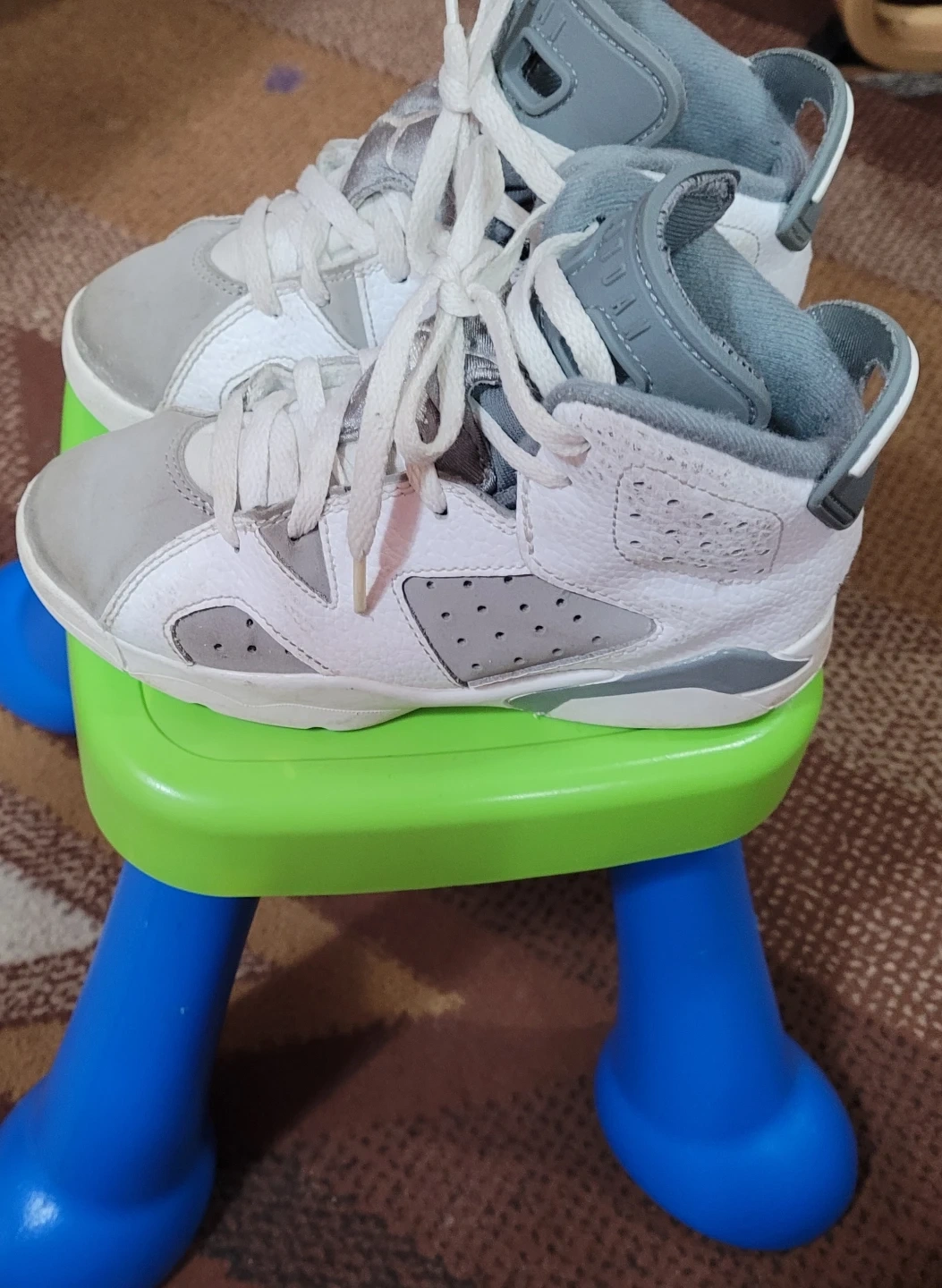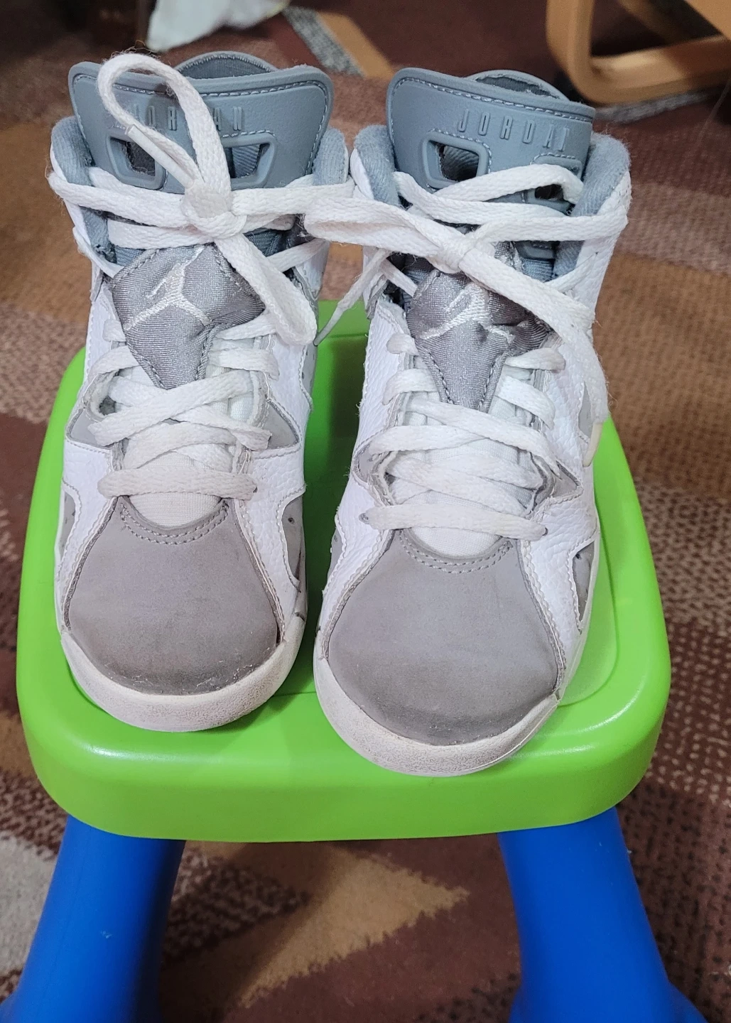Selling a pair of Jordan 6 Retro toddler shoes in white and grey. They show some signs of wear but still have lots of life left!