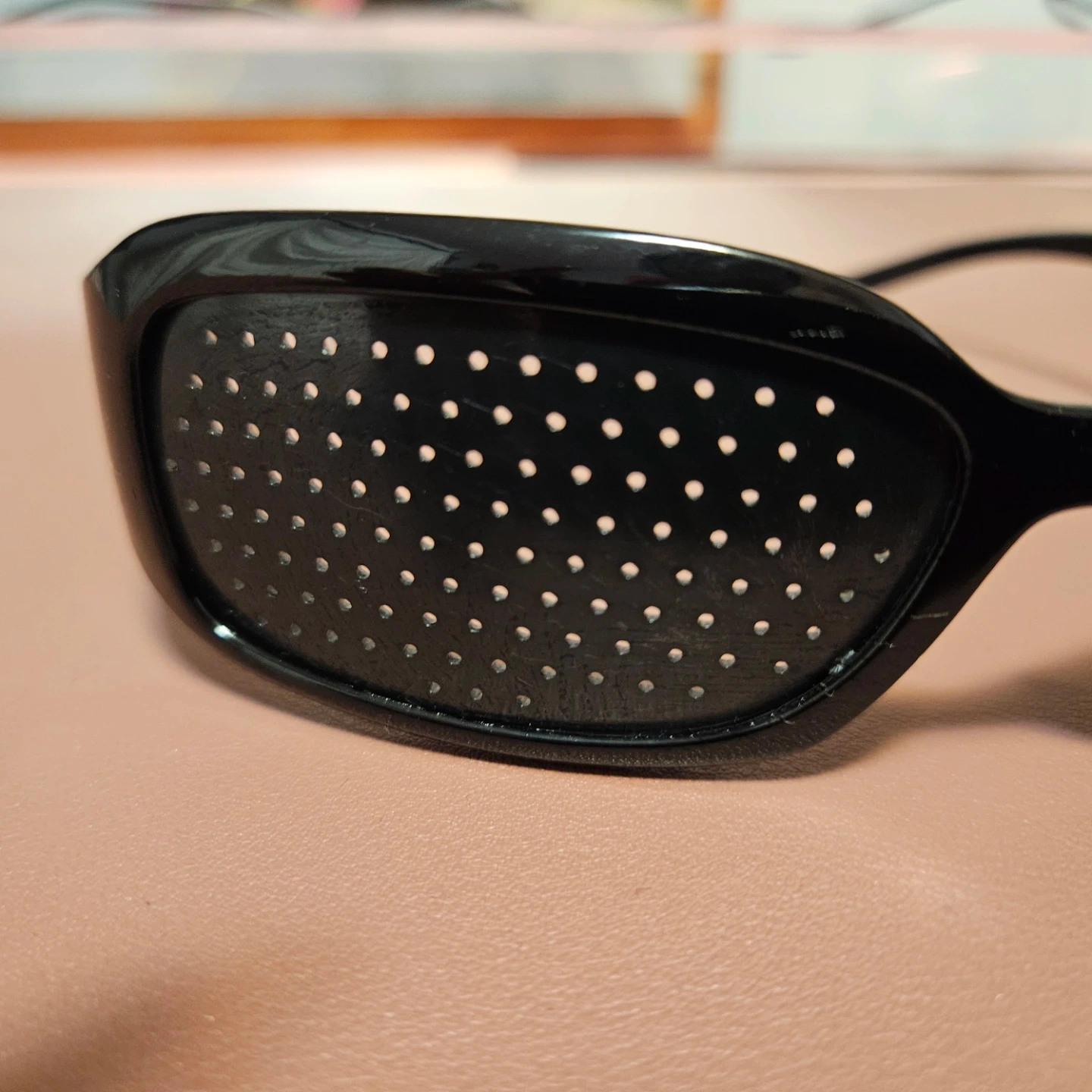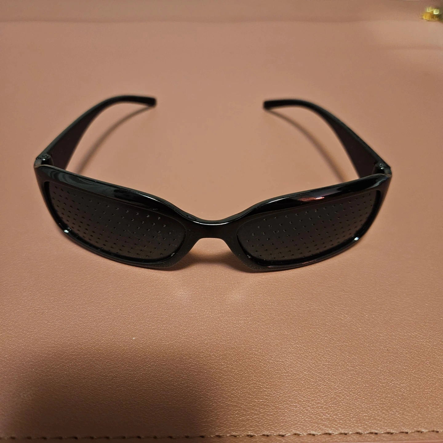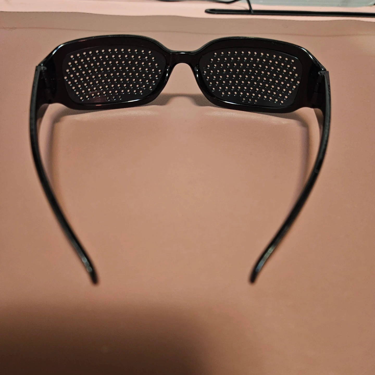 These pinhole glasses are designed to improve vision by focusing light through small holes, reducing blurriness and strain on the eyes. They are in great condition and ready for a new owner. Perfect for short-sightedness and eye strain!
