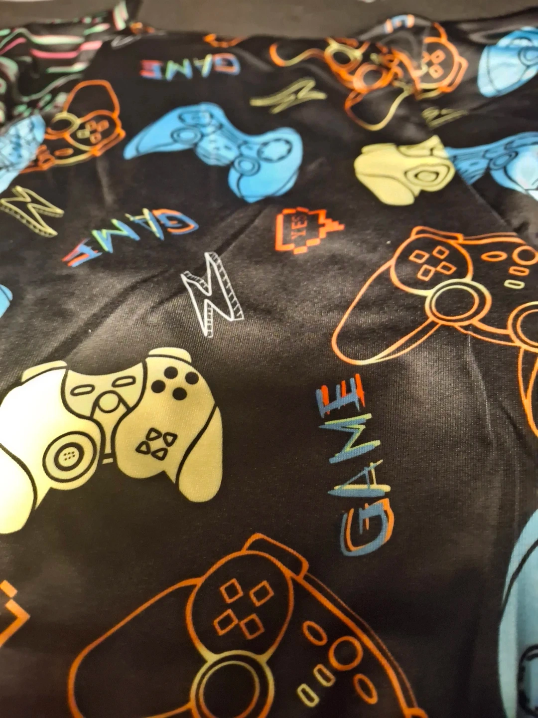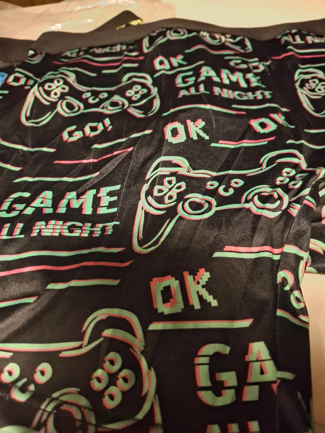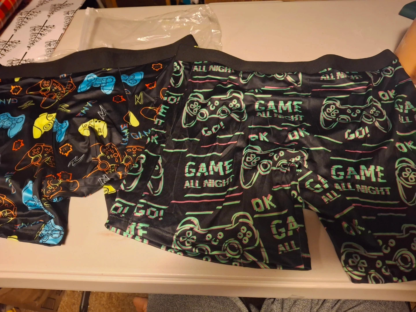 Two pairs of boxer briefs, size XL! One pair has a fun 'Game All Night' print, and the other has a colourful video game controller pattern. They're made of 95% polyester and 5% elastane. THERE IS NO CROTCH HOLE.