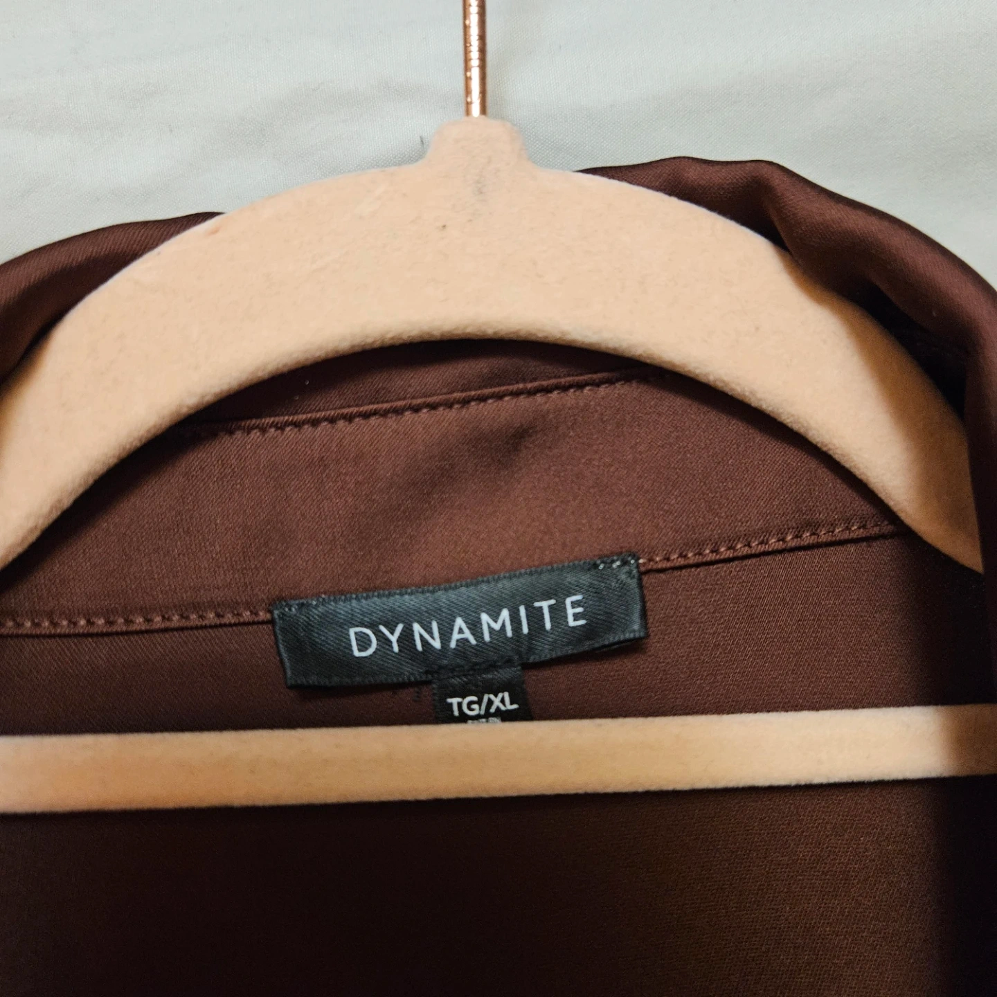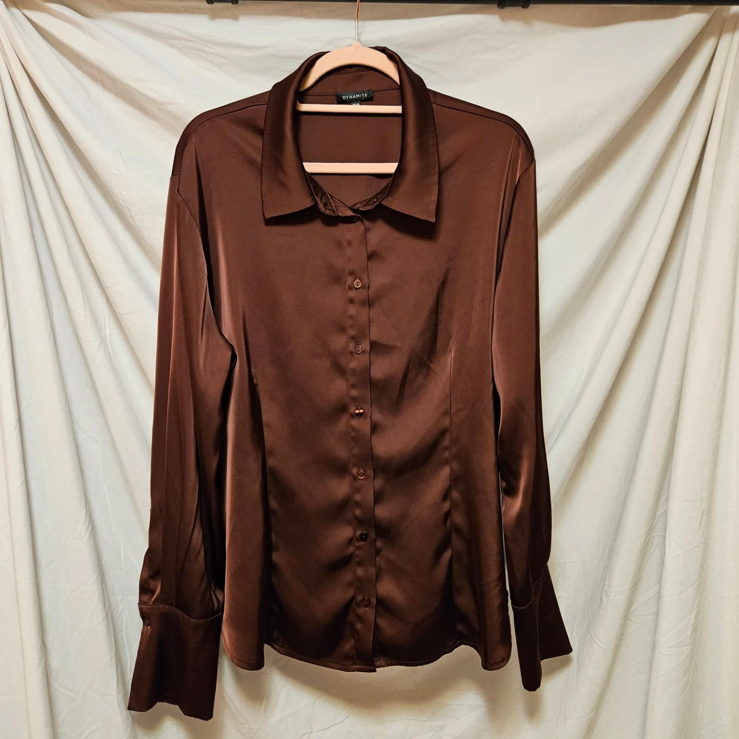 Here's a beautiful brown button down dress satin blouse from Dynamite! It's a size XL and made of 67% polyester, 30% recycled polyester, and 3% spandex. A great addition to any wardrobe!