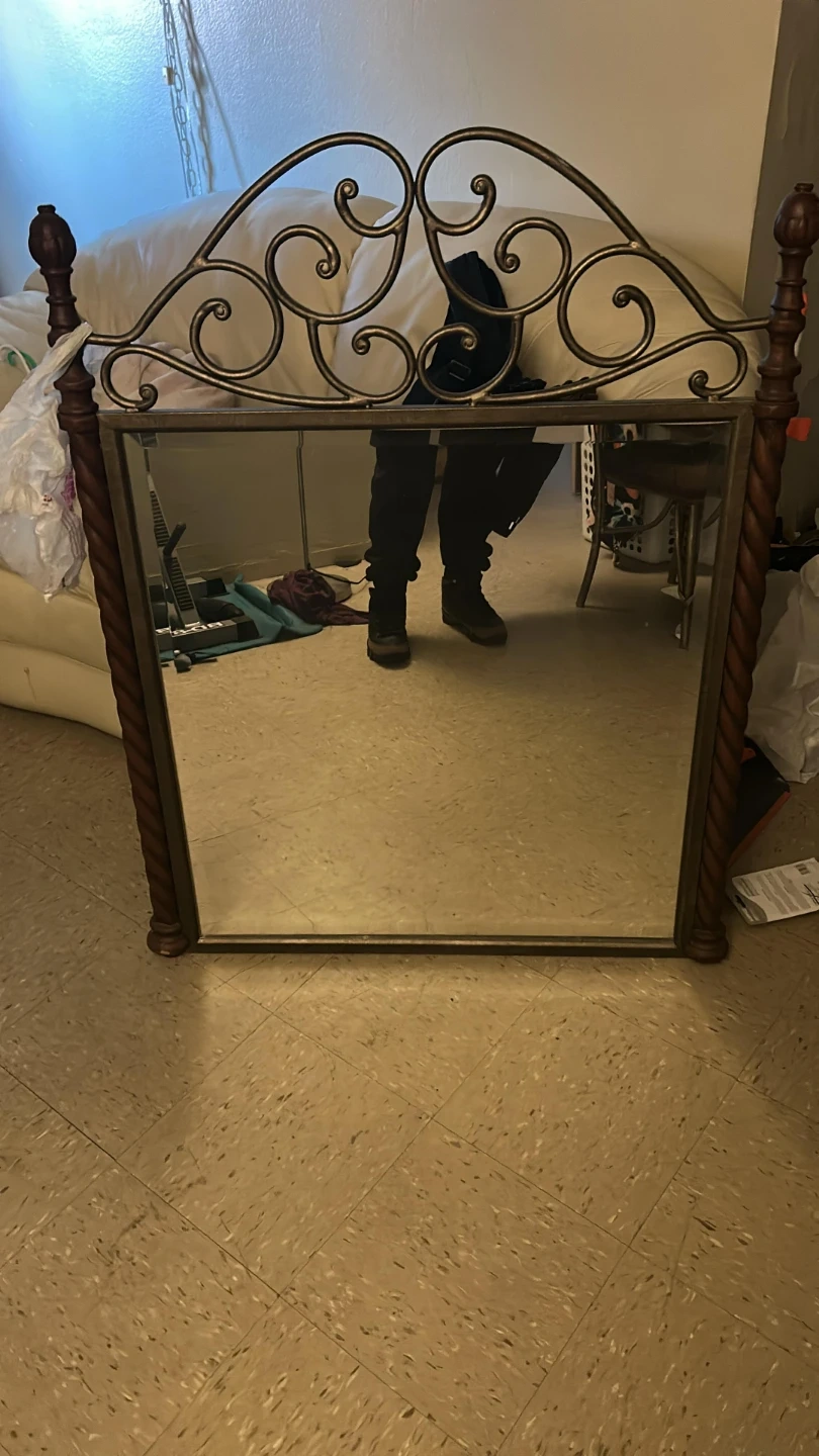 Selling a lovely mirror with an ornate frame. The frame is a dark wood color with a decorative metal design at the top. It's a great piece to add a touch of elegance to any room!