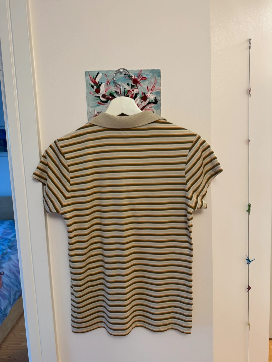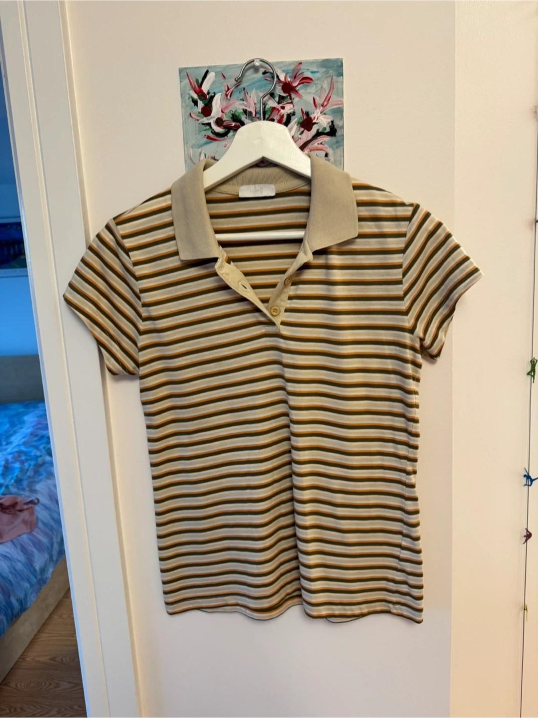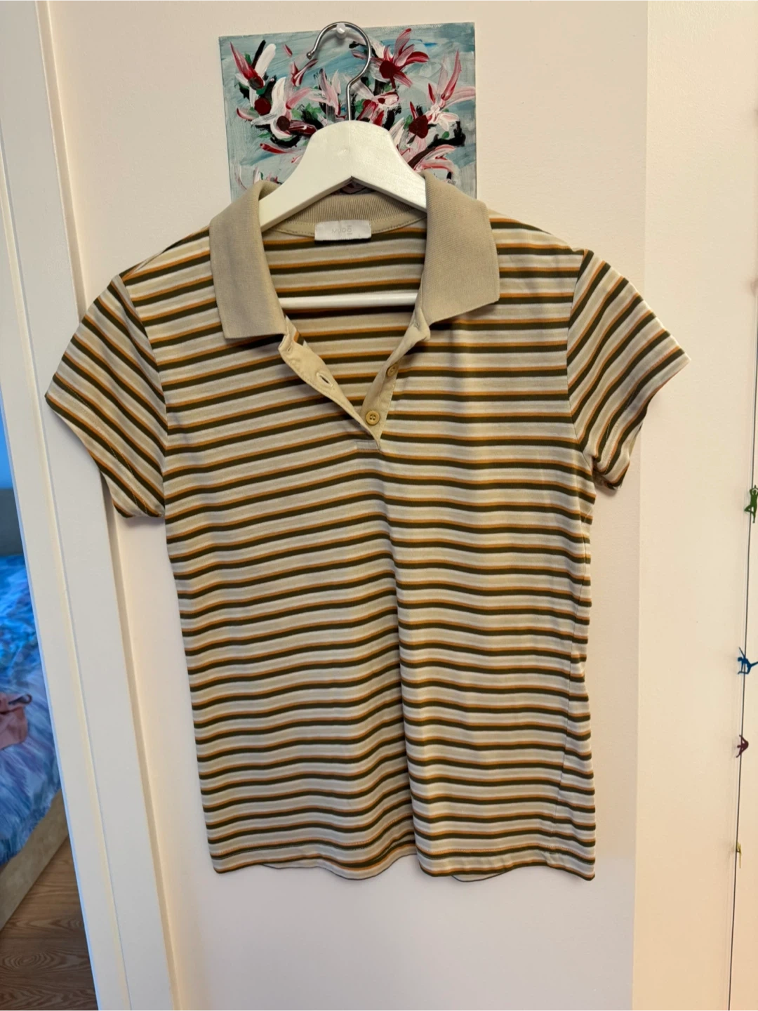 Selling a striped polo shirt. It features a beige collar and button-up design. The shirt has a pattern of brown, beige, and white stripes. It's in great condition and ready for a new owner!