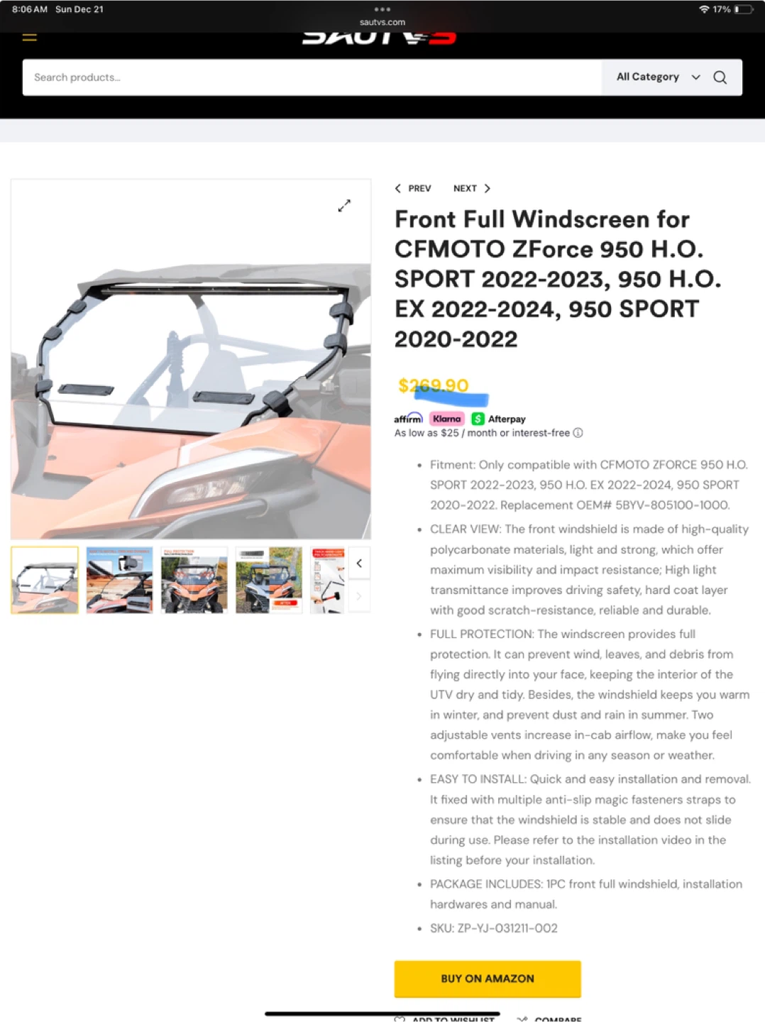 Selling a brand new SAUTVS full windshield for CFMOTO ZForce 950 H.O. EX 2022-2023, 950 H.O. EX 2020-2022, and 950 SPORT 2020-2022.