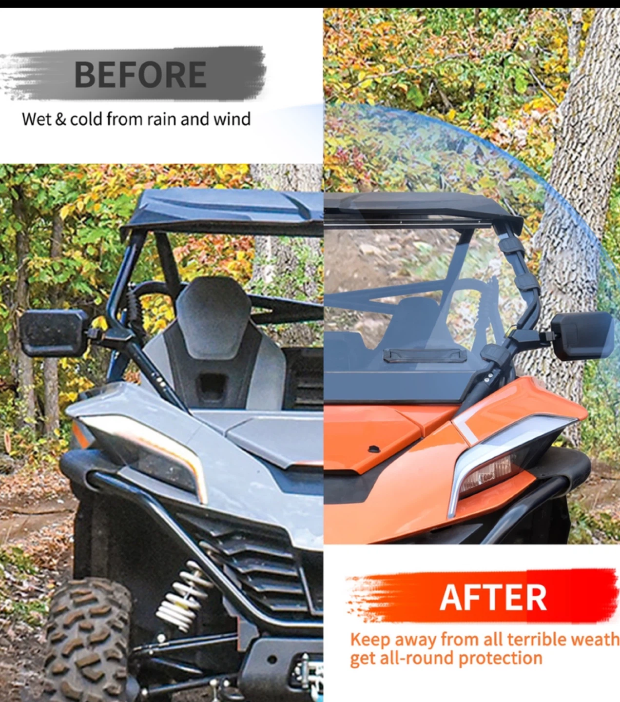 It provides full protection and can prevent wind, leaves, and debris from flying directly into your face, keeping the interior of the UTV dry and tidy. It keeps you warm in winter and prevents dust and rain in summer. Easy to install with multiple anti-slip magic fasteners straps. Retail $249. I have four available.