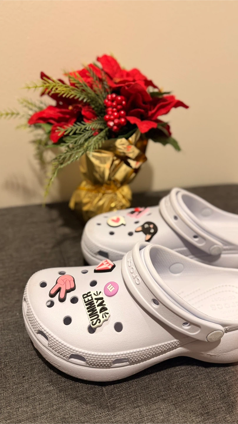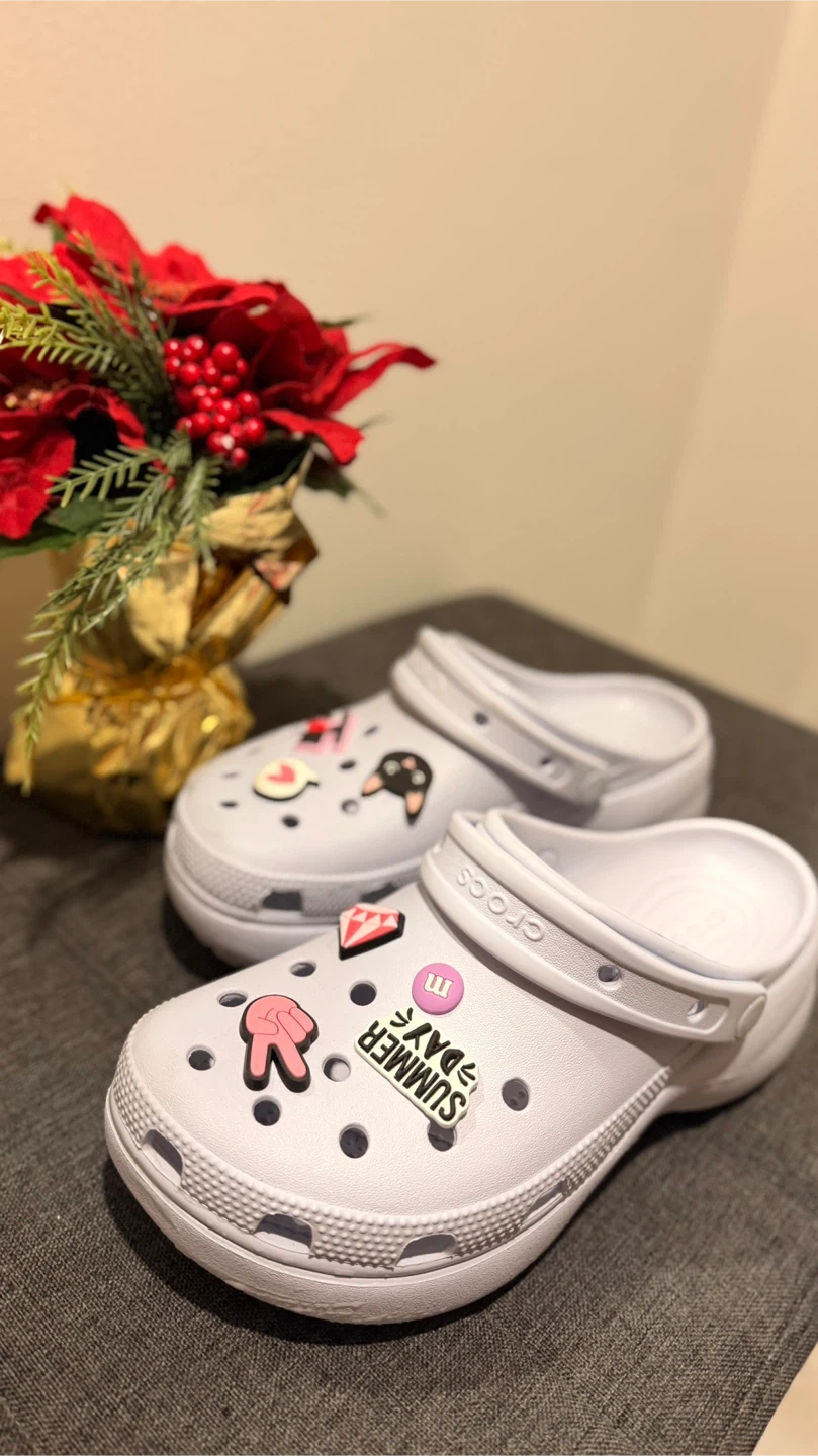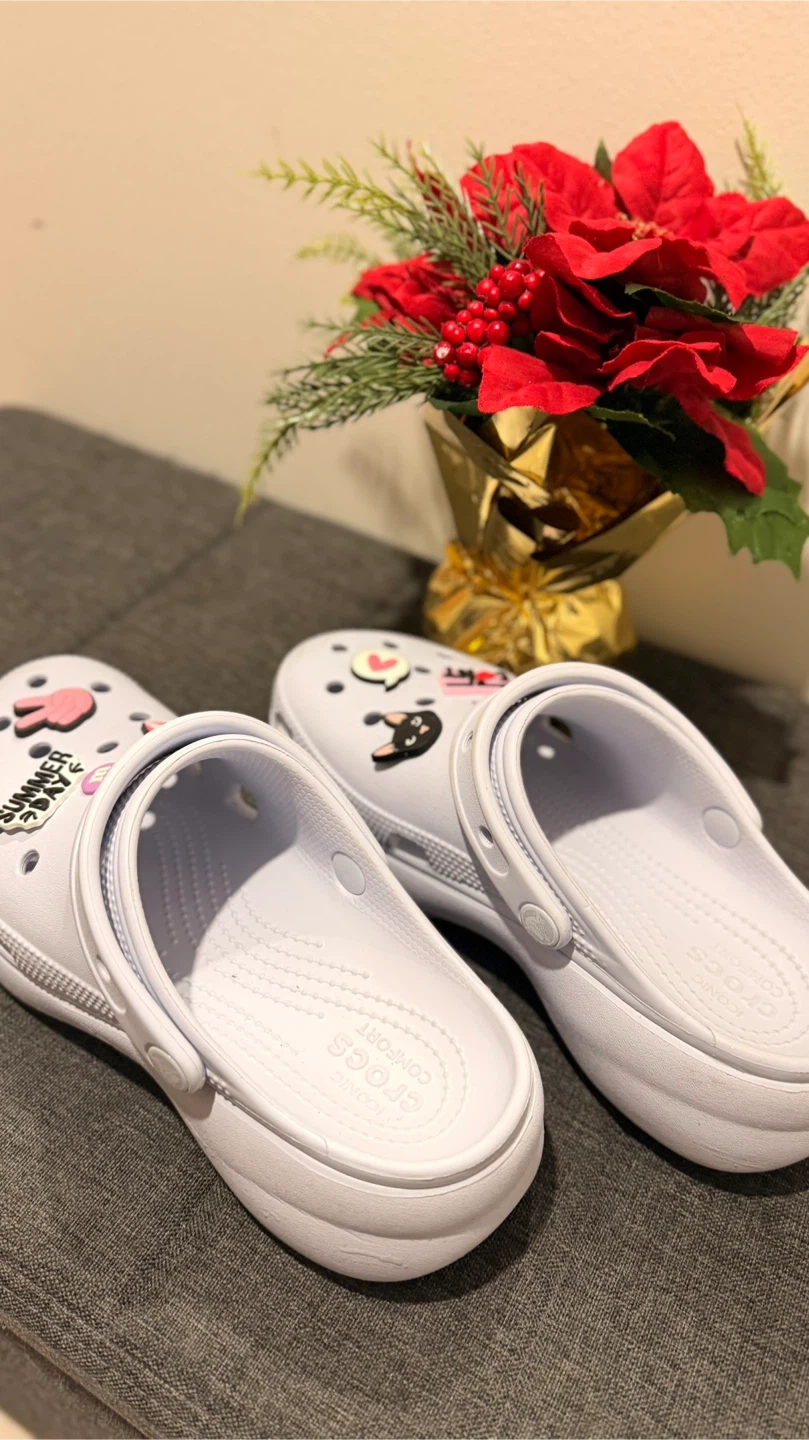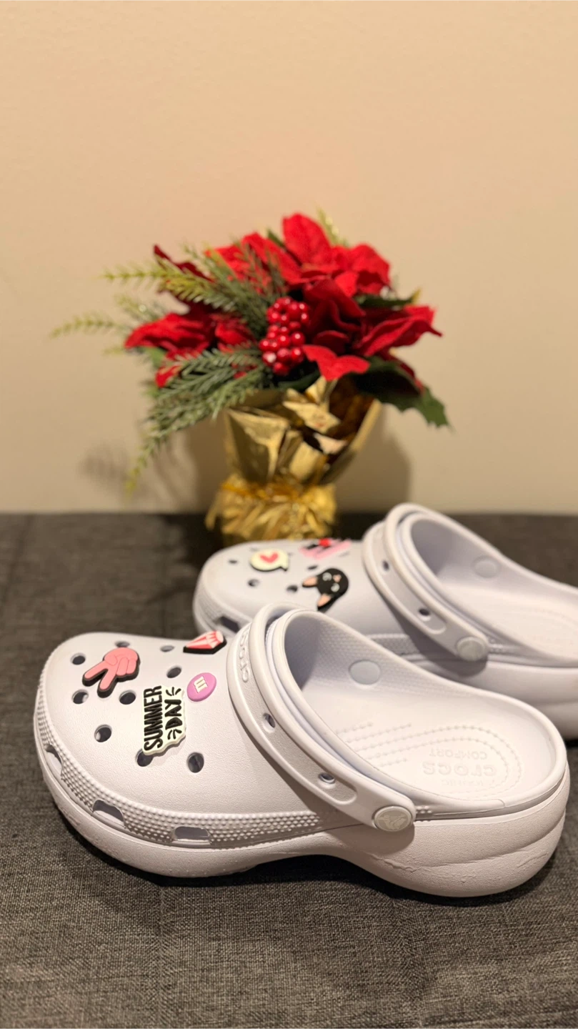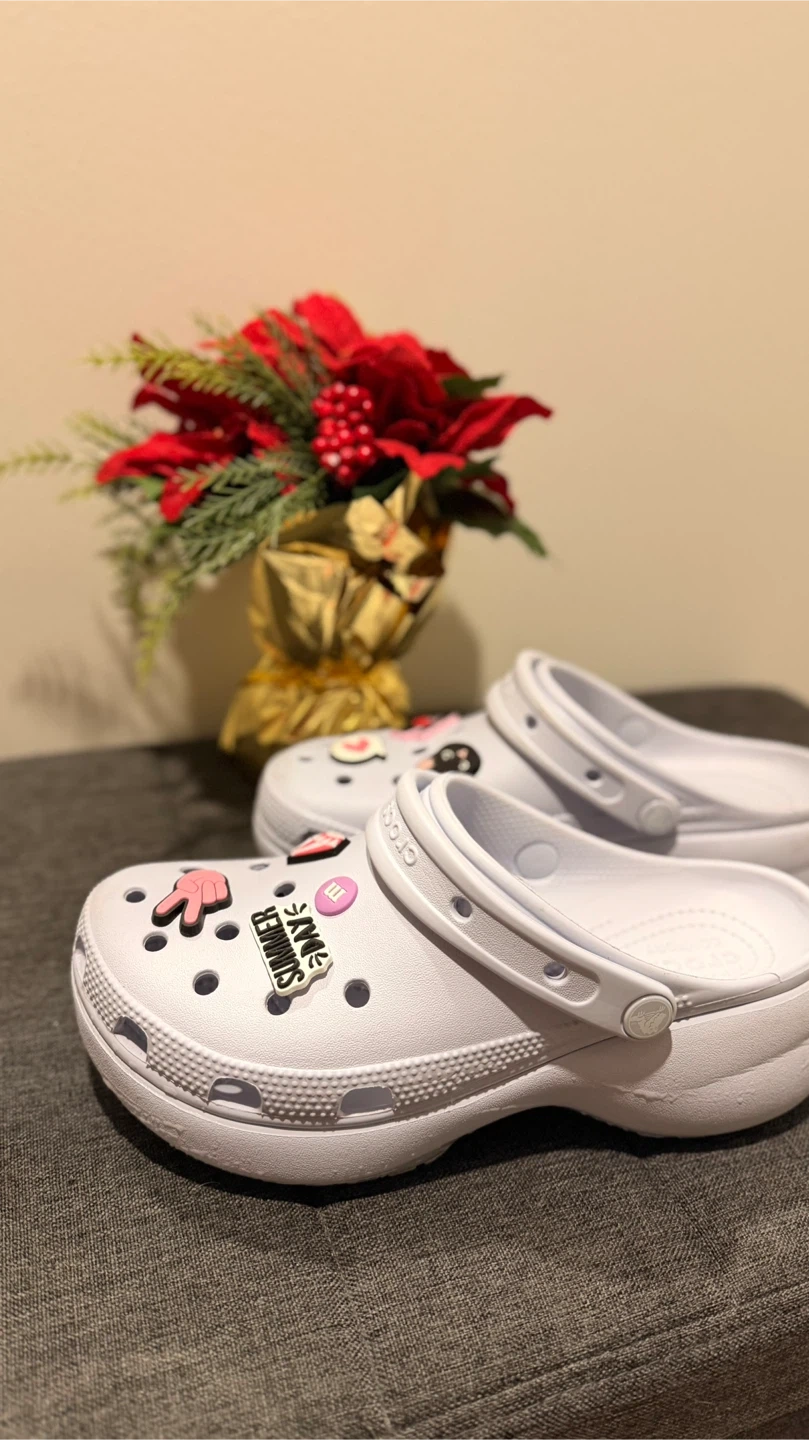 Selling a pair of white Crocs Classic Platform clogs. They have some cute jibbitz on them!