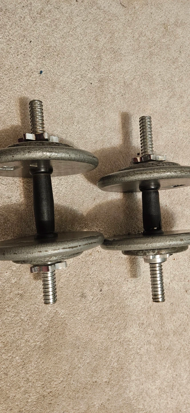 #gifting Selling a pair of adjustable dumbbells. They show some signs of use but are still in good working condition. Perfect for home workouts!