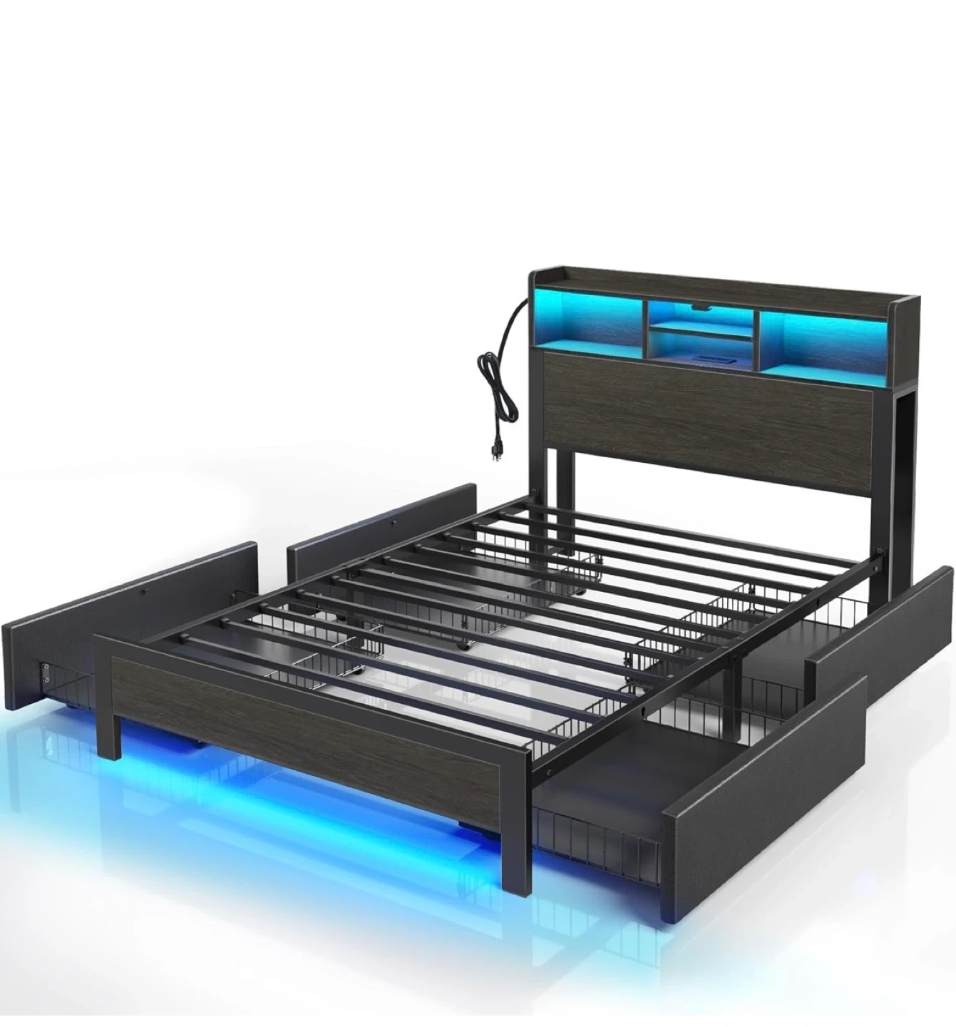 This bed frame features a bookcase-style headboard with built-in storage and LED lighting. It's a stylish and functional addition to any bedroom. Perfect for keeping your favourite books and devices within reach! It comes with a custom built mattress. Bed $500, mattress $300, total I paid $800, selling for $600.