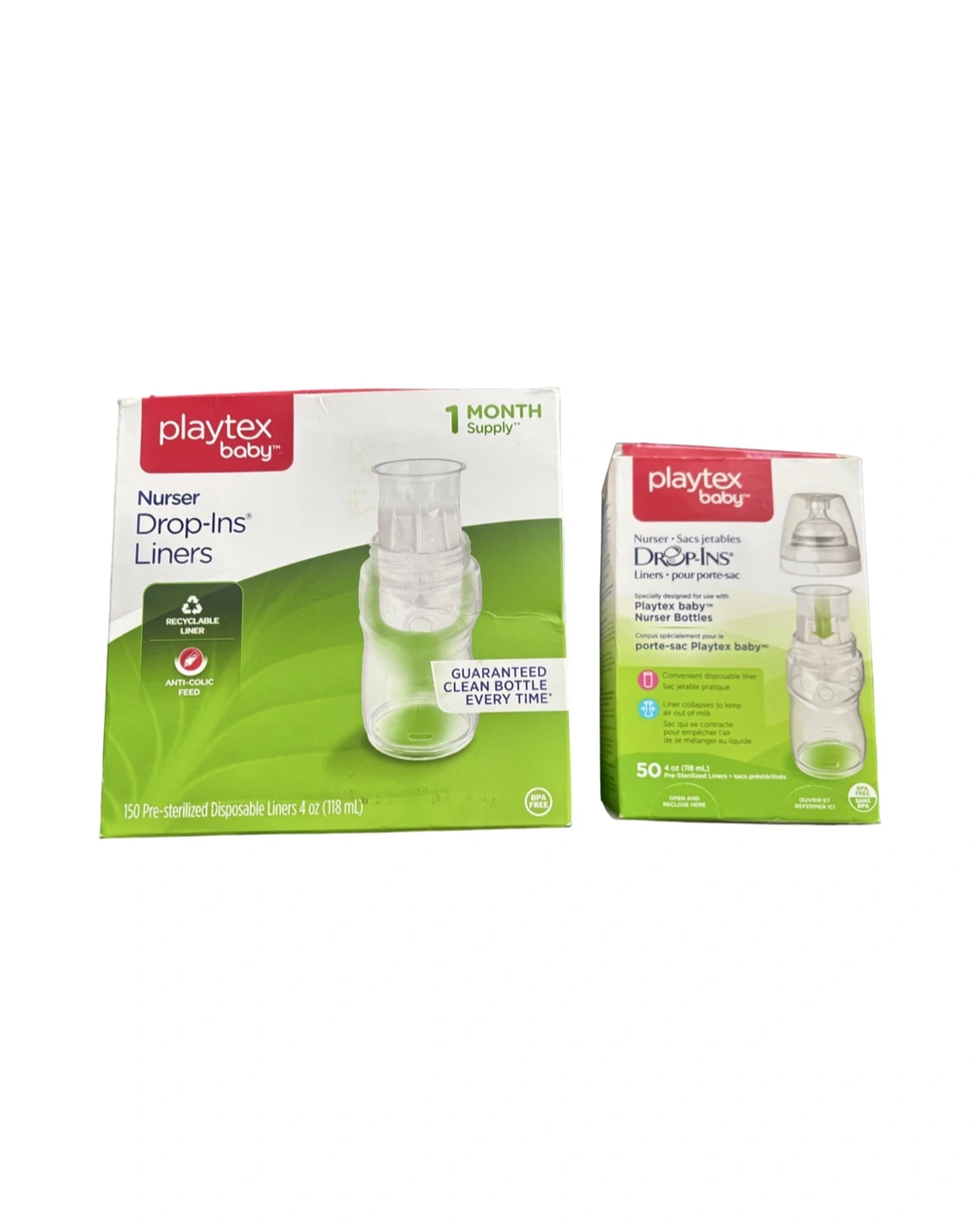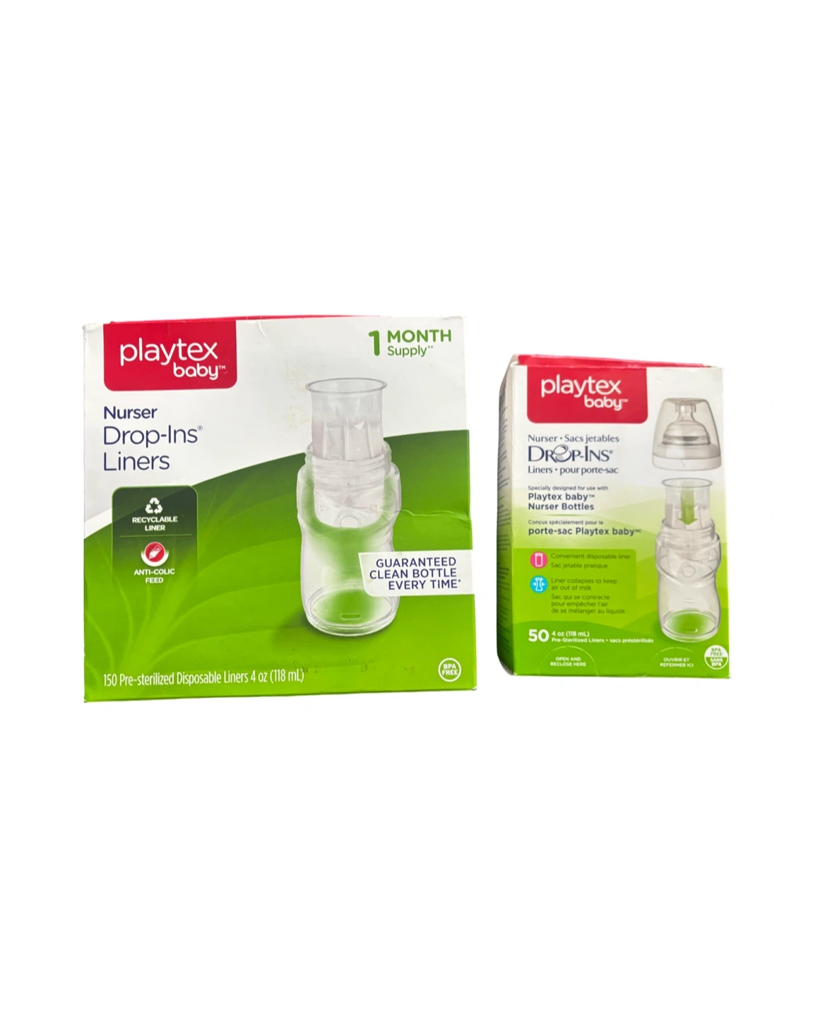 I'm selling Playtex Baby Drop-Ins Liners and Nurser Bottles! One box contains 150 pre-sterilized disposable liners, 4 oz (118 mL). The other box contains 50 pre-sterilized liners, also 4 oz (118 mL). Both boxes are recyclable and anti-colic feed