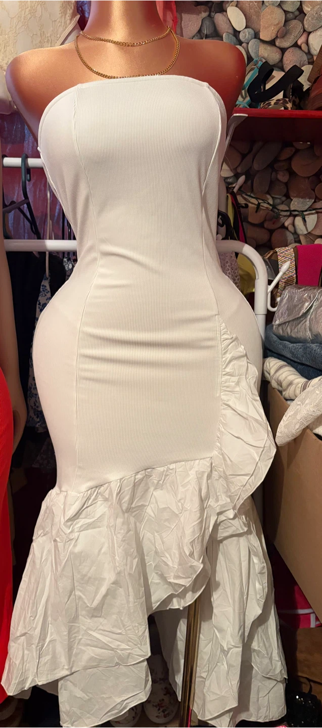 Selling a white strapless dress with a unique ruffle detail at the bottom. It's in great condition and perfect for a special occasion or a night out!