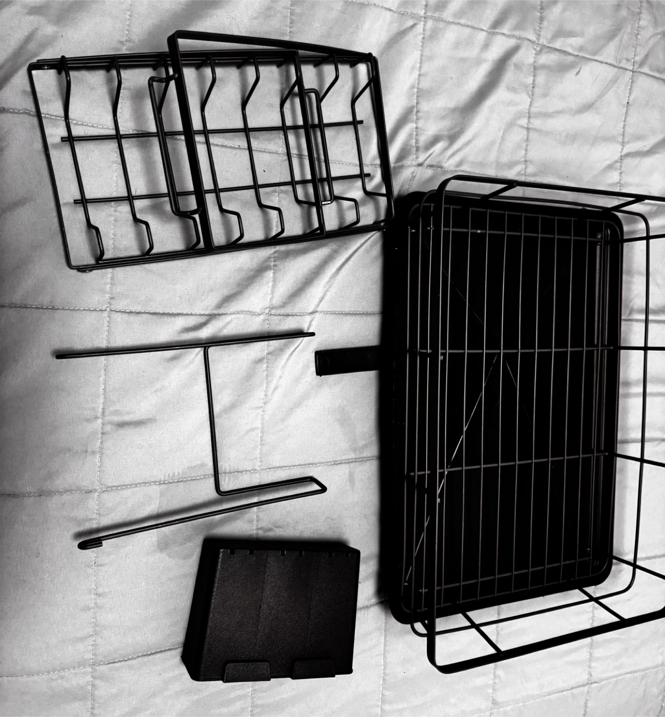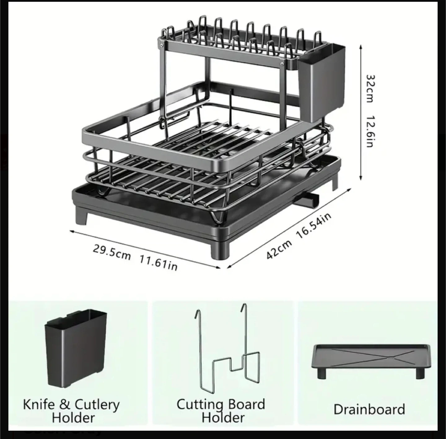 This is a gray metal dish drying rack in great condition. It includes a knife & cutlery holder, cutting board holder, and drainboard.