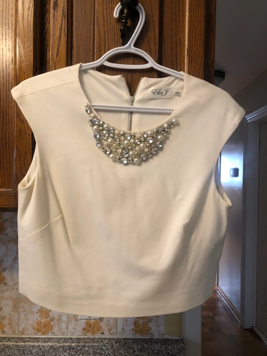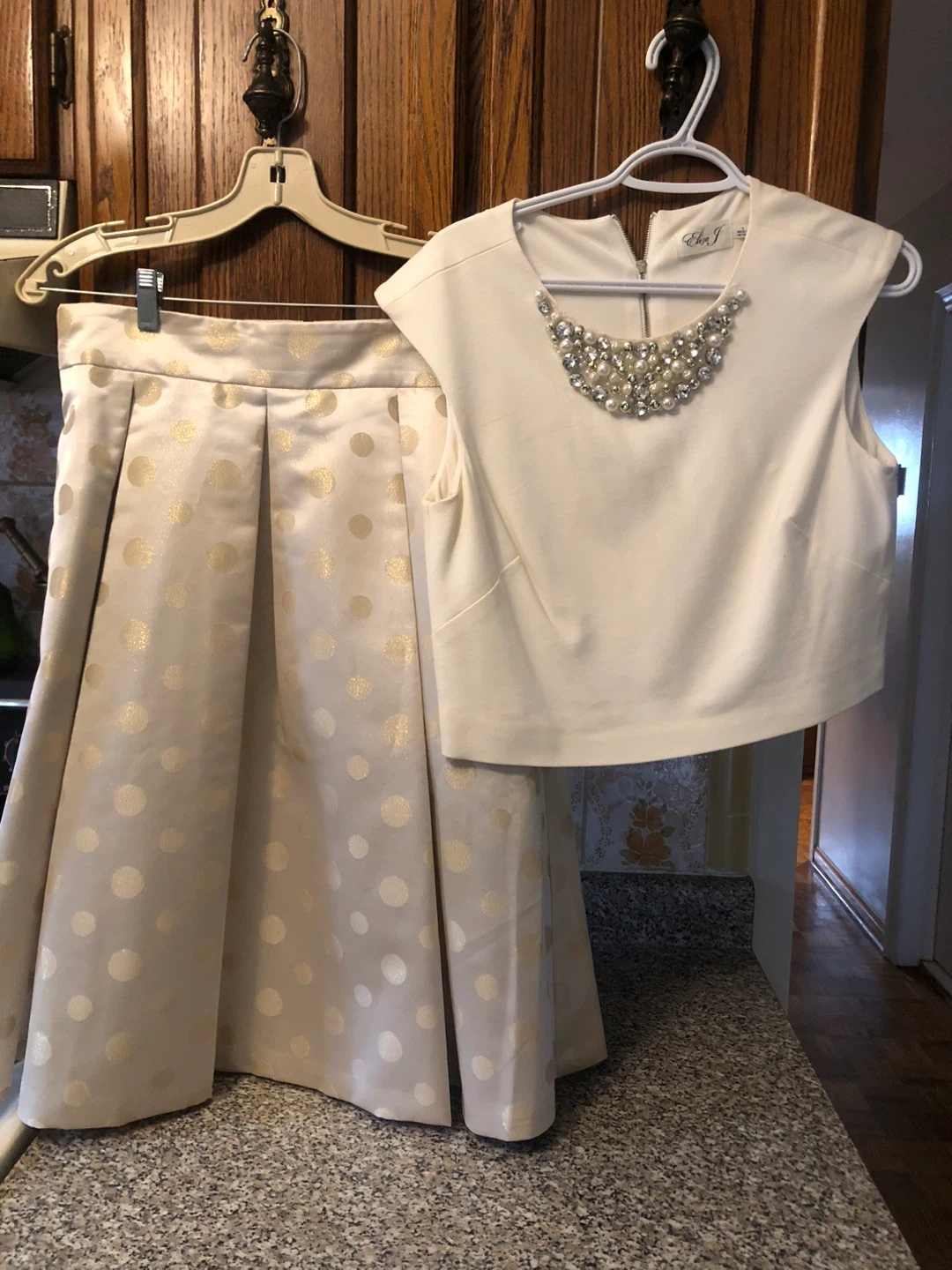 Selling a lovely two-piece set from Eliza J! It includes a cream-coloured top with pearl and rhinestone embellishments around the neckline, and a matching skirt with gold polka dots. Both pieces are size small and in great condition. Perfect for a special occasion!