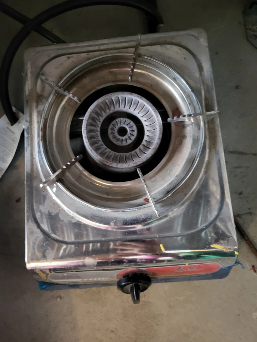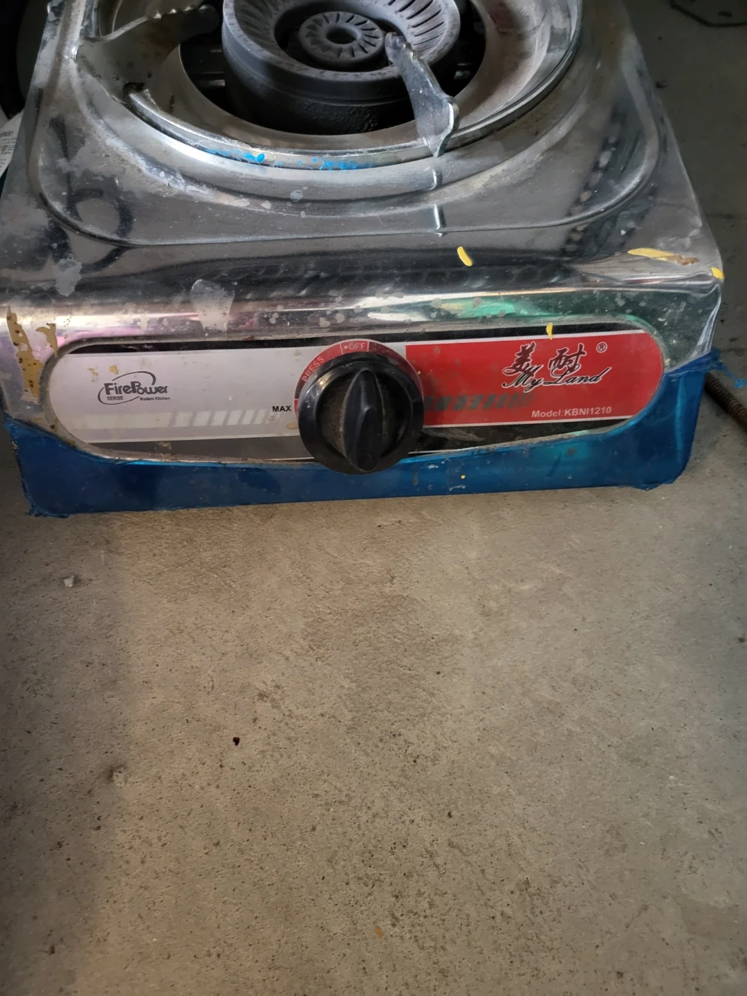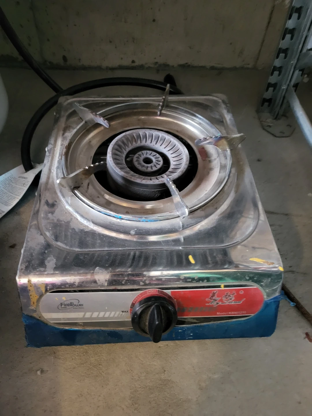 Selling a FirePower single burner gas stove, model KBN1210. It's perfect for camping or small cooking spaces. It has some signs of use, but it's still in good working condition!