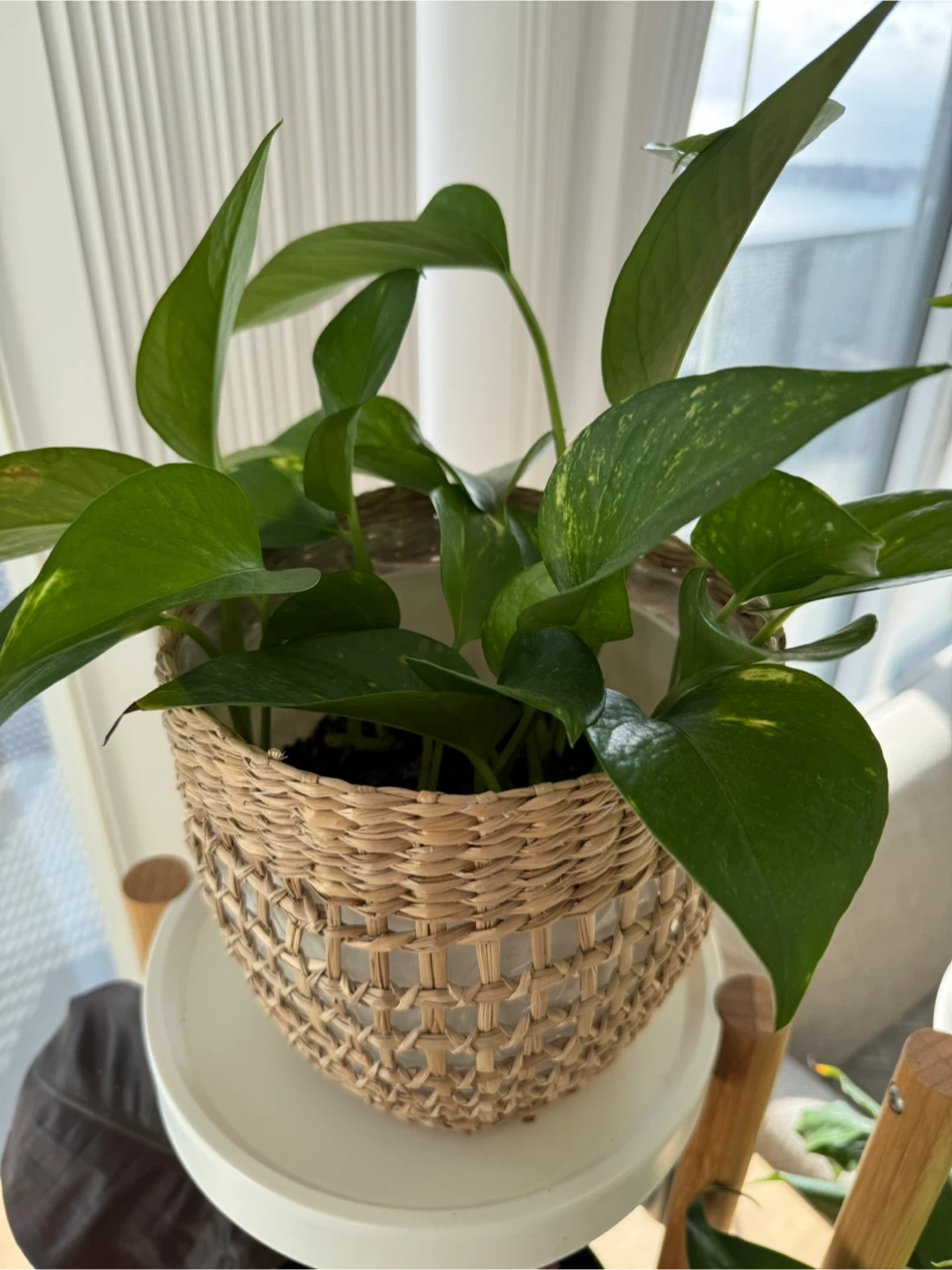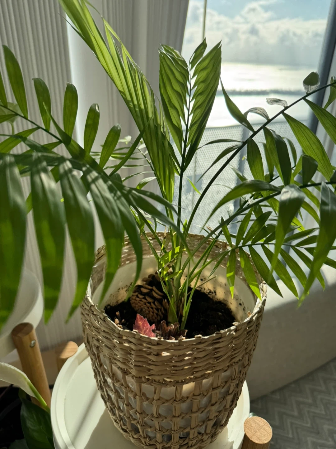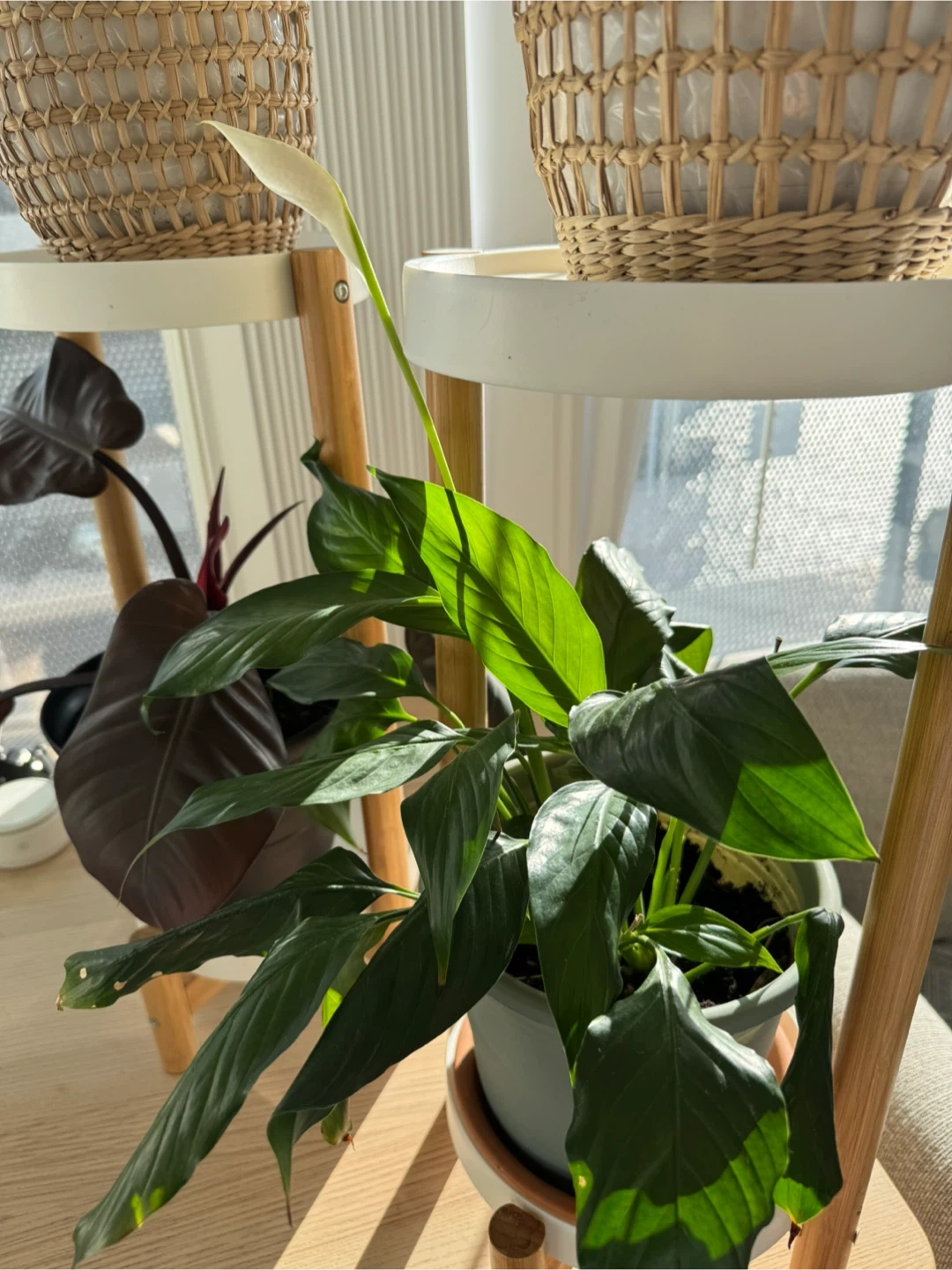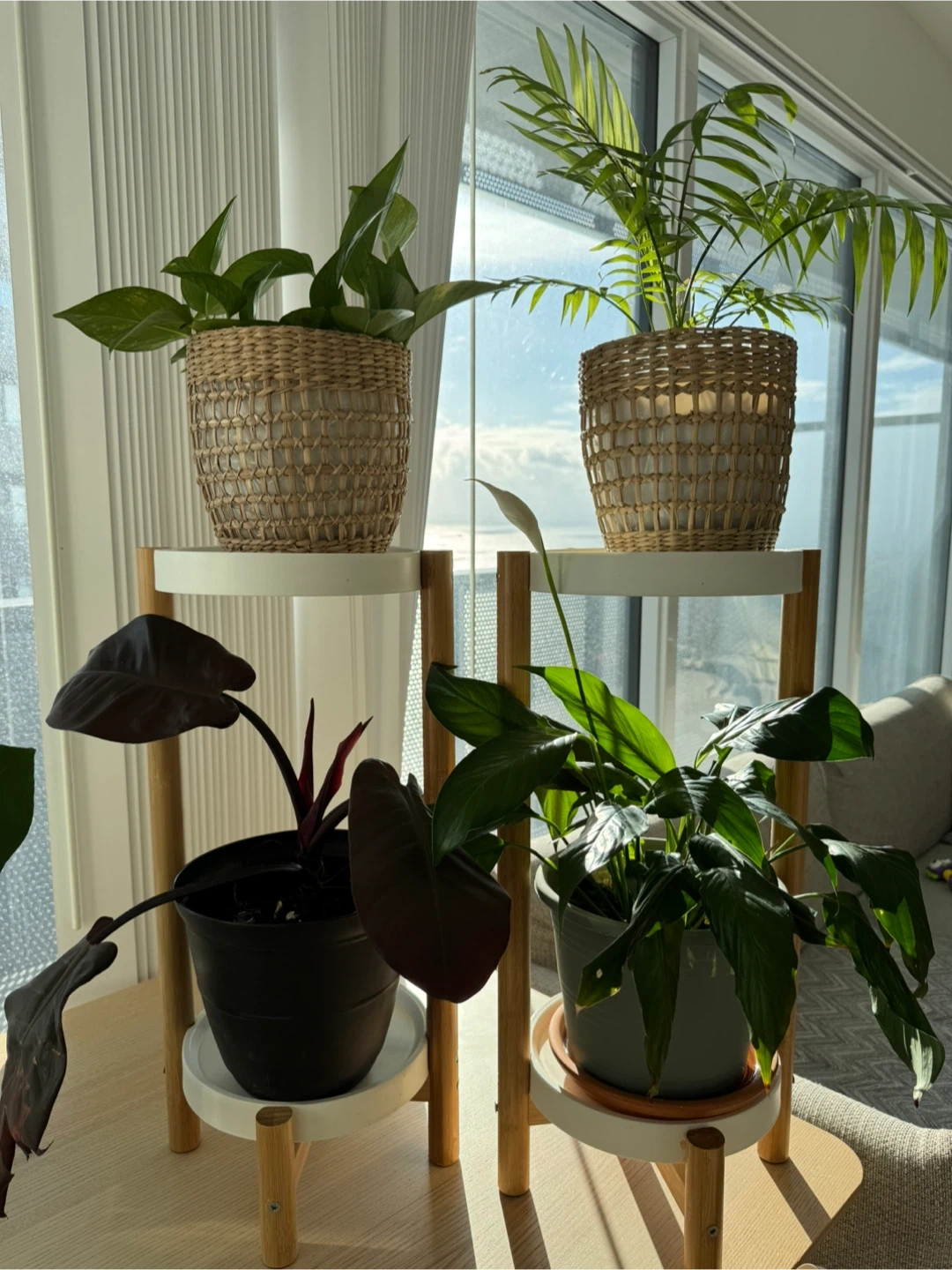 Selling a pair of plant stands, plants and pots included. There are four different plants included a palm, peace lily, and others.