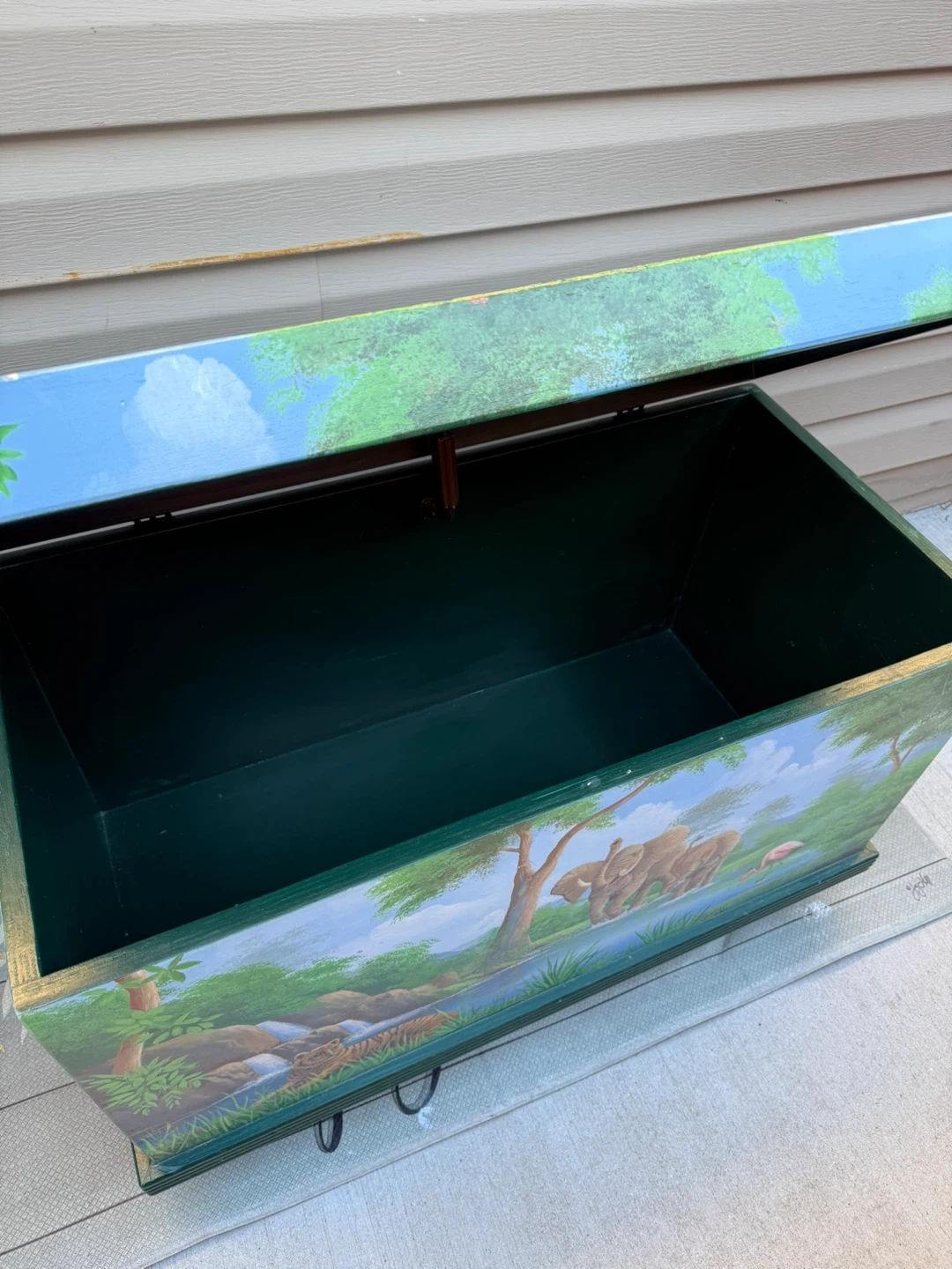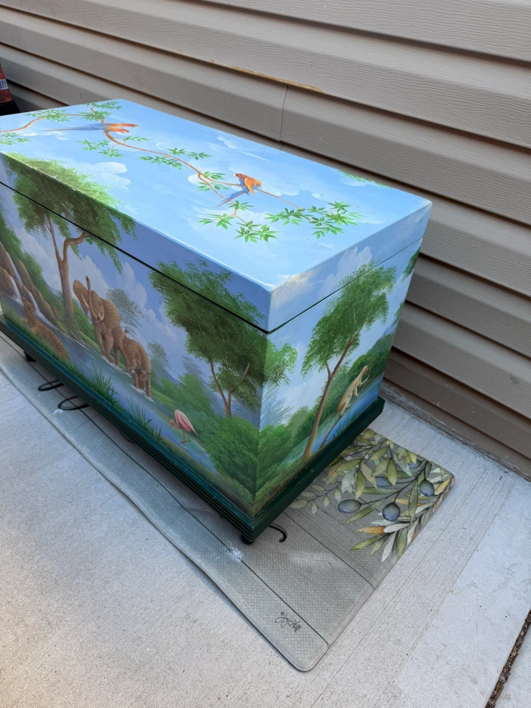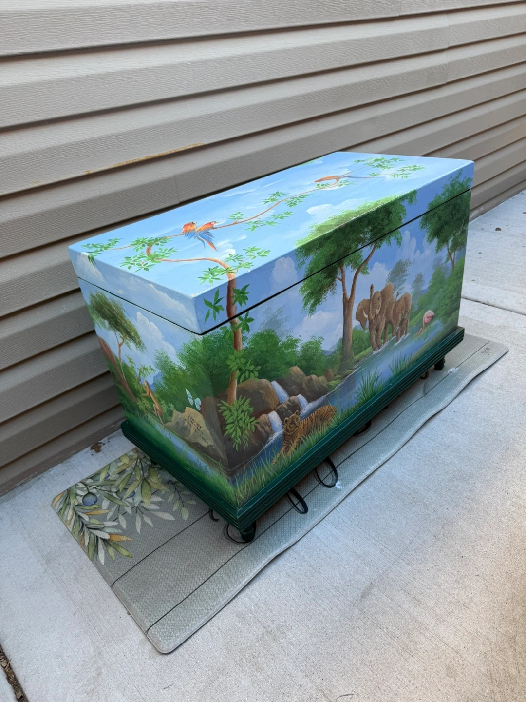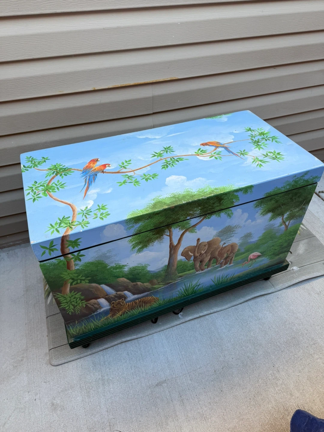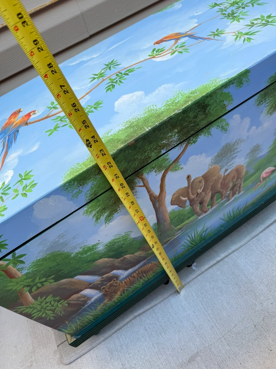Selling a beautiful hand-painted wooden toy chest! It features a vibrant jungle scene with elephants, tigers, and colorful birds. It's perfect for adding a touch of whimsy to any child's room while providing ample storage for toys and other treasures