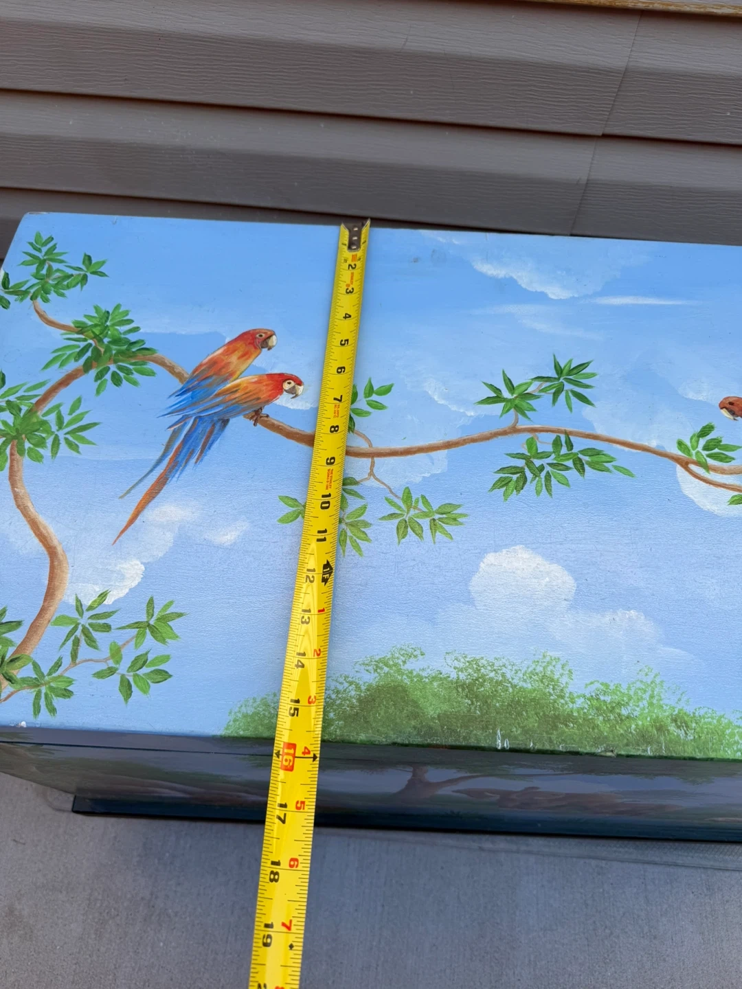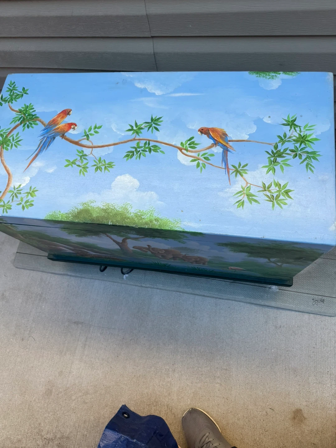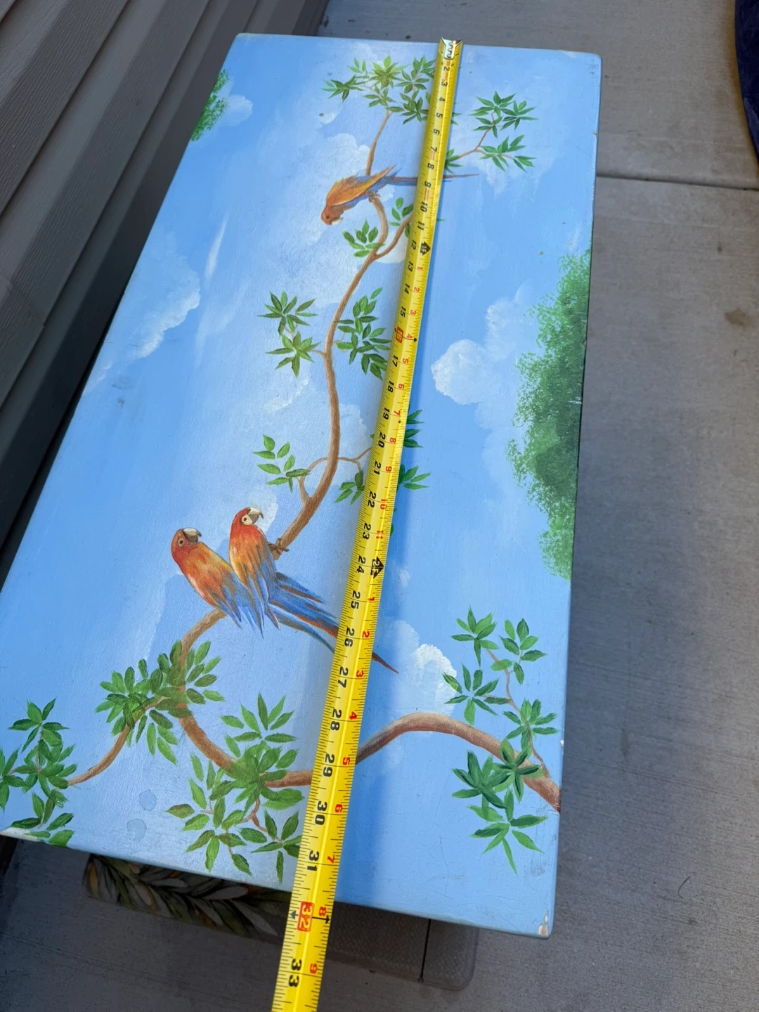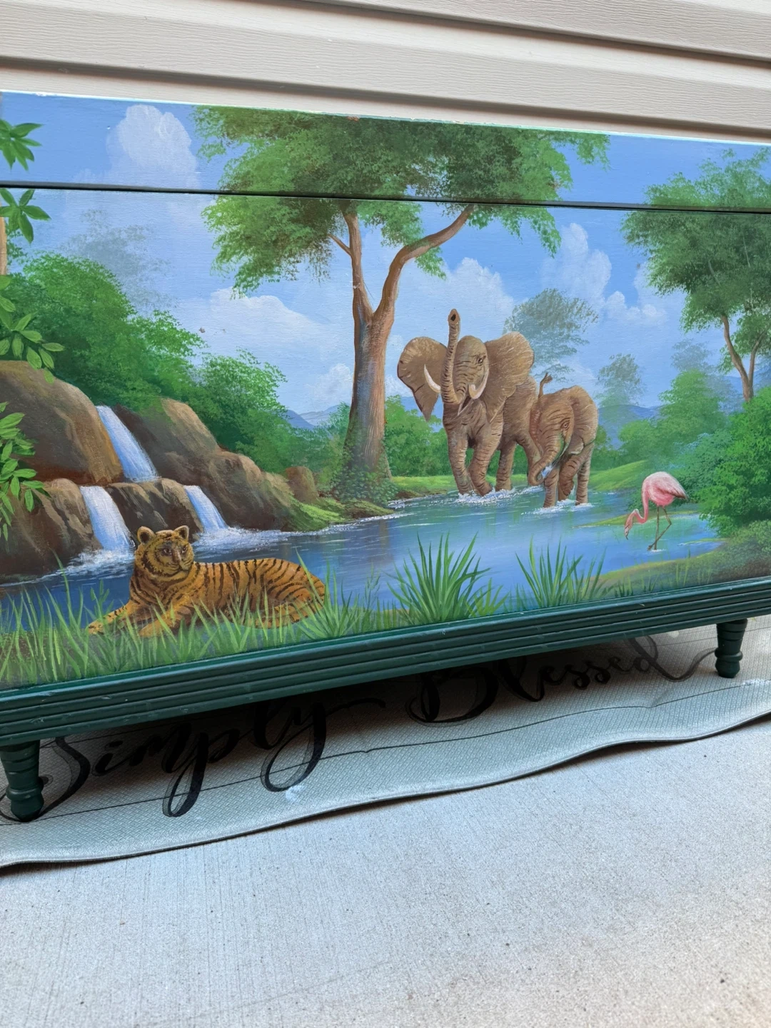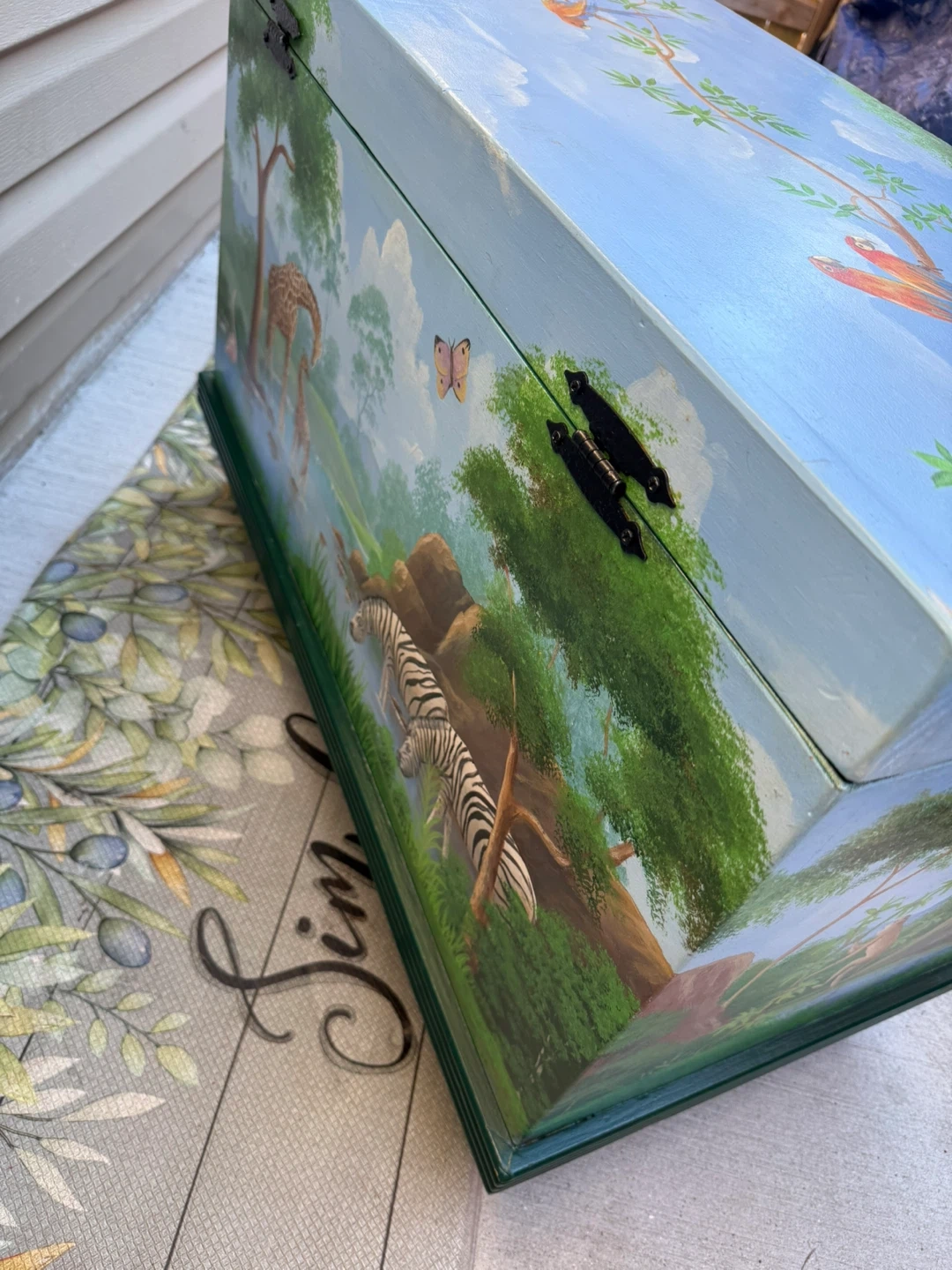 Selling a beautiful hand-painted wooden toy chest! It features a vibrant jungle scene with elephants, tigers, and colorful birds. It's perfect for adding a touch of whimsy to any child's room while providing ample storage for toys and other treasures