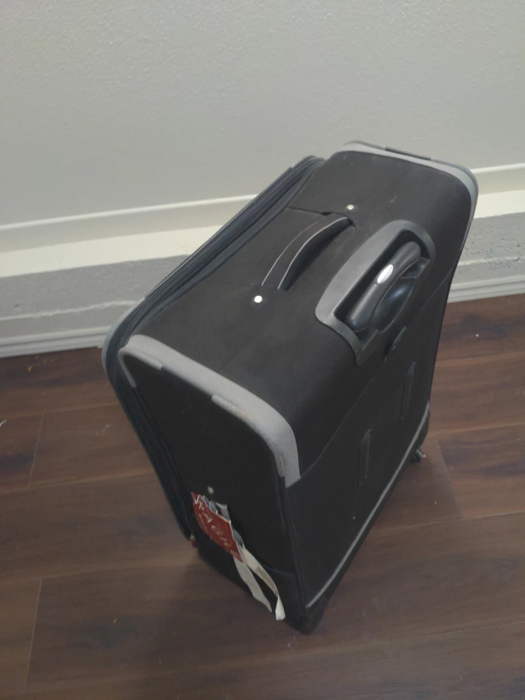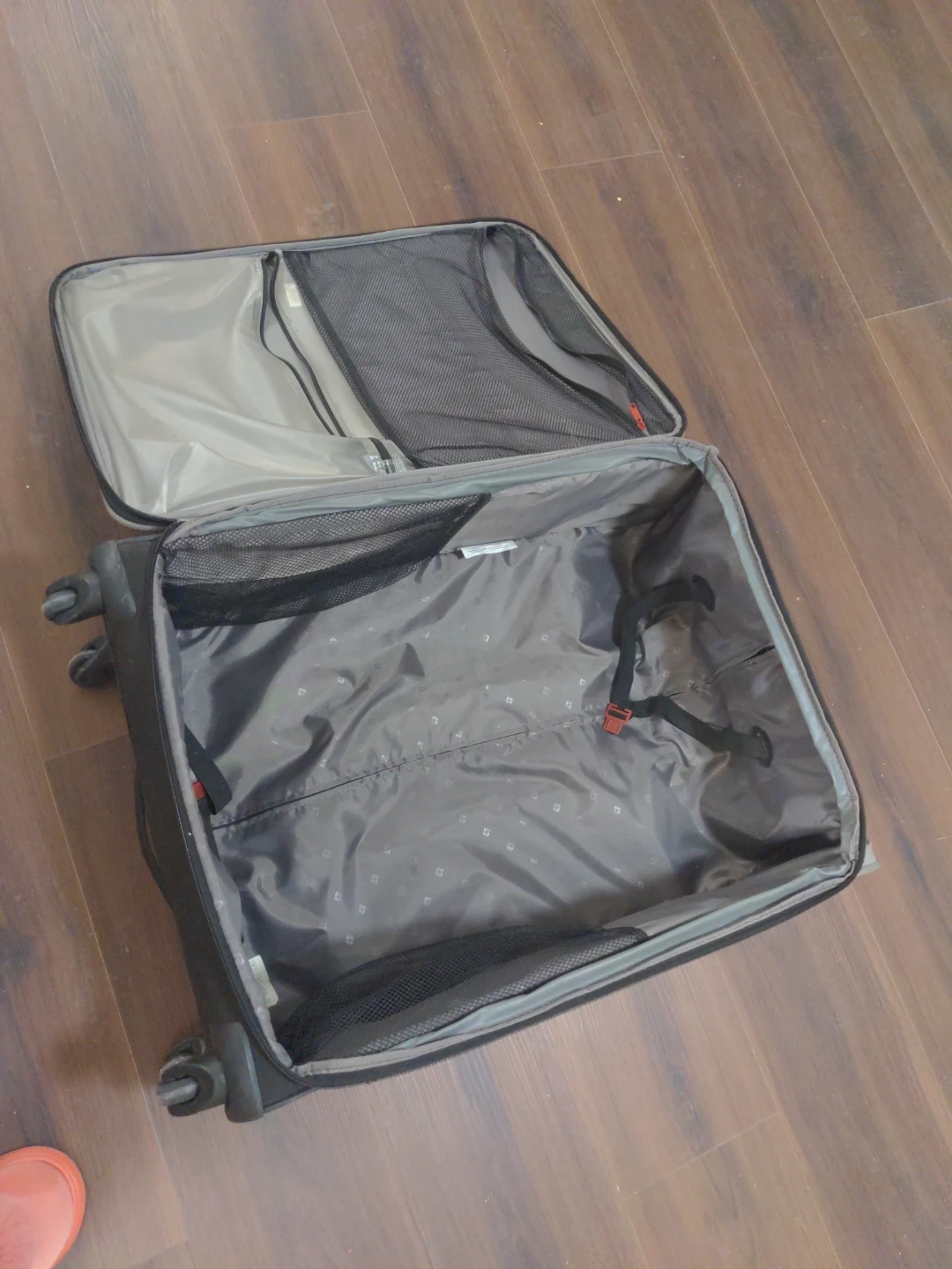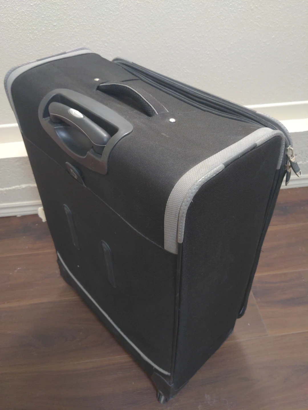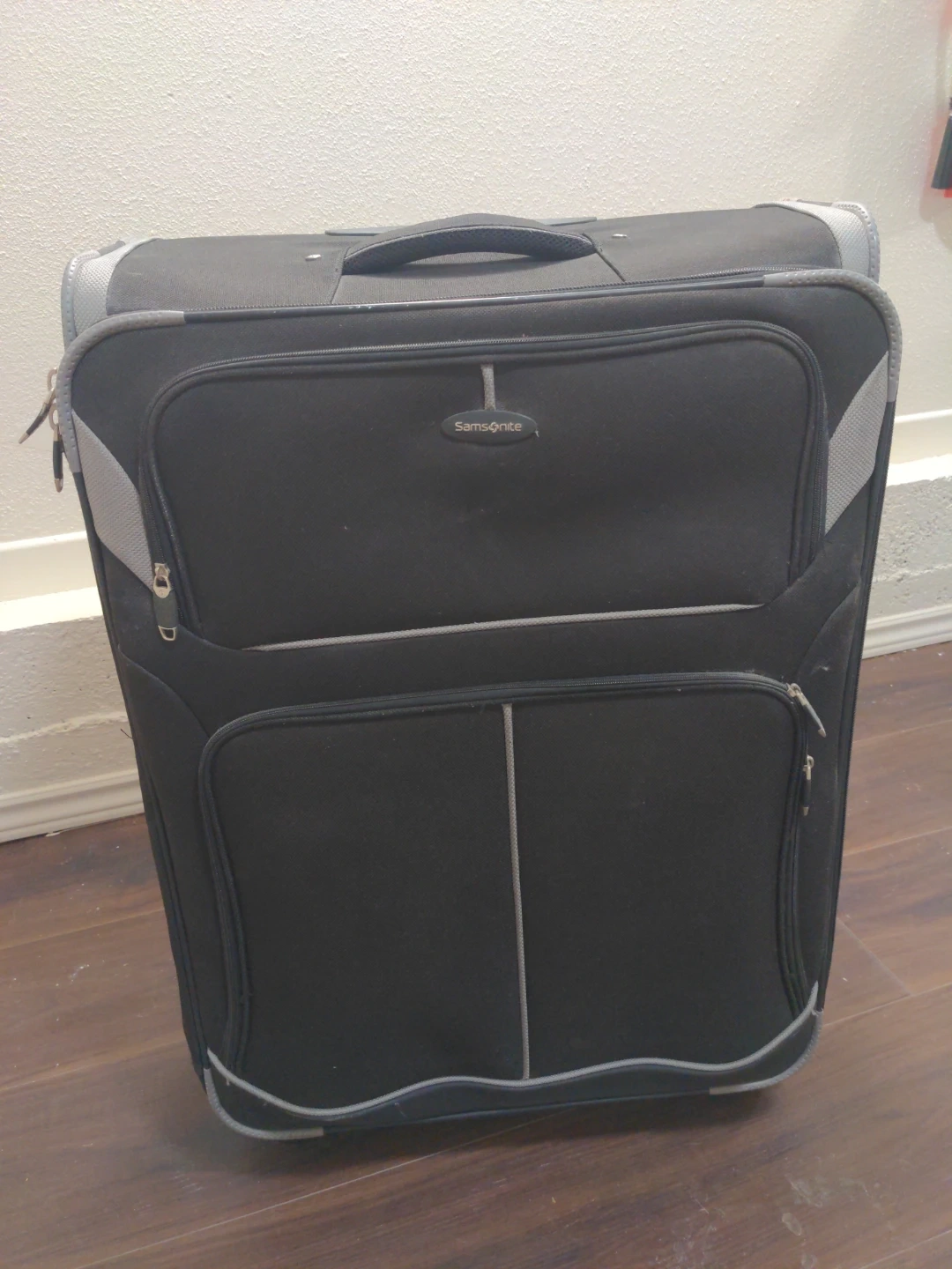 Selling a Samsonite suitcase in black. It's in good condition and ready for your next trip! It features a retractable handle and smooth-rolling wheels for easy maneuvering. The interior has mesh compartments to help keep your belongings organized