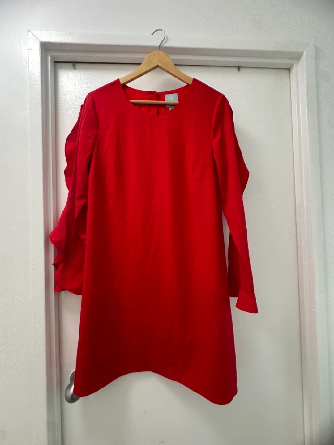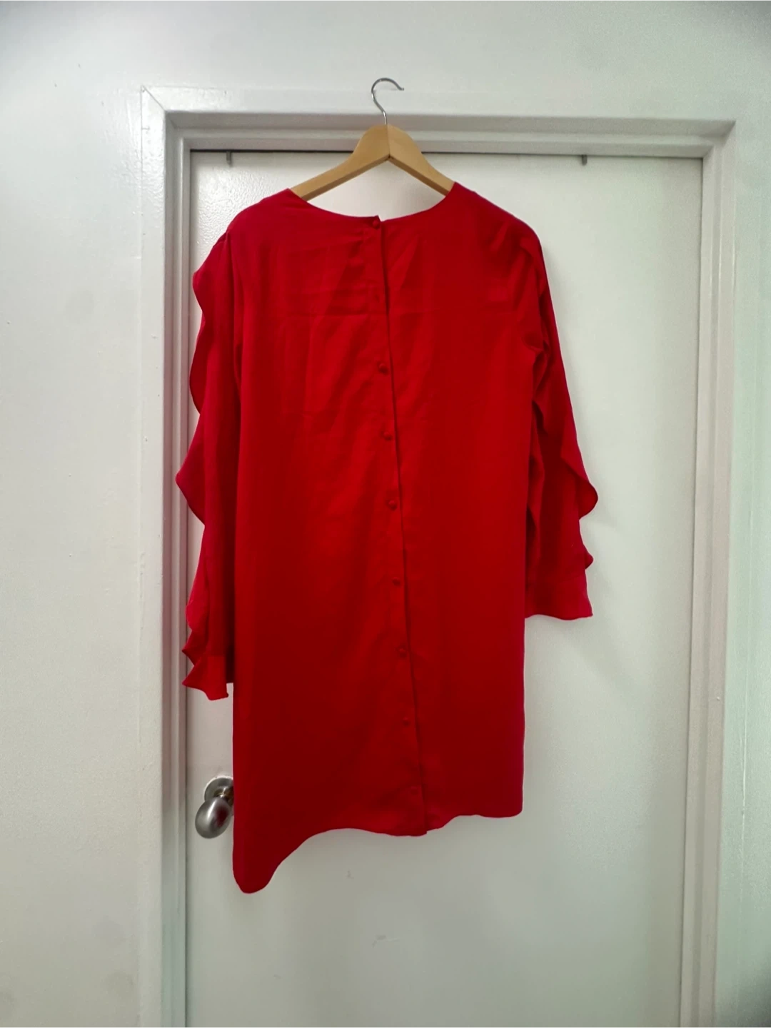 Selling a vibrant red CeCe dress in size medium! It's in great condition and features a unique ruffled sleeve detail and button-down back. Perfect for adding a pop of colour to your wardrobe!