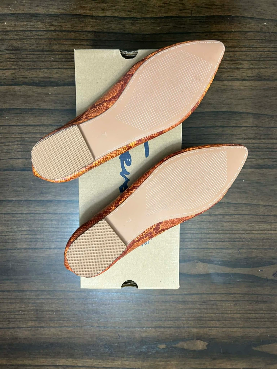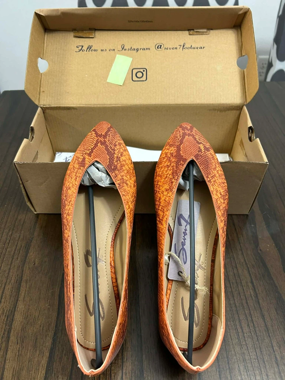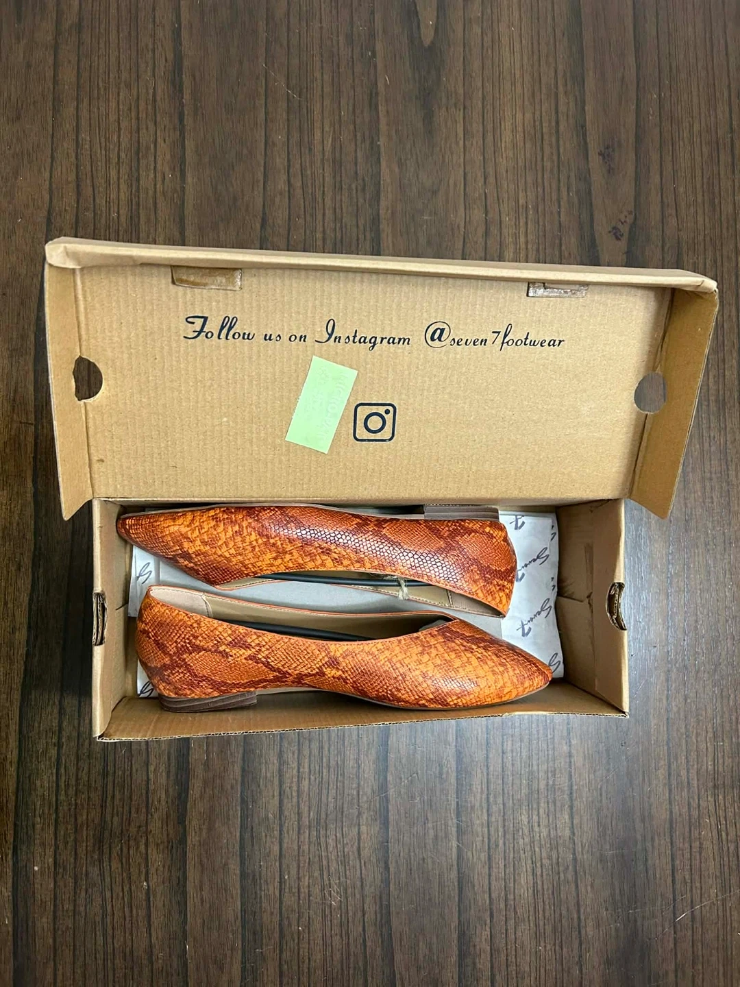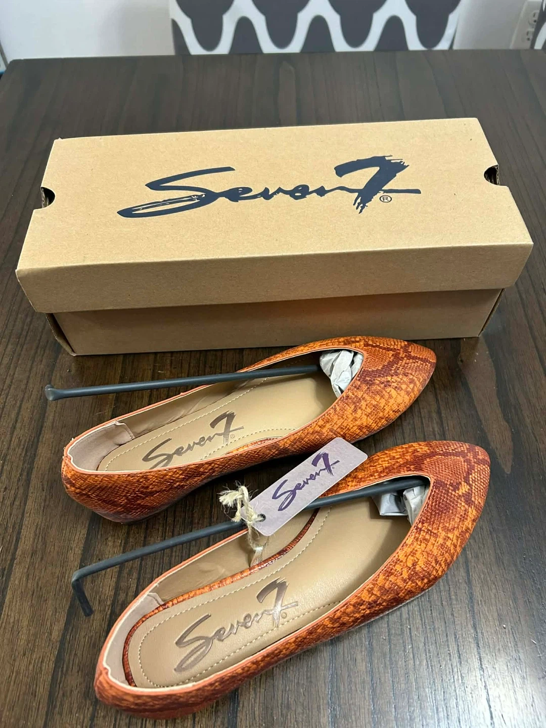 These Seven 7 flats are in excellent condition and come with the original box! They feature a stylish orange snake print design and are a women's SIZE 7. Perfect for adding a pop of colour to your outfit