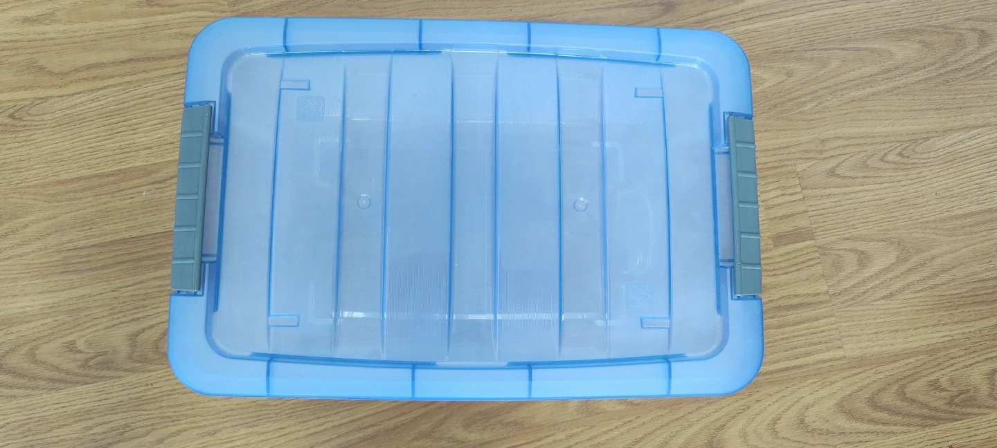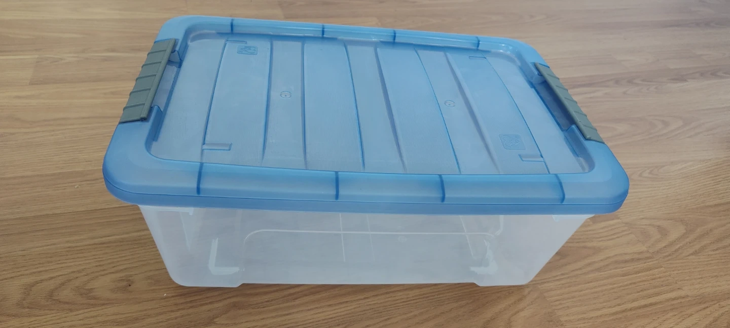 Selling a handy blue plastic storage container. It comes with a lid to keep your items safe and organized. Perfect for tidying up your space! Dimensions: 27*40cm.