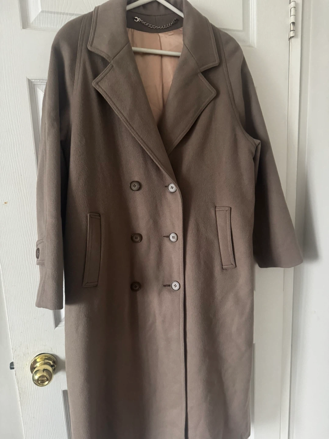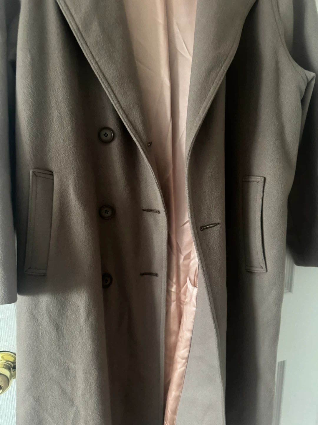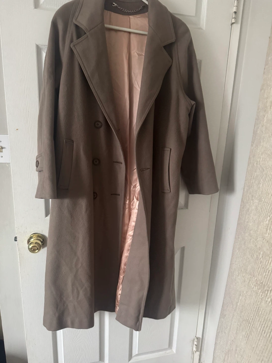 Selling a stylish Woolen brown trench coat with a belted waist. It's in great condition and perfect for fall or spring! The coat has a double-breasted button closure and a soft, silky lining.