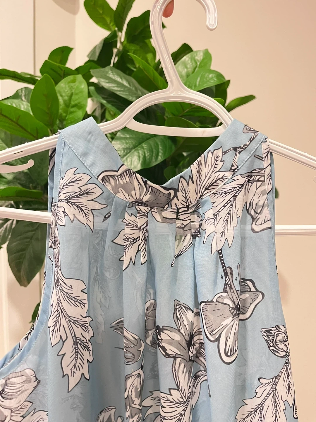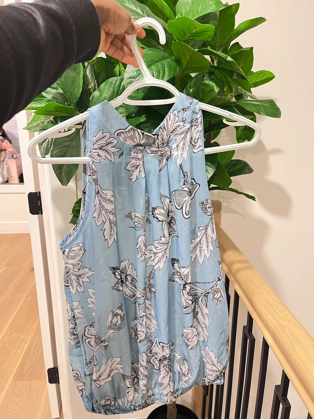 Here's a cute floral sleeveless blouse! It's a size small and features a pretty light blue background with a white and grey floral pattern. Perfect for a sunny day or layering under a cardigan! This is a new shirt, medium or small size. Pick up only!