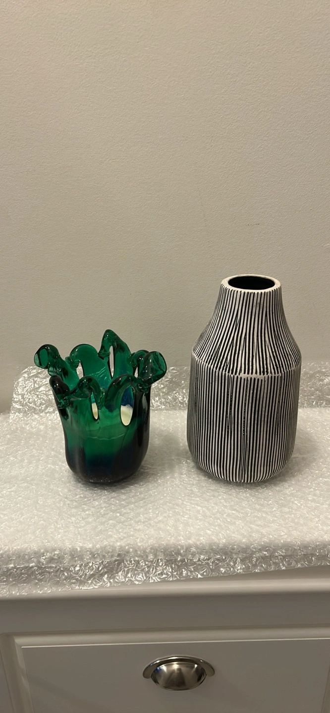 Selling these two together. One is a lovely green glass candle made in Italy, and the other is a vase from Bouclair with a simple striped design. They'd look great in any home!