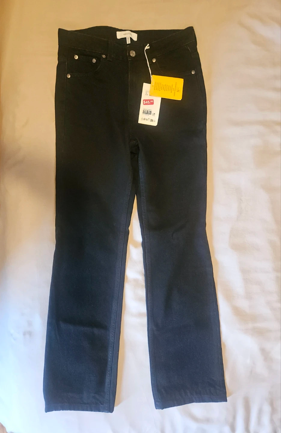 Selling a pair of new H&M with tags black denim high rise, straight leg jeans. These jeans are a size US4/EU36 and still have the original tag attached. Originally bought for $45.99, these jeans are ready for a new owner!