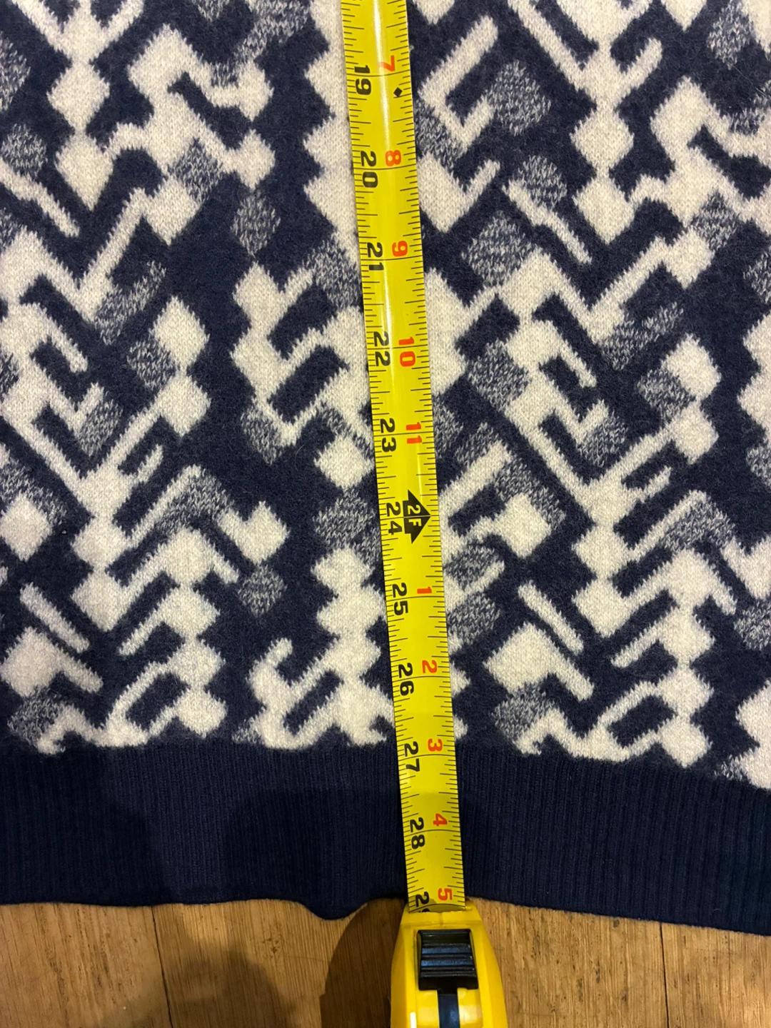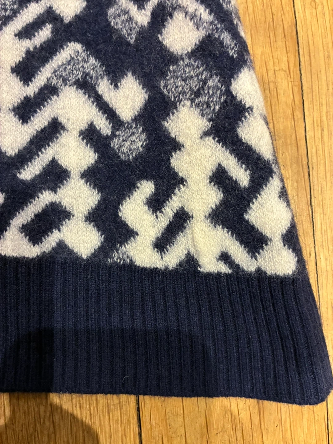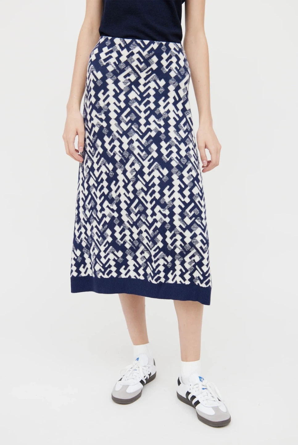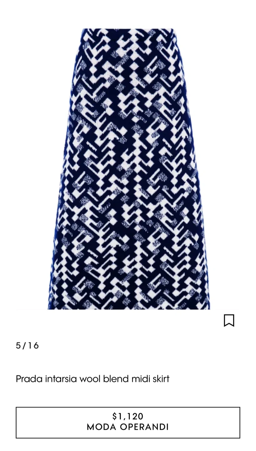 This Prada midi skirt is a stylish addition to any wardrobe! It's made in Italy from a wool blend and features a unique intarsia pattern in navy and white. Featured in Vogue for its every day comfort and style. Originally bought for $1,120. European Size 44 = US Size 8