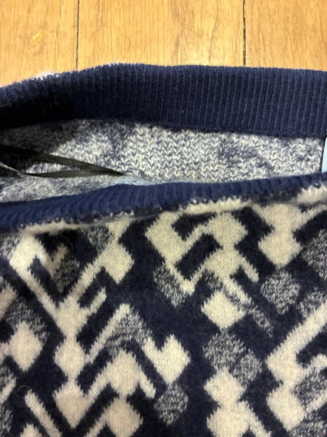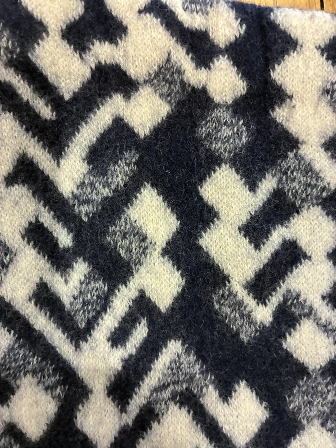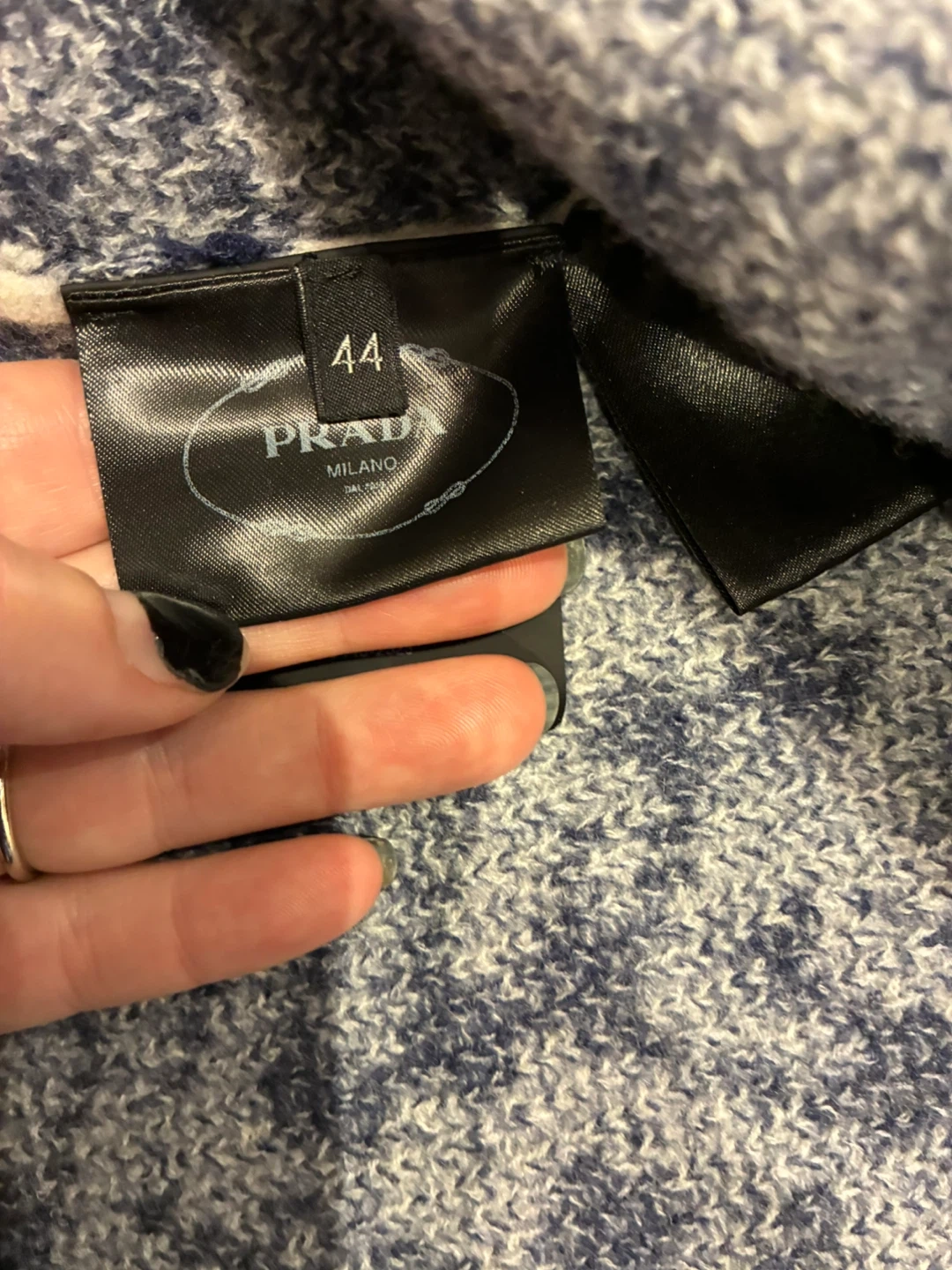 This Prada midi skirt is a stylish addition to any wardrobe! It's made in Italy from a wool blend and features a unique intarsia pattern in navy and white. Featured in Vogue for its every day comfort and style. Originally bought for $1,120. European Size 44 = US Size 8