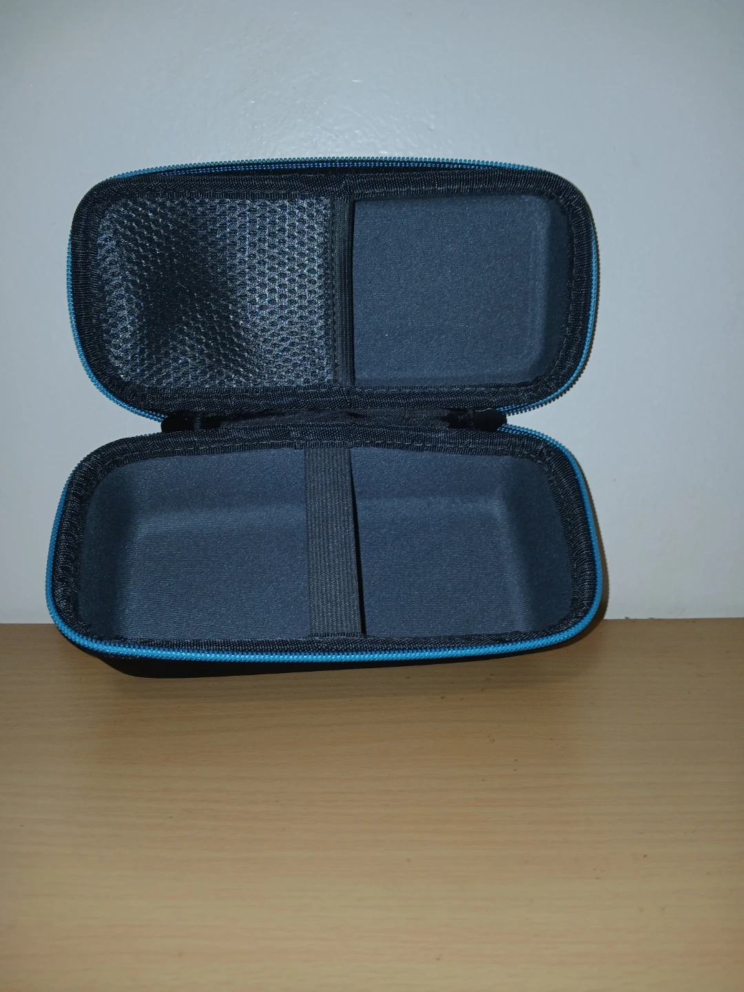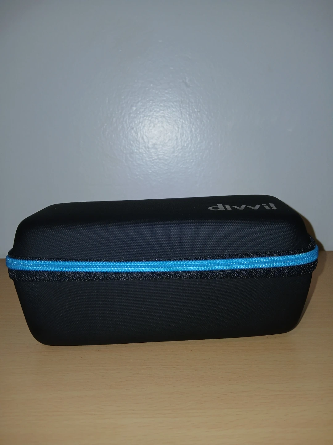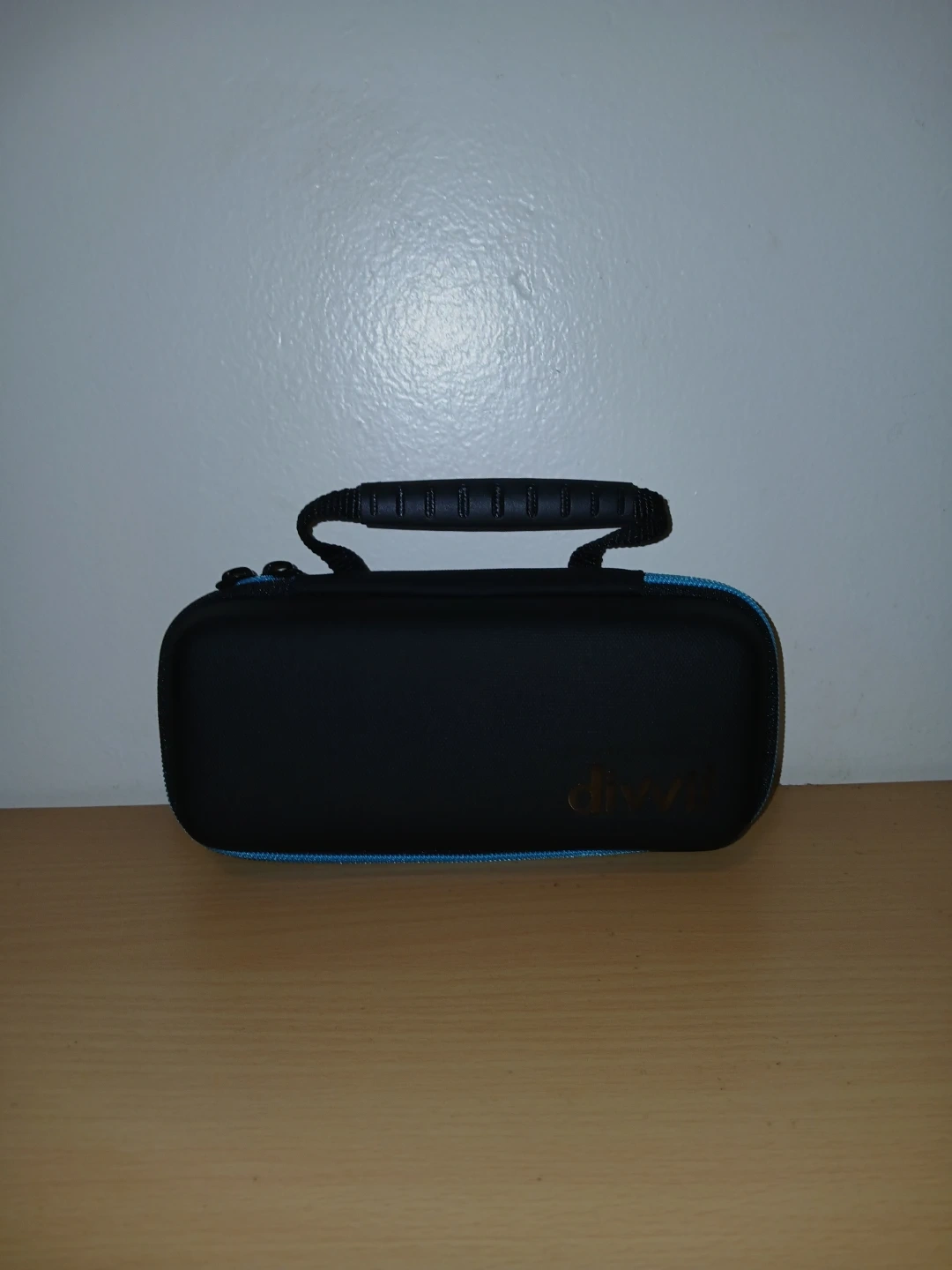 I'm selling a Divvi! carrying case. It's black with a blue zipper and has a handle for easy carrying. The inside is lined with a mesh pocket and an elastic strap to hold items in place