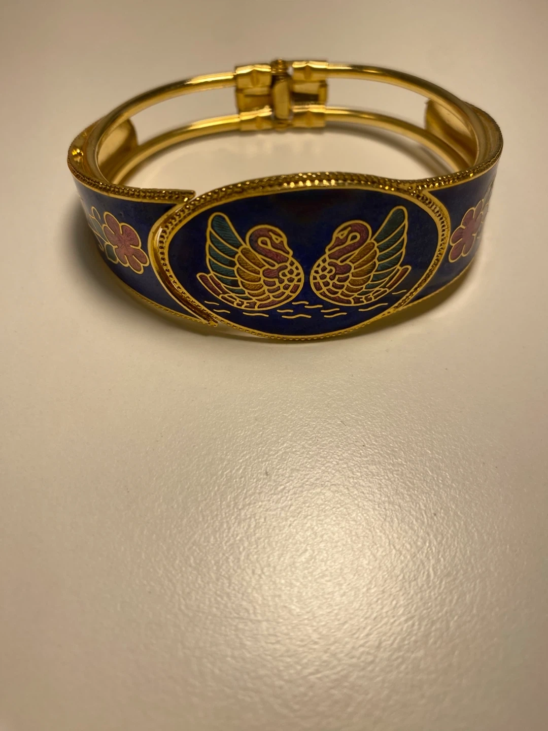 Selling a lovely cloisonné bangle bracelet! It features a beautiful swan design with floral accents on a dark blue background. The bracelet has a gold-tone finish and a hinged closure. Perfect for adding a touch of elegance to any outfit!