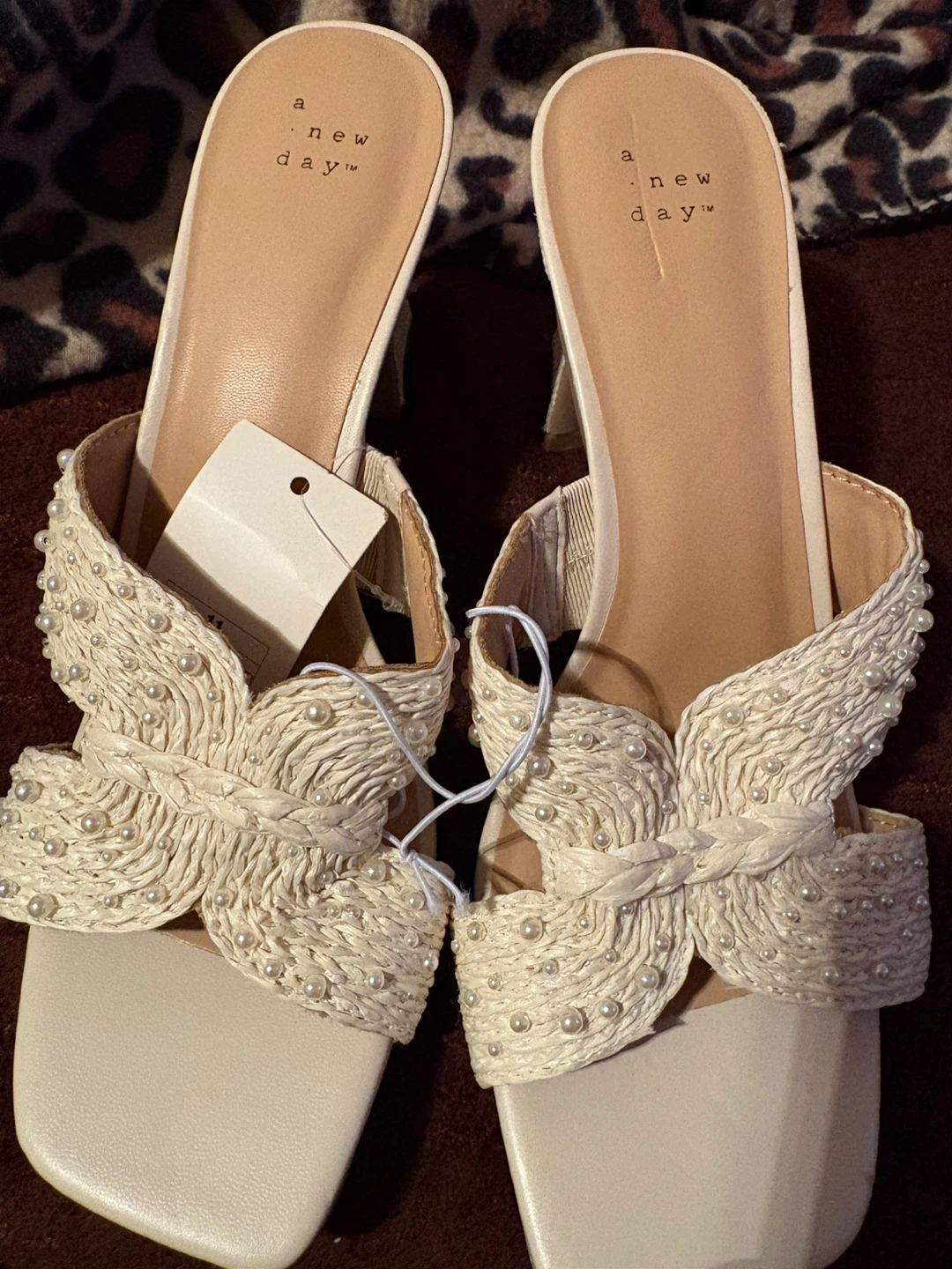 These are a pair of A New Day sandals in a size 11. They feature a cream color and a unique design with pearl embellishments. Perfect for adding a touch of elegance to your outfit!