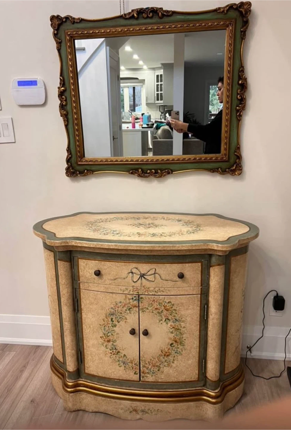 Selling a lovely painted accent cabinet with a matching mirror. It's in great shape and would add a touch of elegance to any room!
