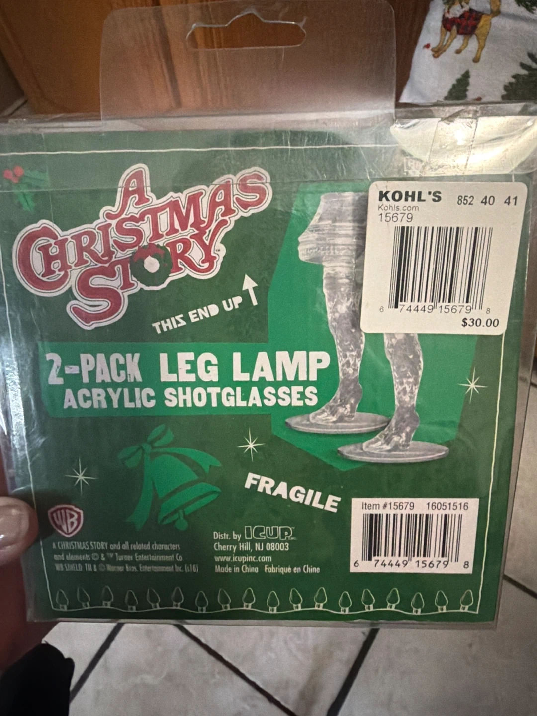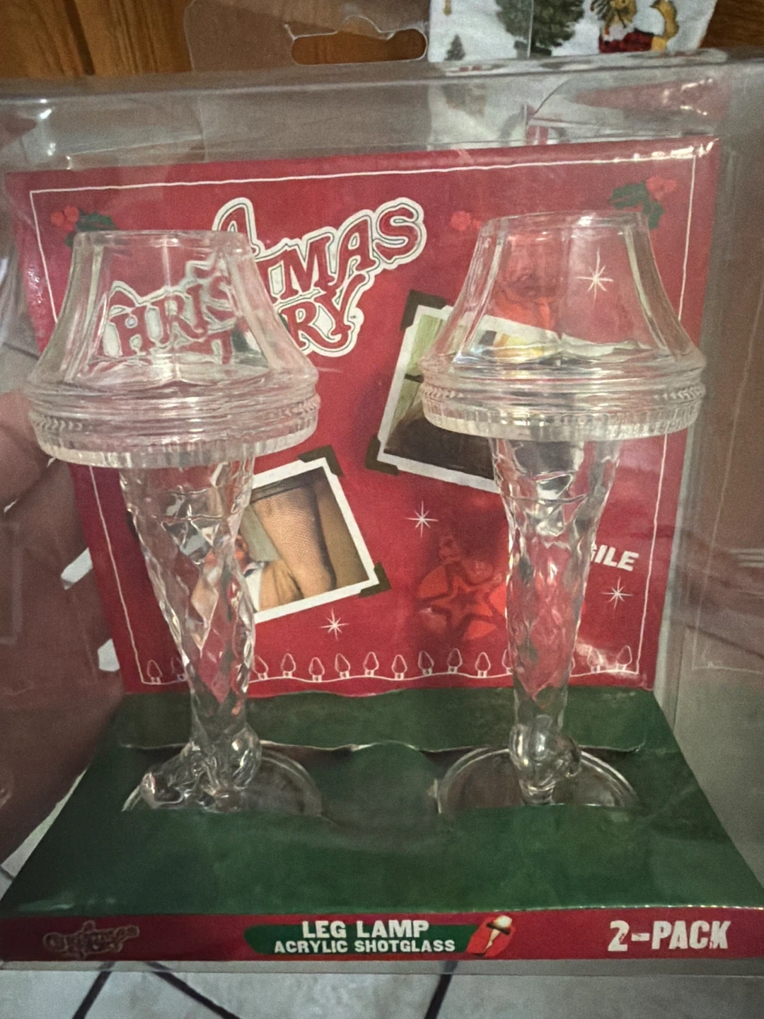 Selling a 2-pack of A Christmas Story leg lamp acrylic shot glasses! They come in the original box. These shot glasses are a fun addition to any party or a great gift for fans of the movie. Originally bought for $30