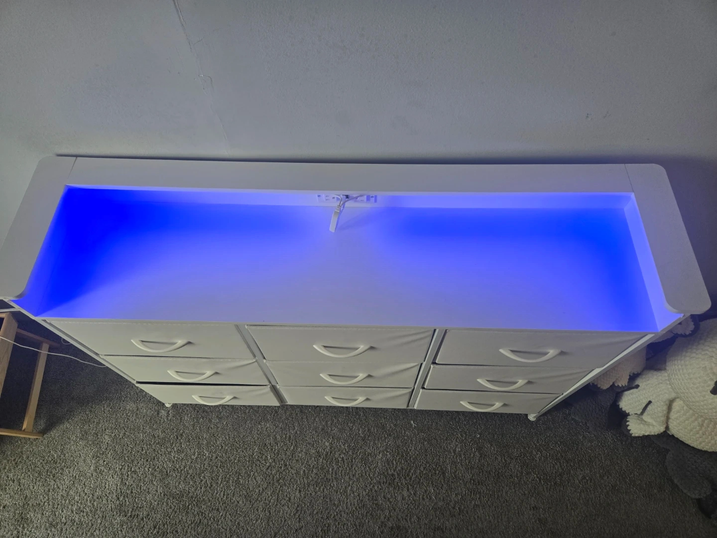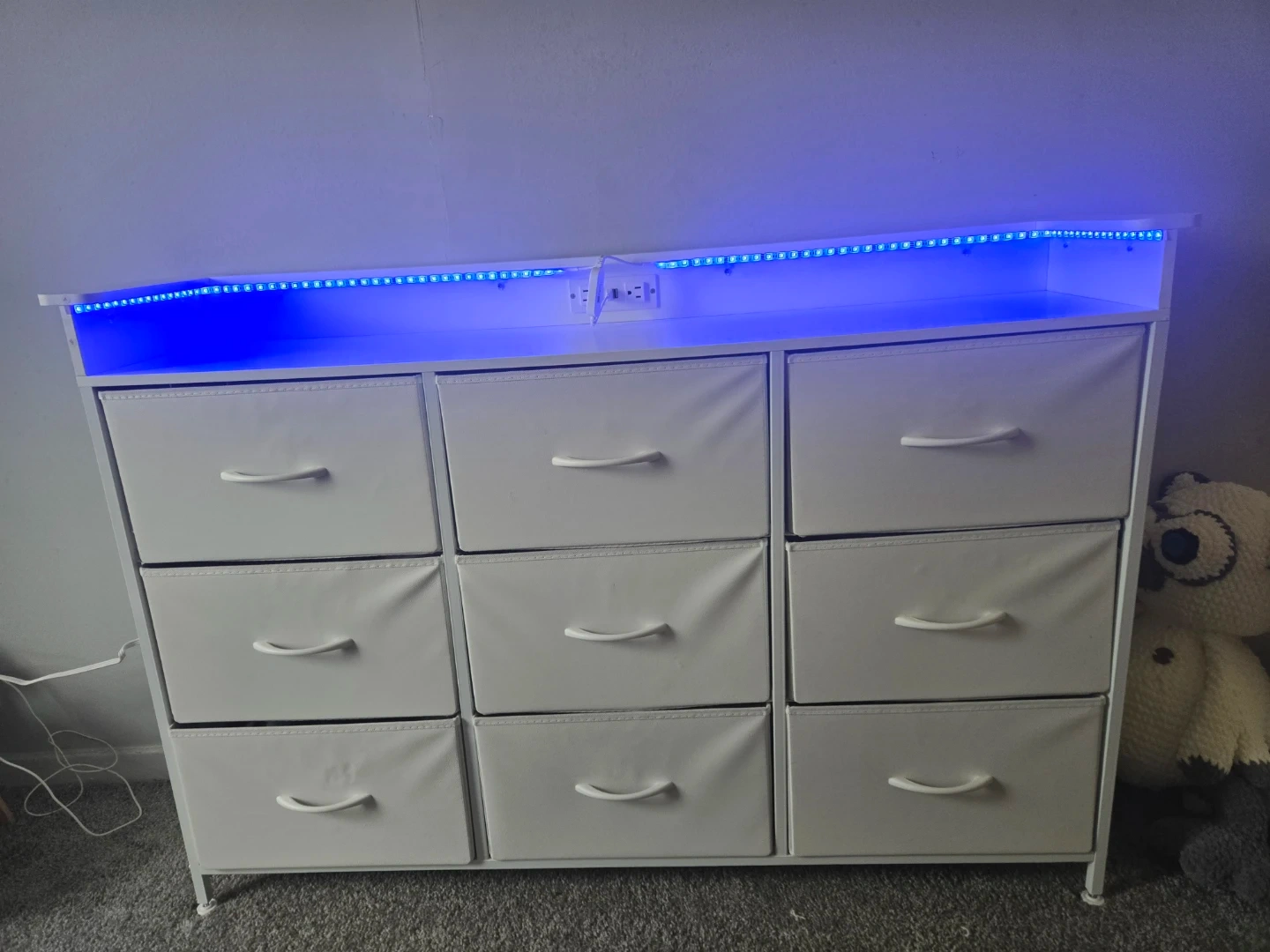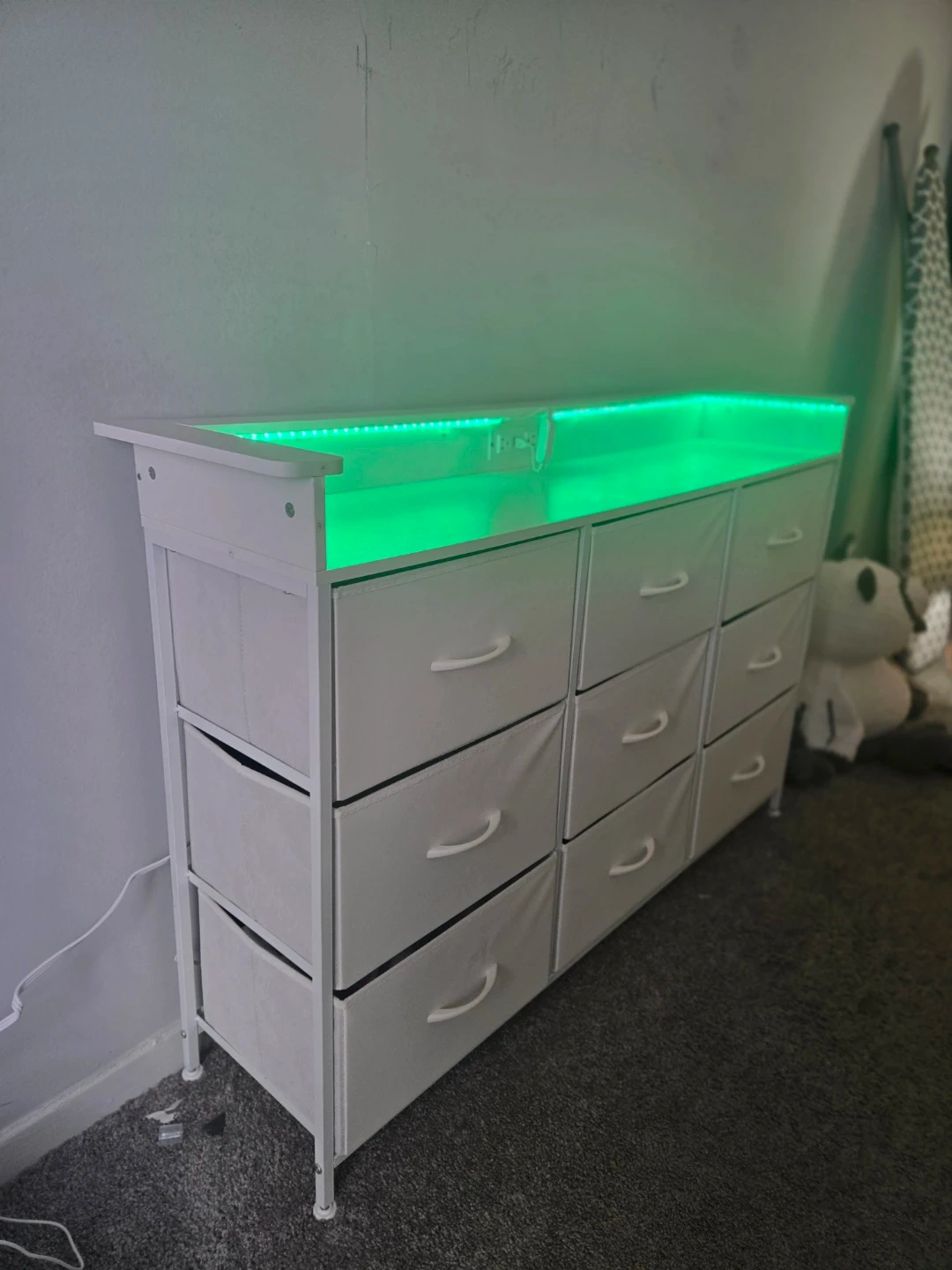 Here's a white dresser with nine drawers! It has LED lighting installed on top, which can be changed to different colors. It's a great piece for adding some extra storage and a bit of fun to any room