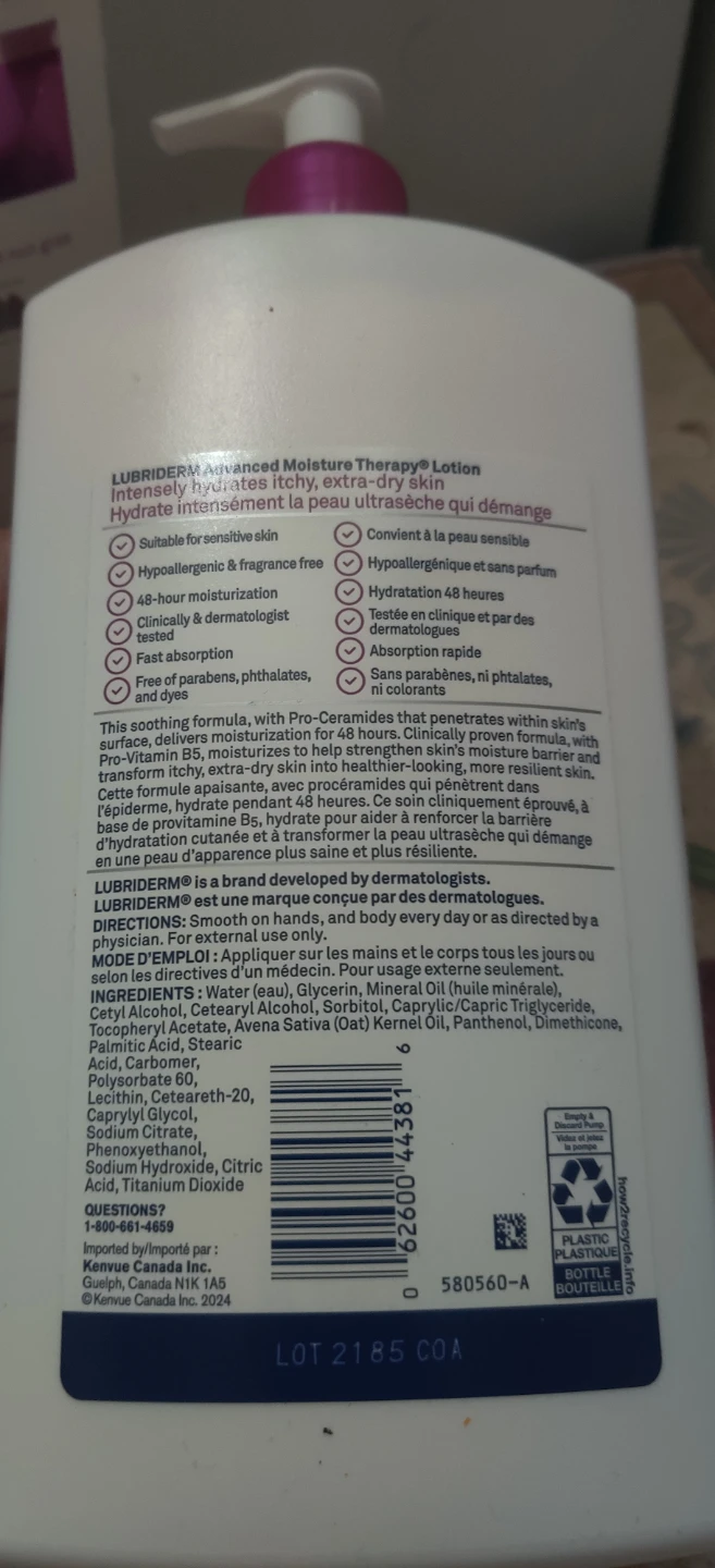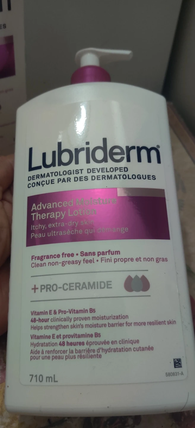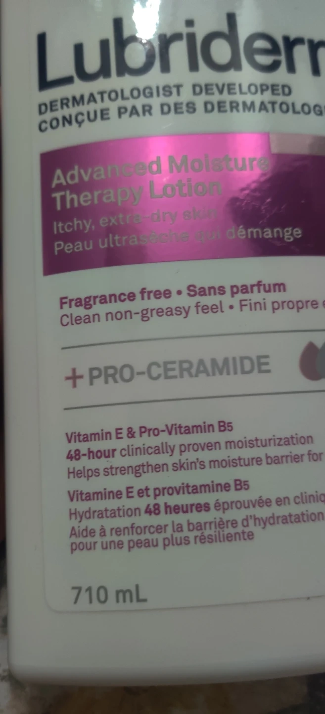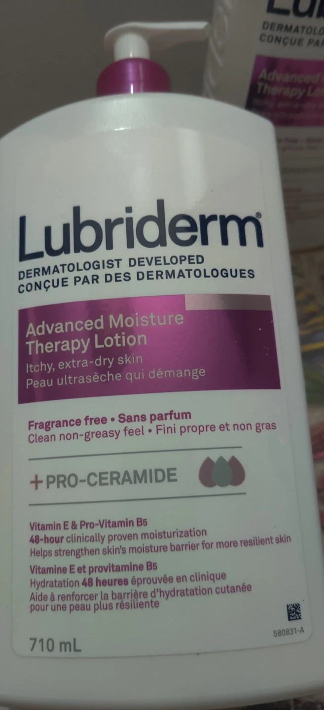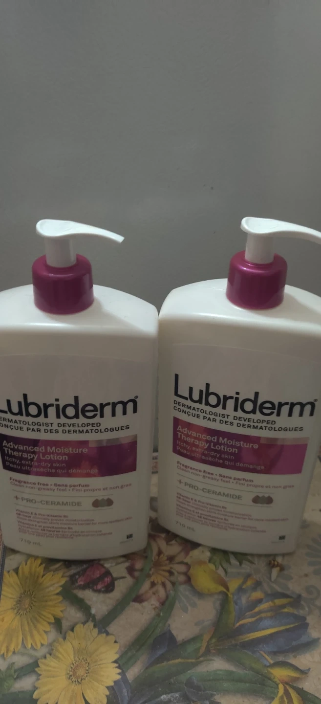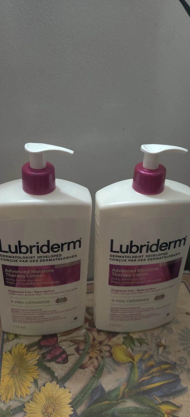 Selling 2 bottles of Lubriderm Advanced Moisture Therapy Lotion. Each bottle is a 710 mL bottle of fragrance-free lotion with Pro-Ceramide. It provides 48-hour clinically proven moisturization and helps strengthen your skin's moisture barrier