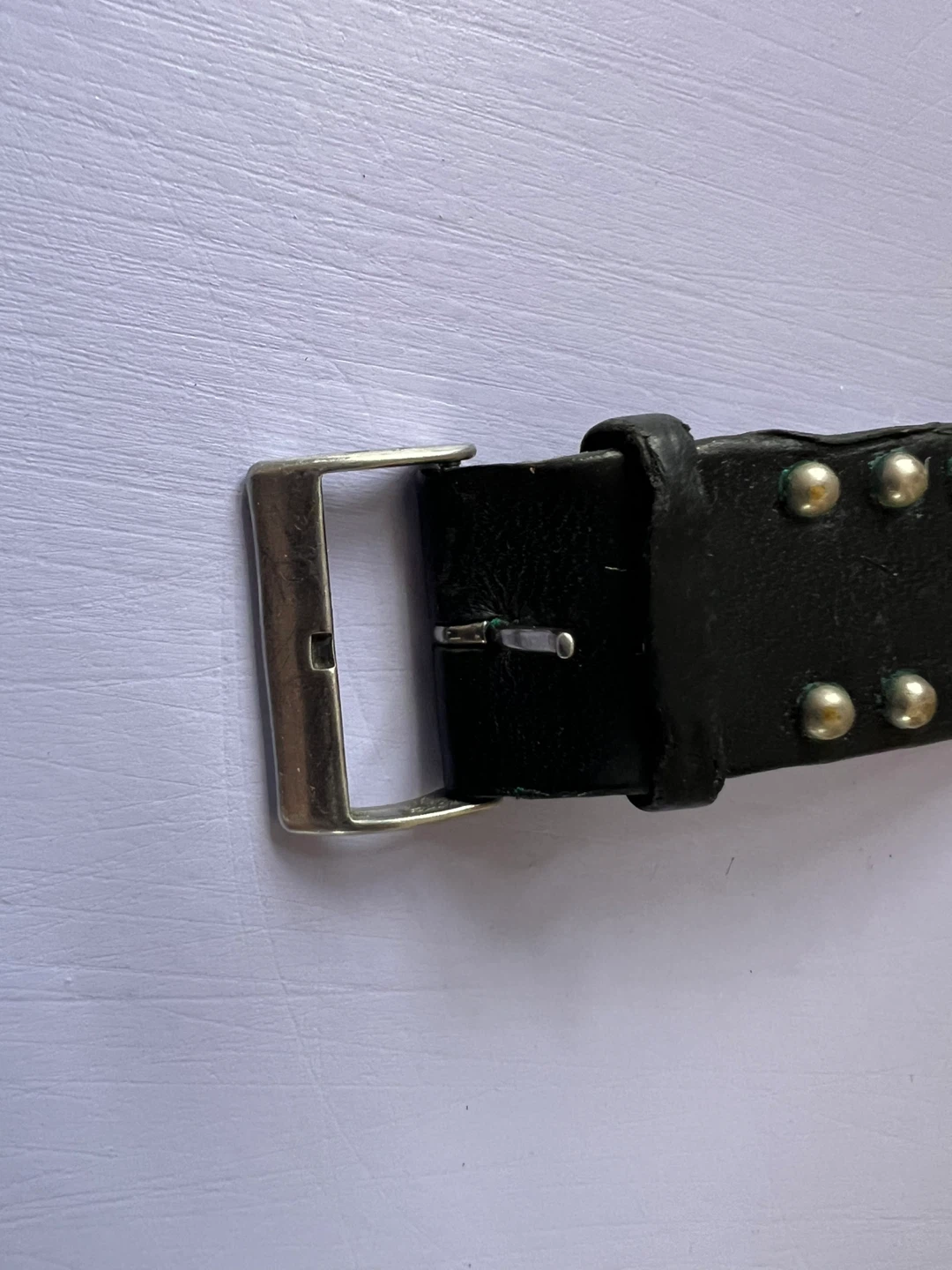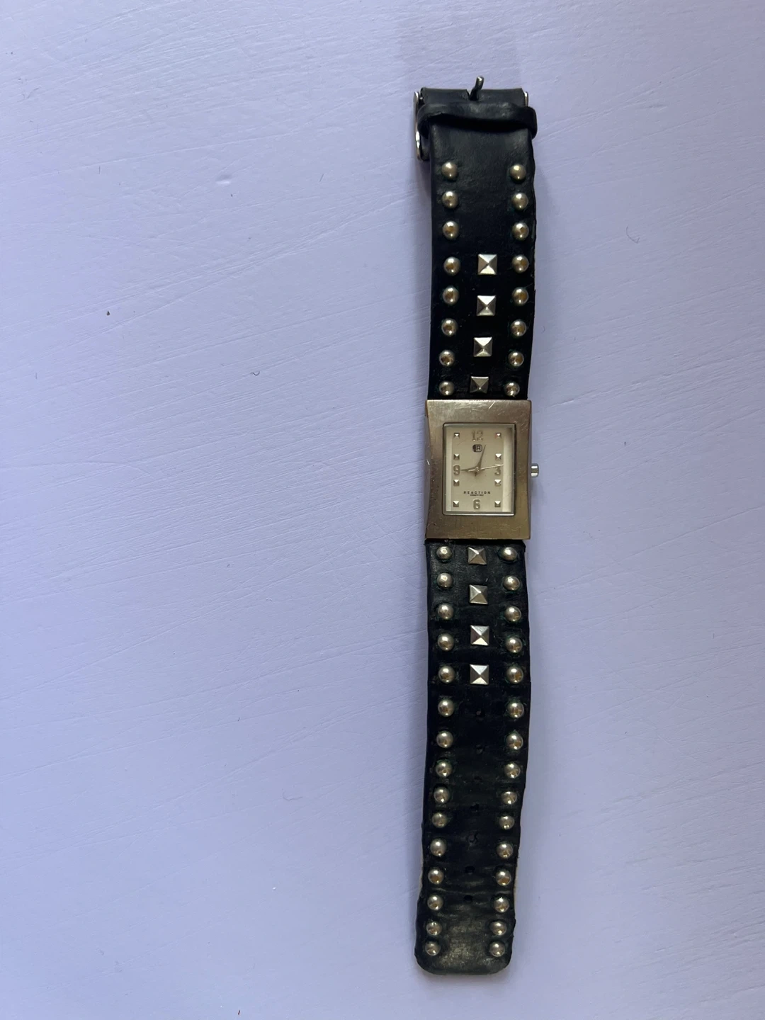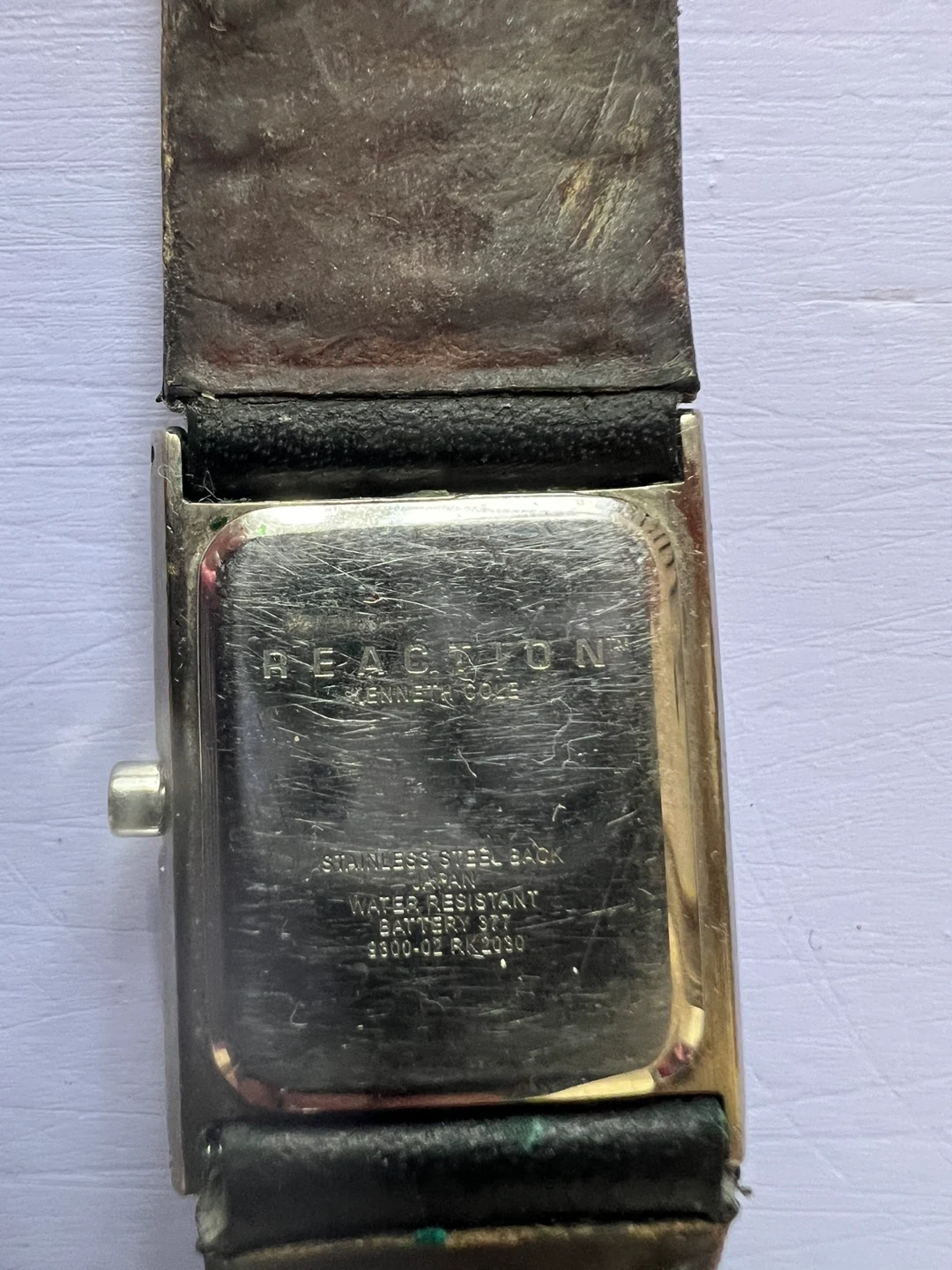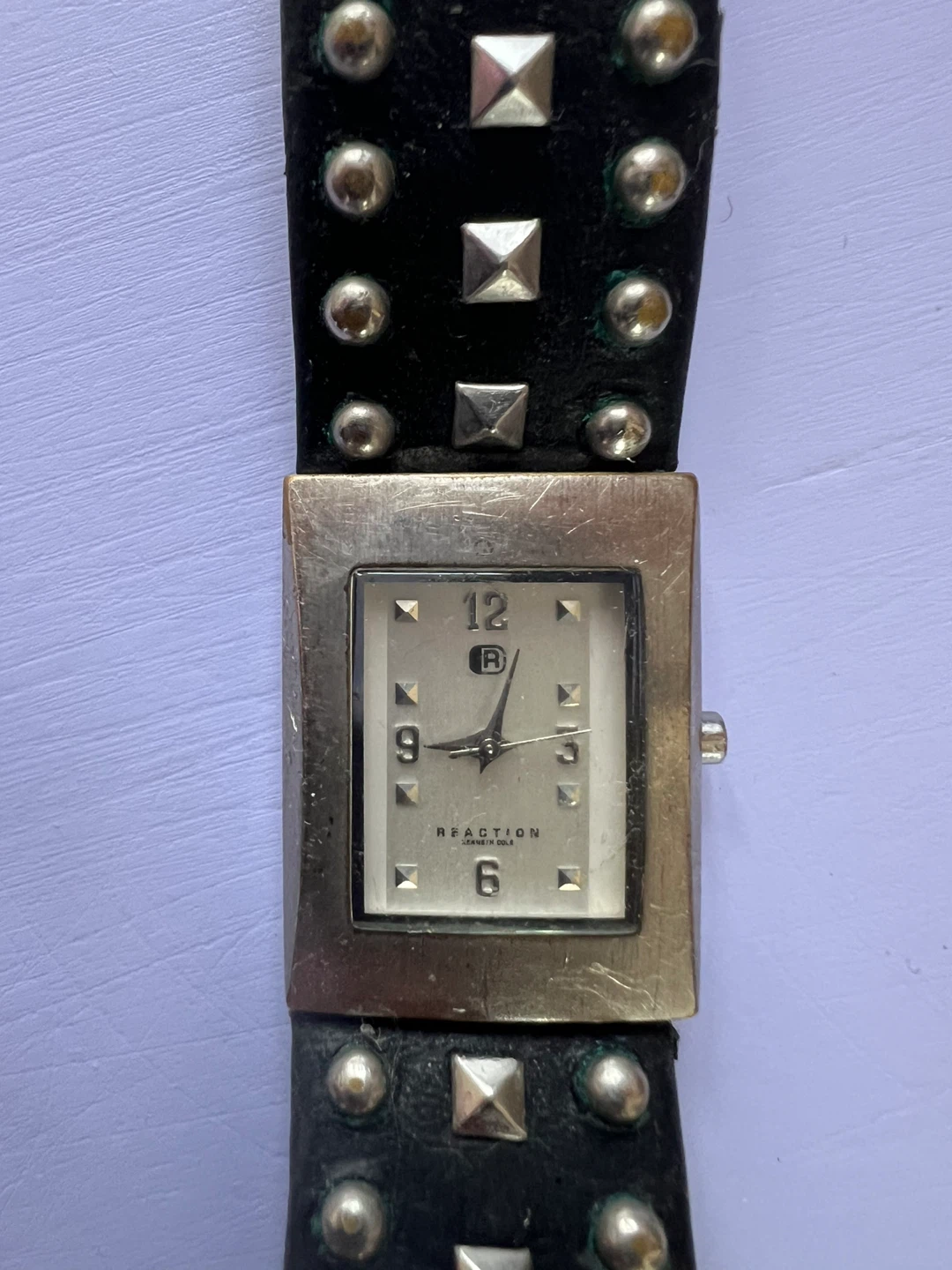 Selling a Reaction Kenneth Cole watch with a studded black leather band. The watch has a silver-tone square face and a stainless steel back. It shows some signs of wear, but still looks great!