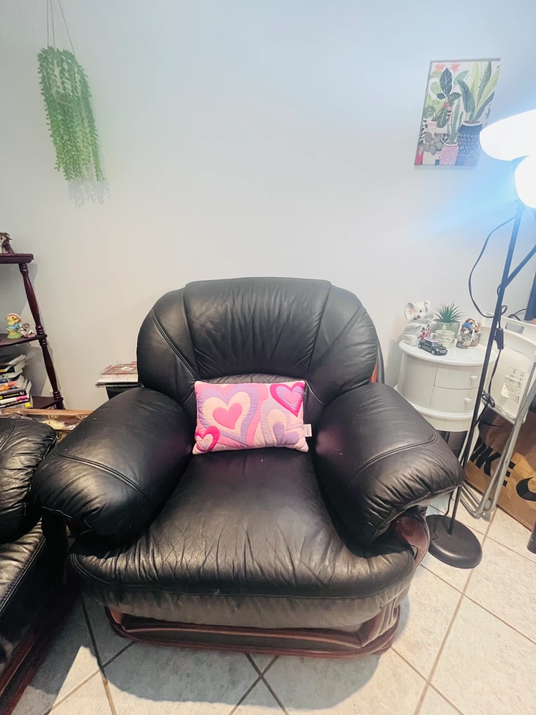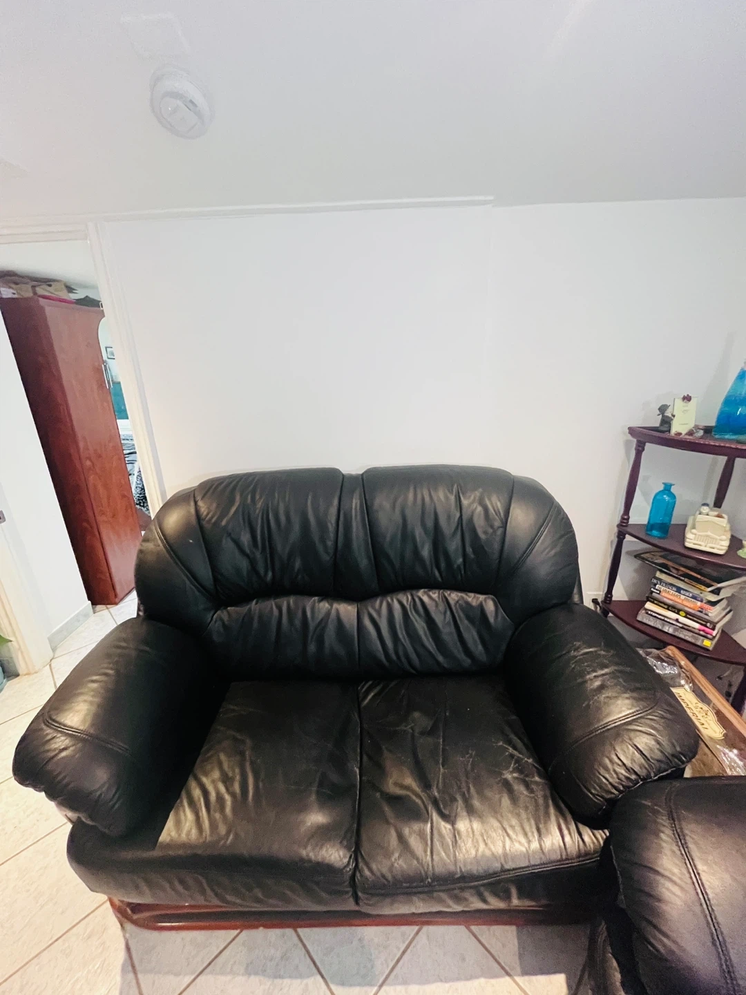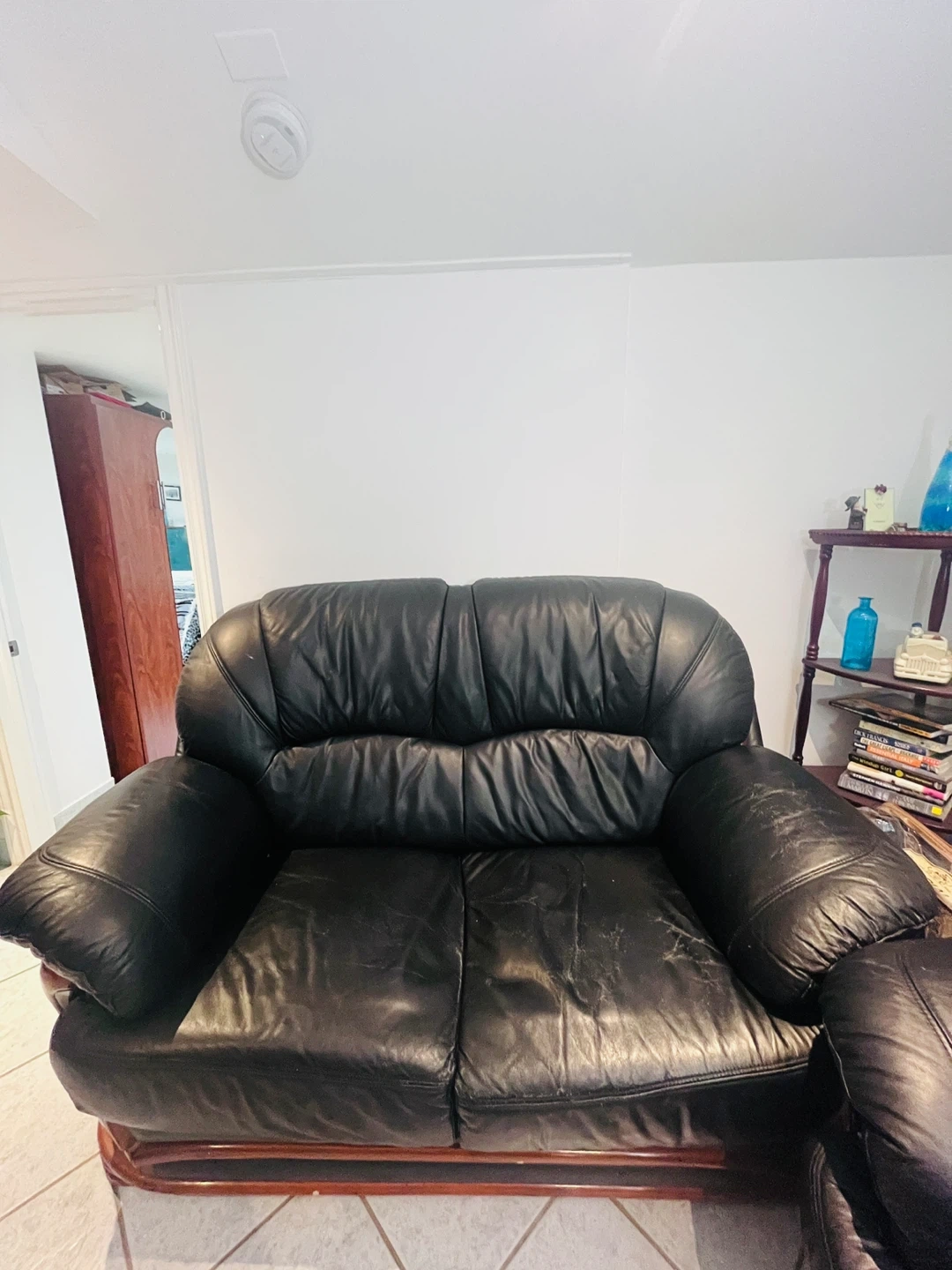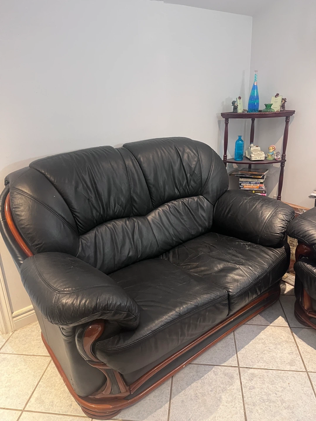 Selling a black leather sofa and matching armchair. Shows normal wear from use, but still comfortable and fully functional.