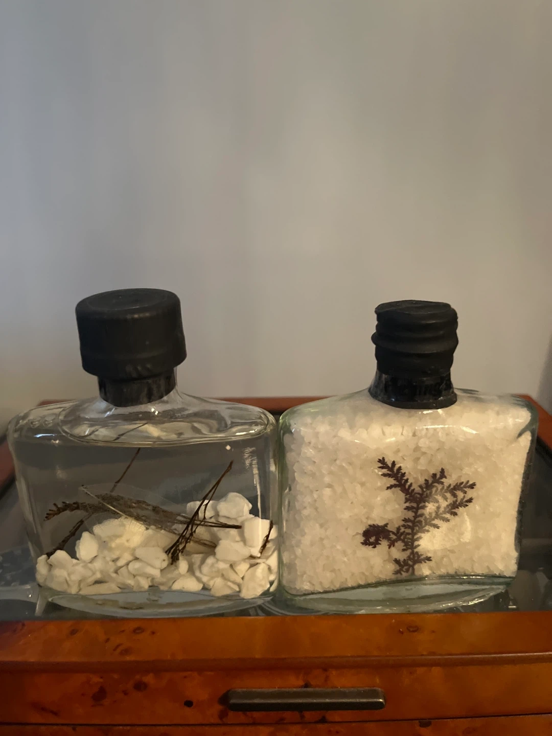 Two decorative glass bottles filled with natural elements. One has white stones and twigs, and the other contains white crystals and a botanical sprig. They would make a nice addition to your home decor!