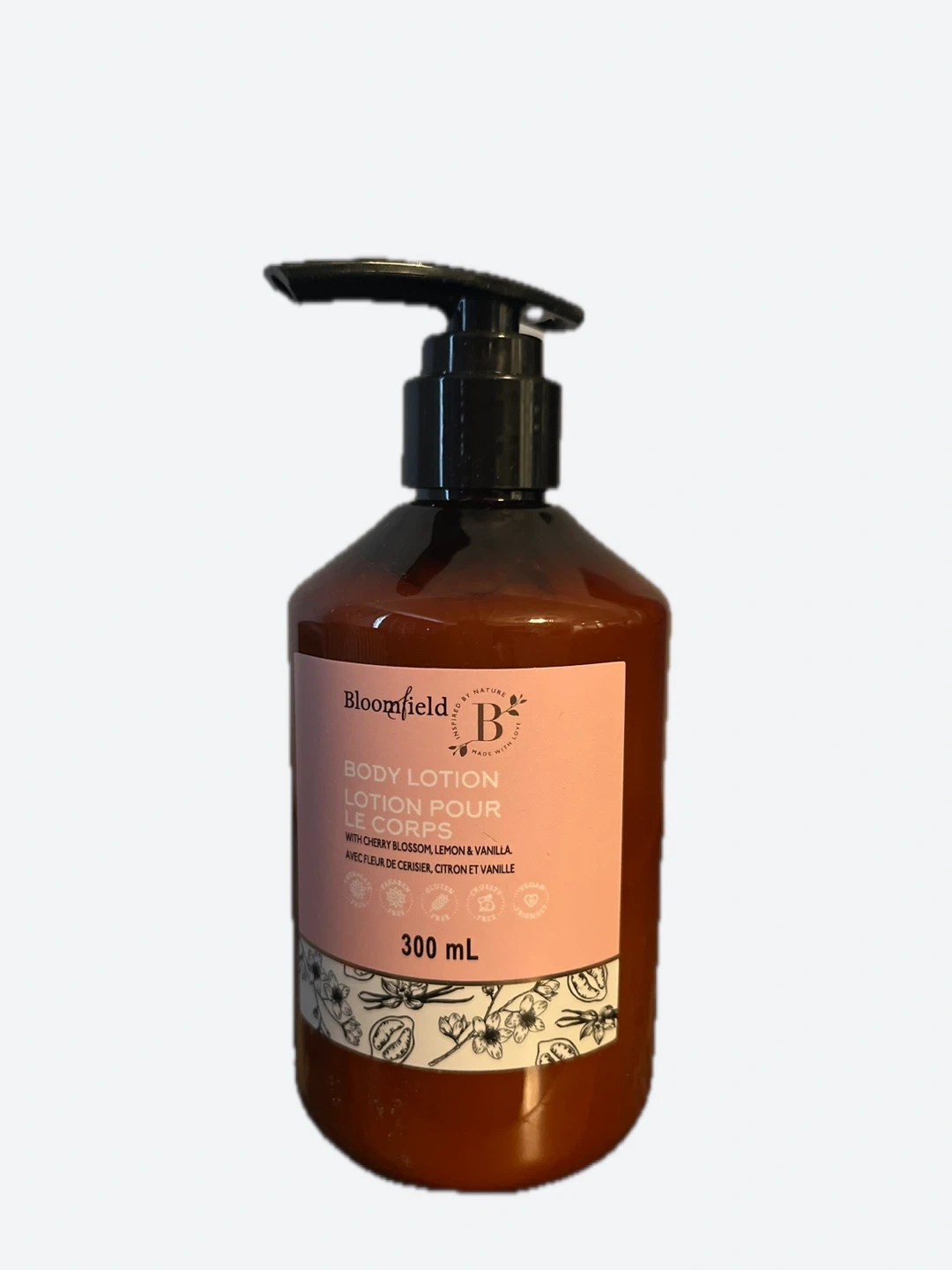 I'm selling a bottle of Bloomfield Body Lotion! It's a lotion pour le corps with cherry blossom, lemon, and vanilla. The bottle contains 300 mL of lotion