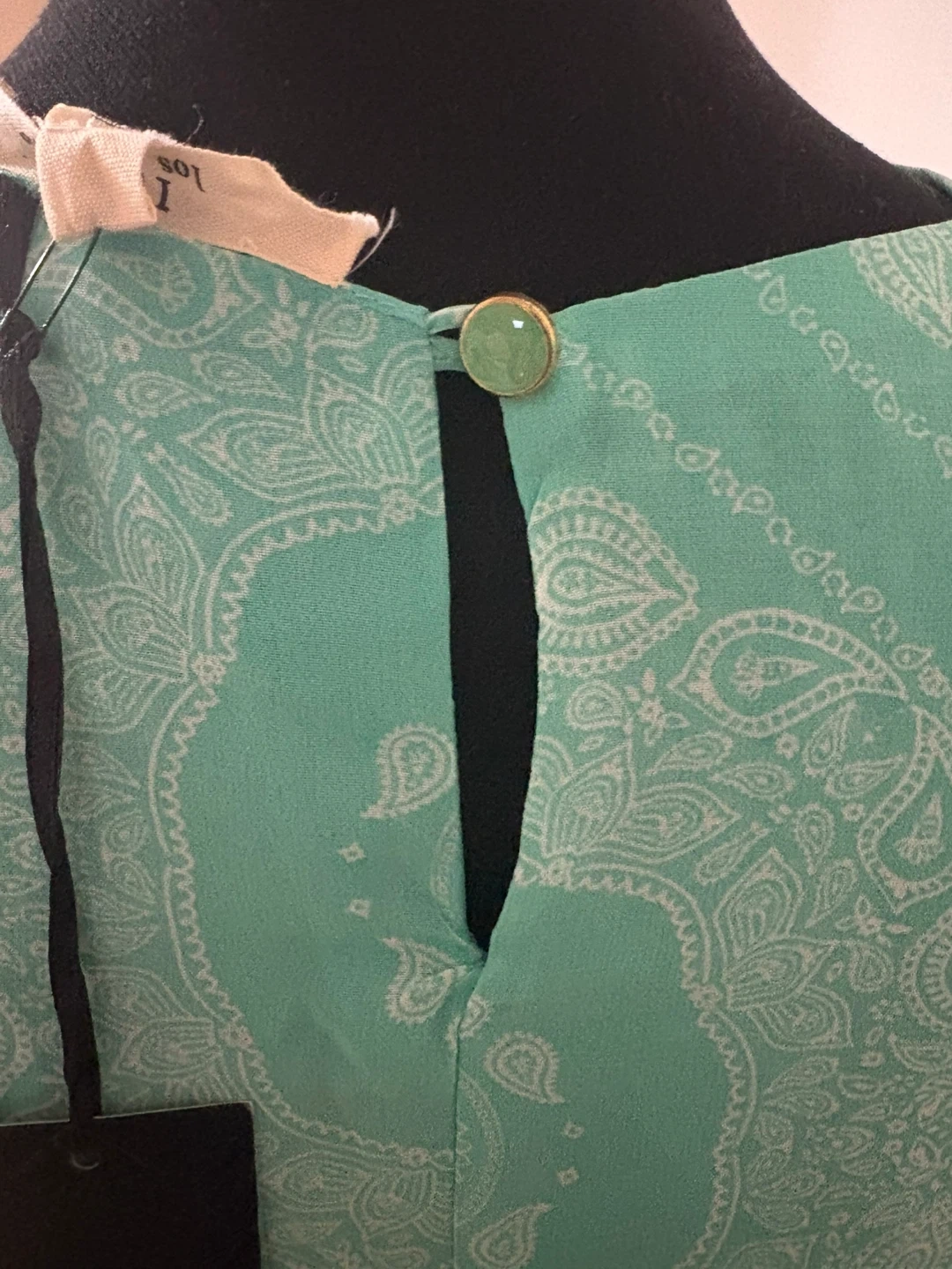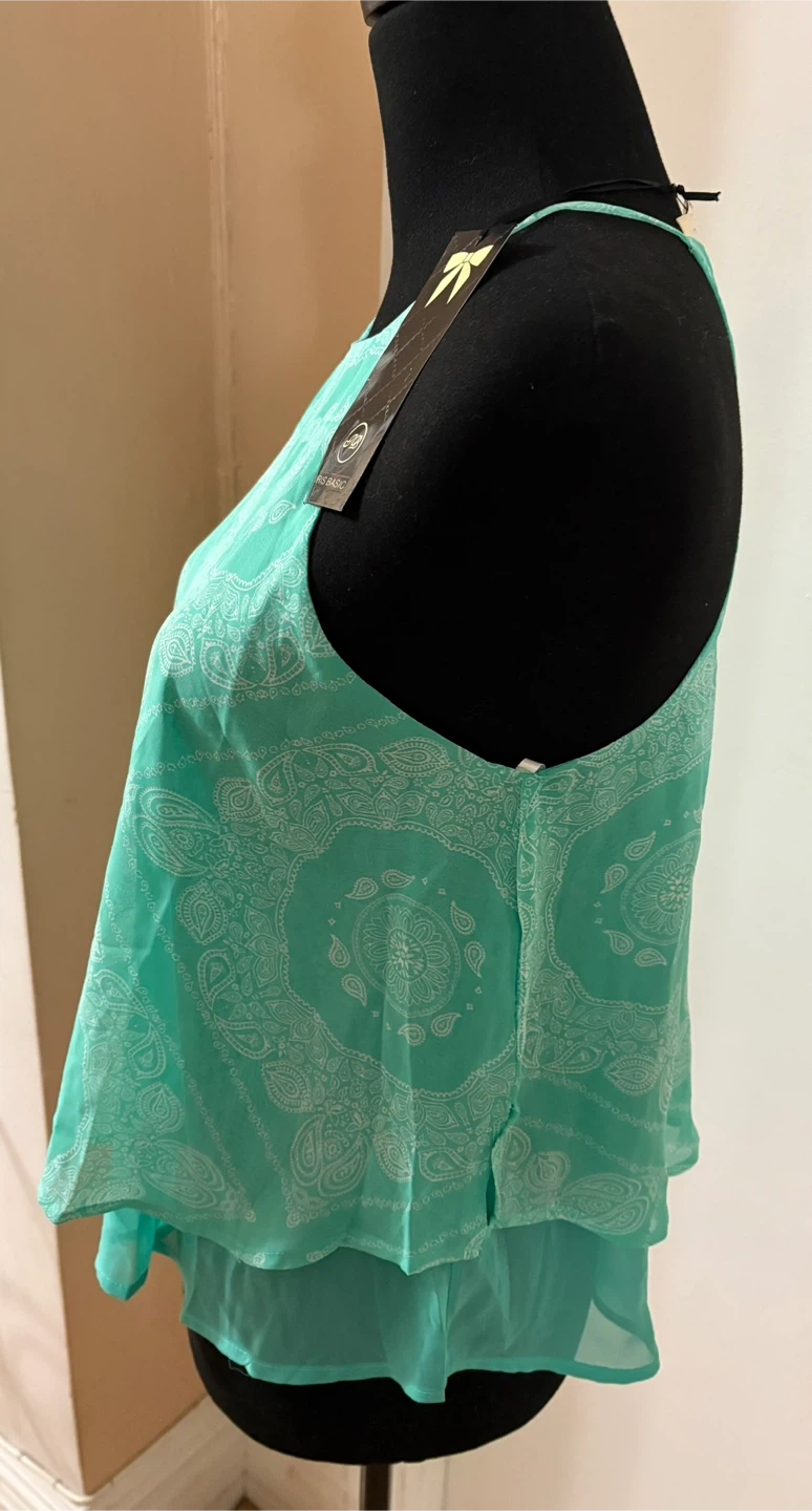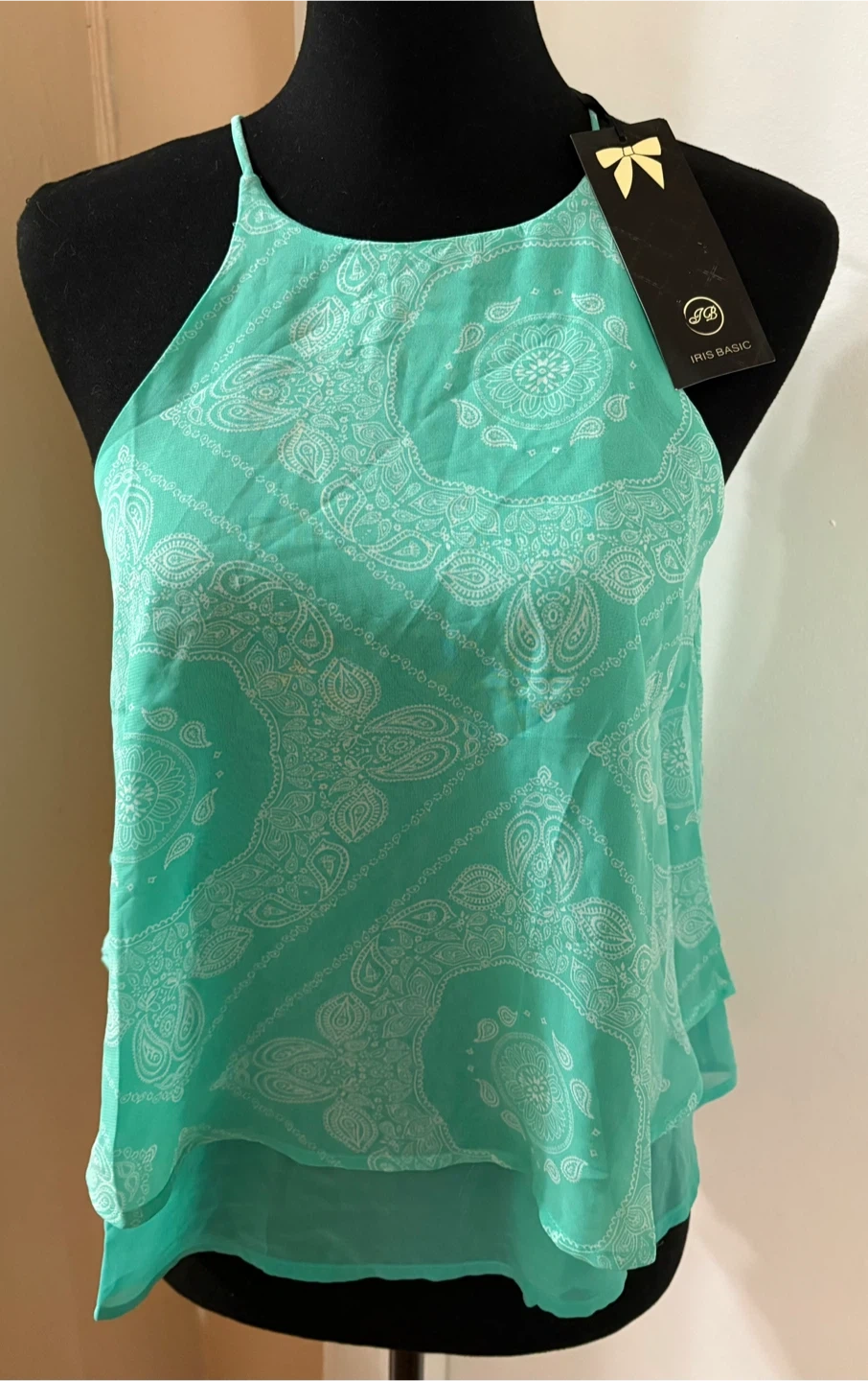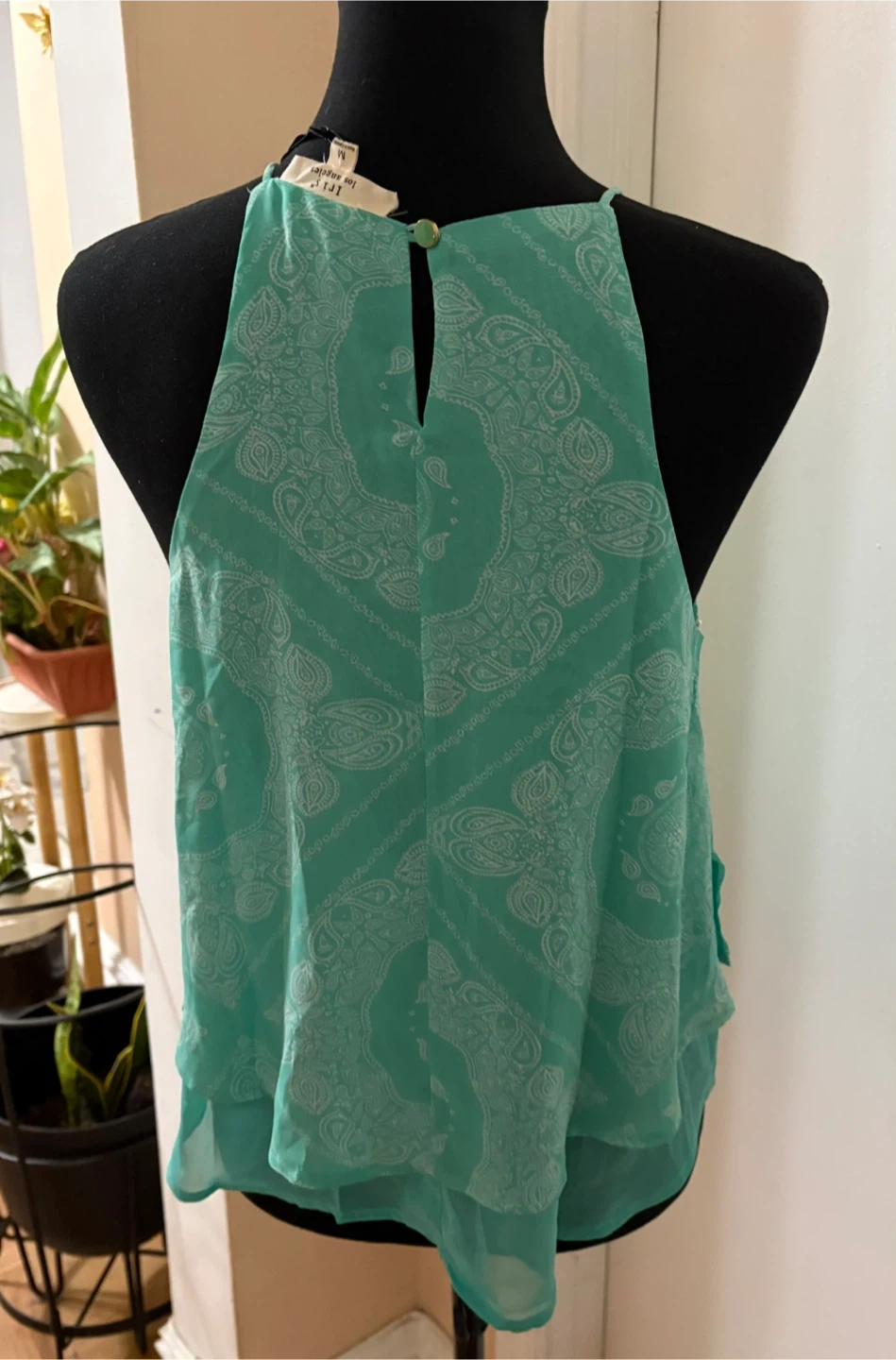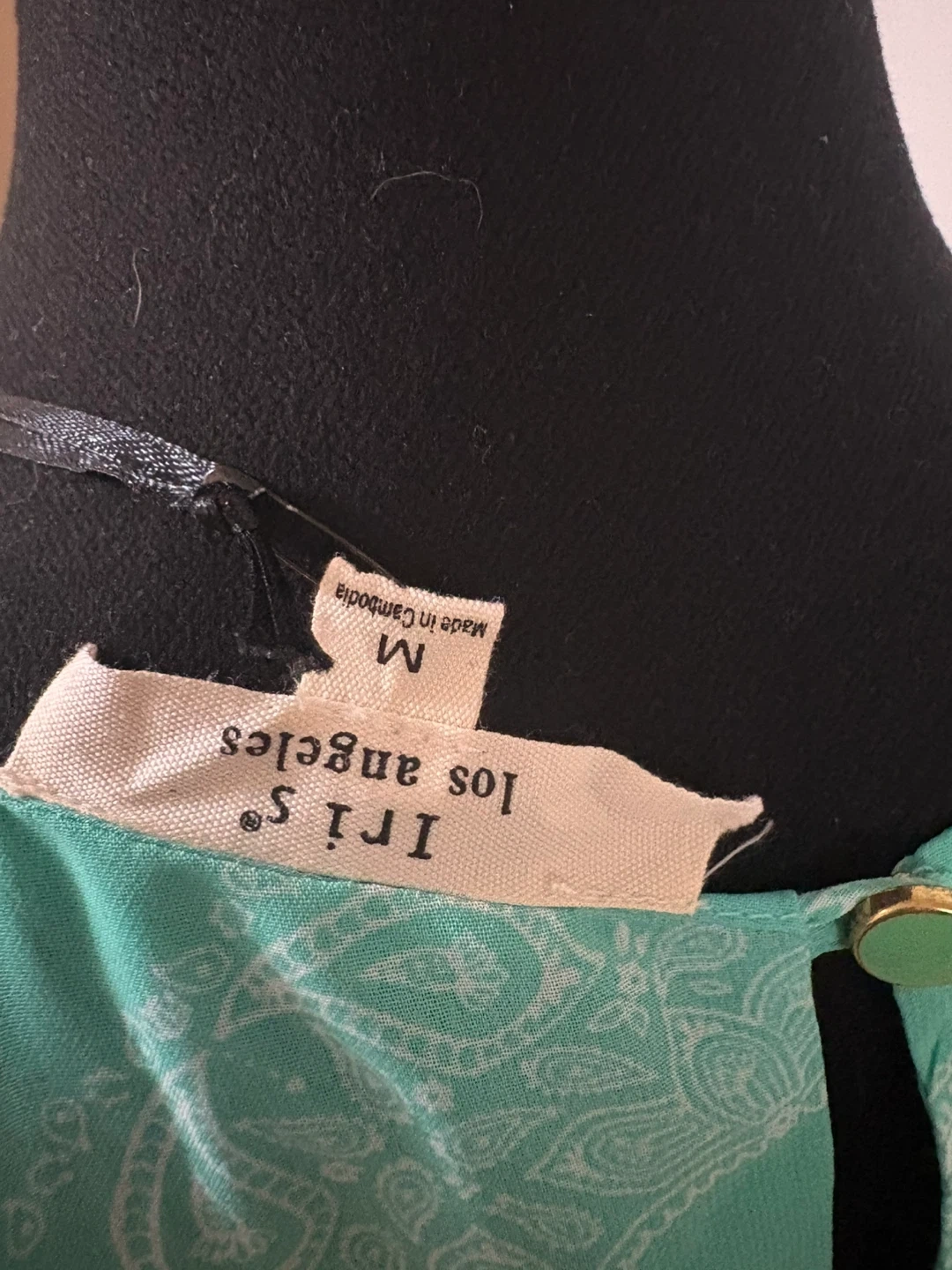 This is an Iris Los Angeles halter top in a size medium. It's a beautiful light green color with a white paisley pattern. Perfect for a casual day out!